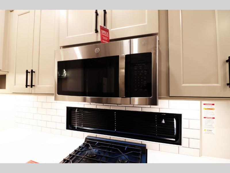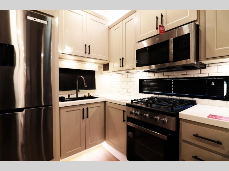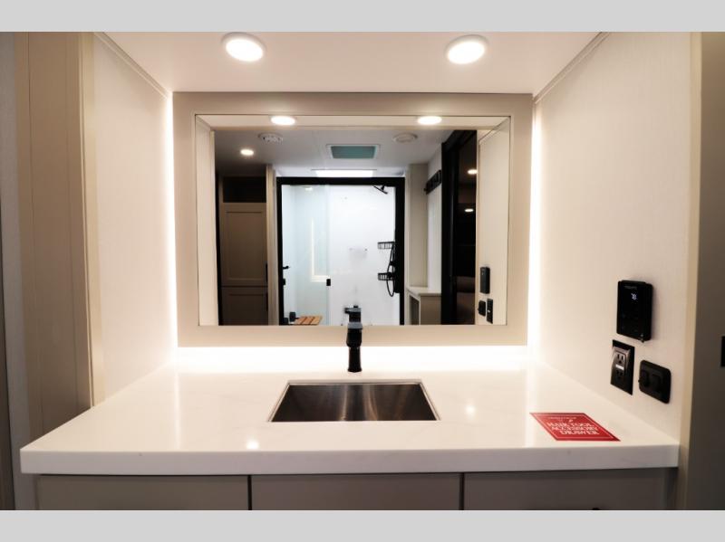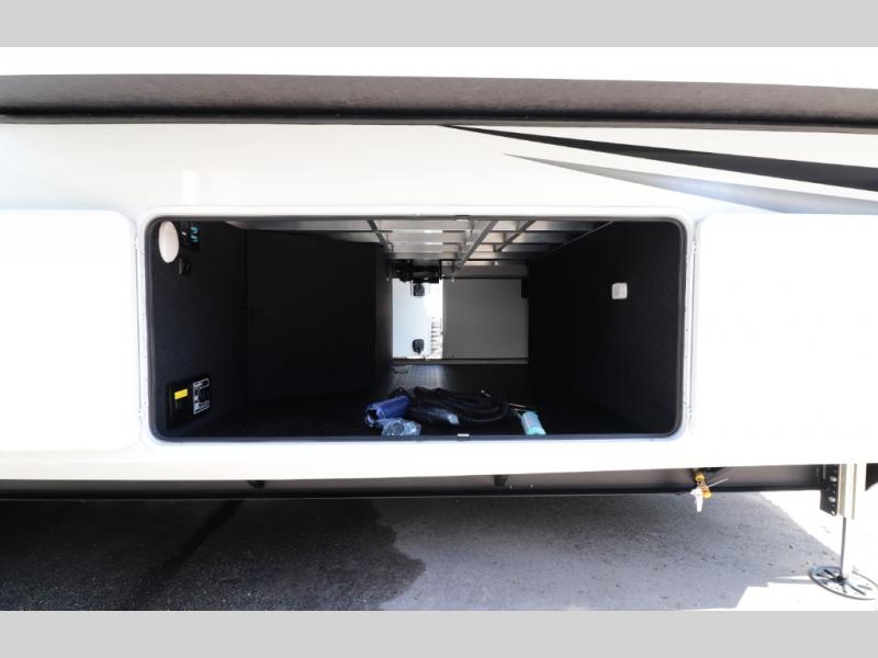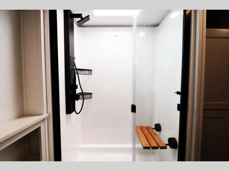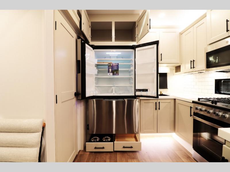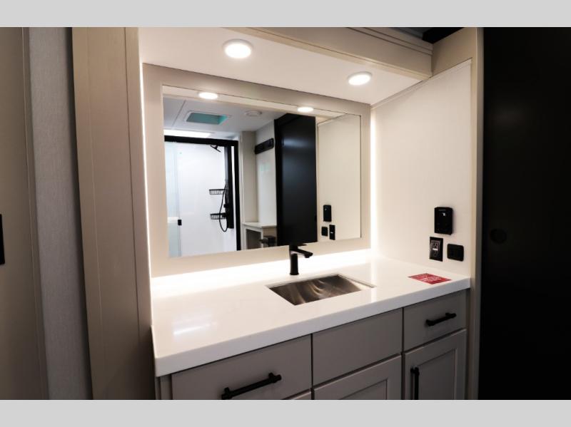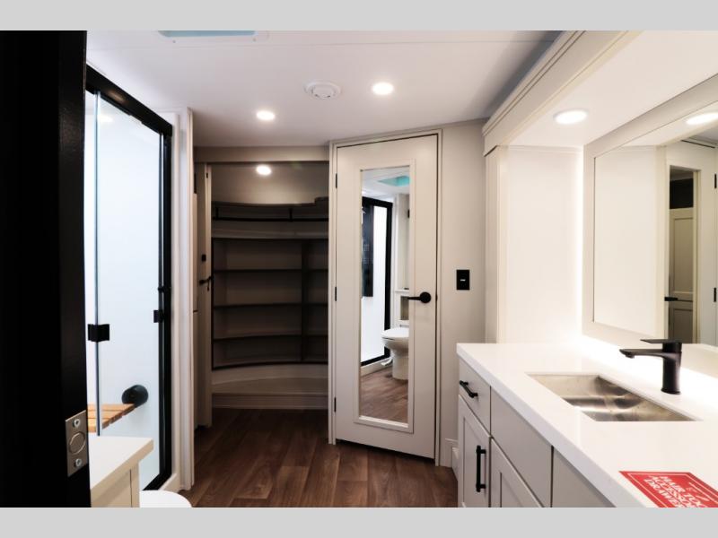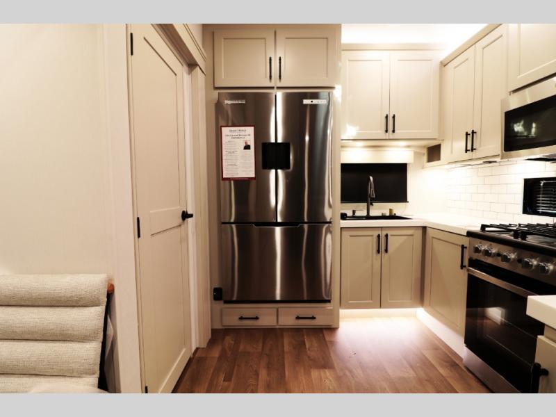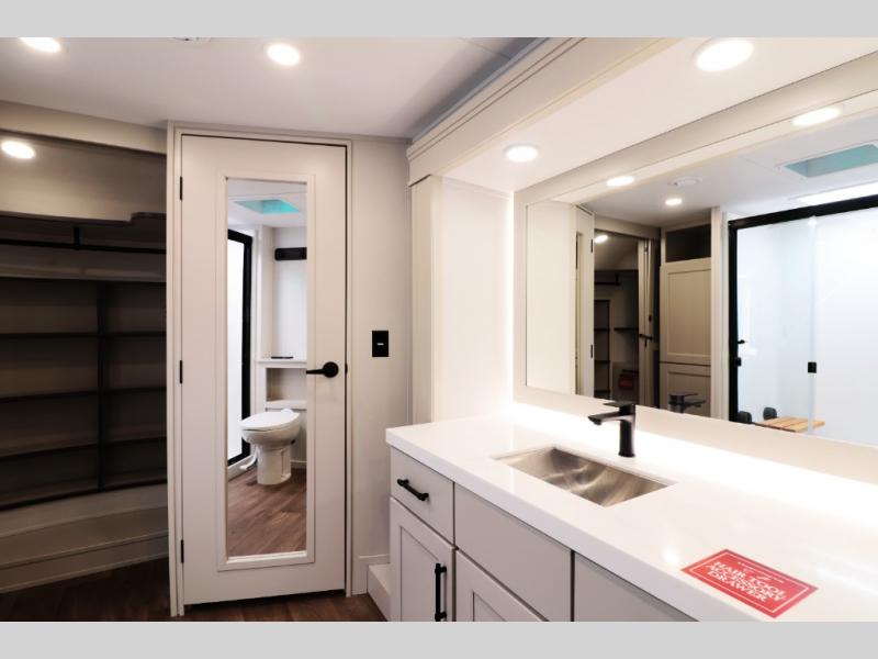 All-Season Ready (Weather-Tek Package): Heavy-duty 8,000 lb axles, fully enclosed and heated underbelly with heated tanks/storage, 35,000 BTU high-capacity furnace, tankless on-demand water heater, and dual-pane frameless tinted windows make this 417KB suitable for year-round RV living — even in colder climates or off-season travel.