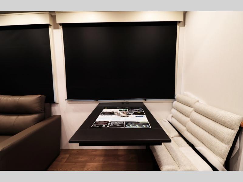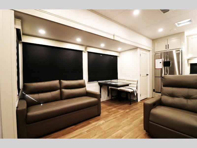 Comfortable Living Space: Theater seating, dual tri-fold sofas, a free-standing dinette, and an LED Smart TV with fireplace bring the comforts of home.