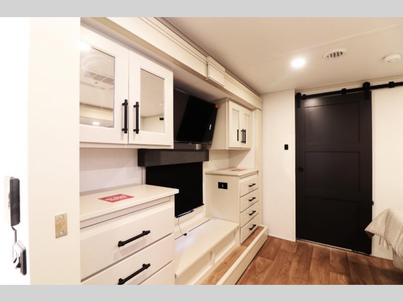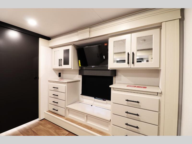 Master Suite with King Bed Option: The master bedroom includes a queen bed slide-out (king optional), dual dressers with a seating center, and abundant storage — or upgrade to a king bed for even more sleeping comfort.