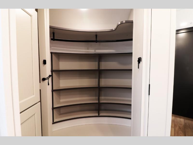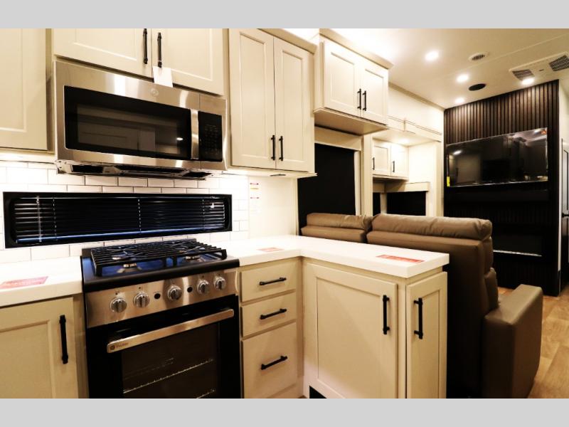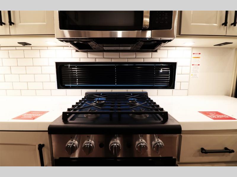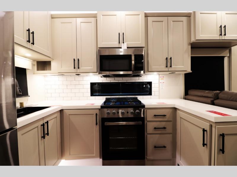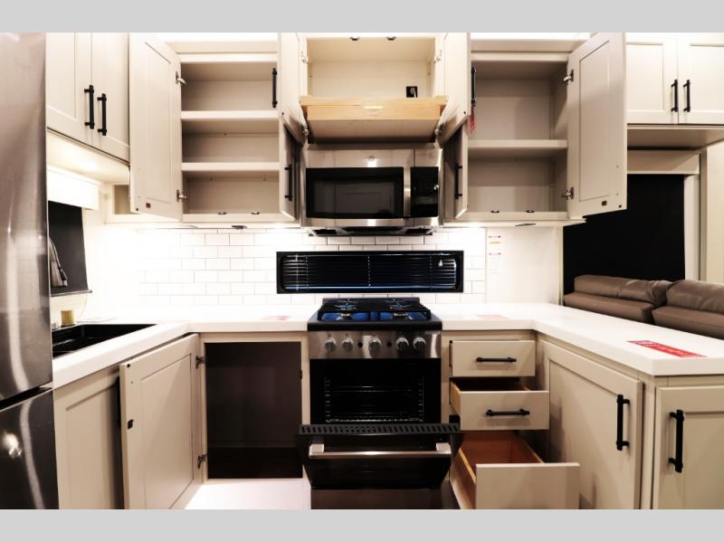 Residential-Style Rear Kitchen: Rear kitchen features wrap-around counter space, solid-surface countertops, a 20 cu. ft. 12 V refrigerator, 4-burner cooktop, built-in oven, and a large pantry — ideal for cooking real meals, not just camp food.