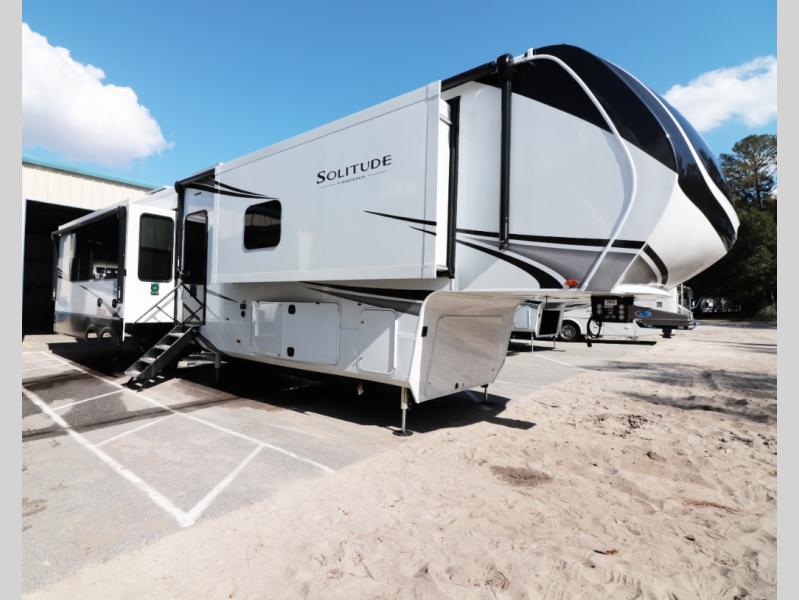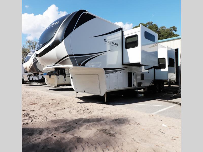 Luxury meets space with the 2026 Solitude 417KB—rear chef’s kitchen, bath-and-a-half, king suite, dual A/C, all-season insulation, and premium towing stability.
