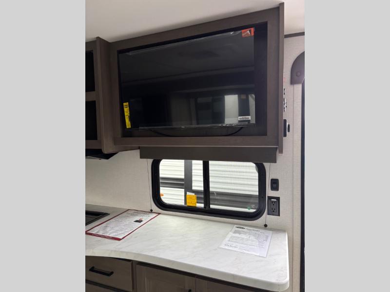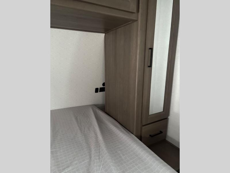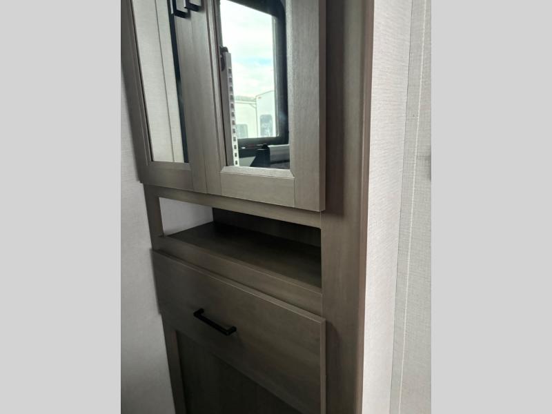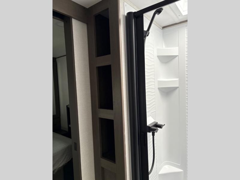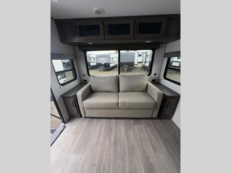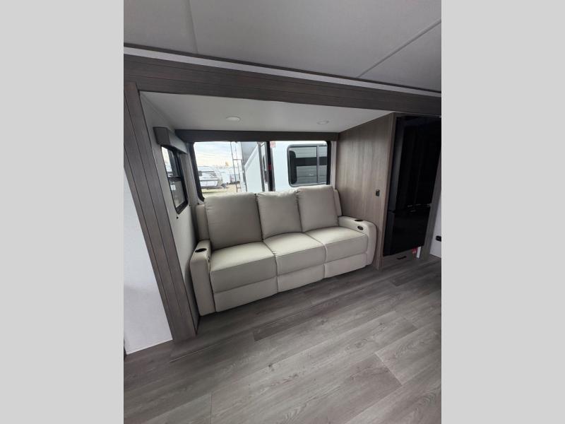 the amount of interior space you have in the living area thanks to the U-shaped dinette slide, which can be switched out for optional theater seats. The rear 70" sleeper sofa will be perfect for guests to sleep on, and the 32" TV lets you enjoy movie nights. There is a three burner range and convection microwave/combo air fryer to cook meals inside, or you can cook on the exterior griddle with a 1.7 cu. ft. refrigerator. And the 17' power awning will provide much wanted shade as you visit with friends. Back inside, the walk-thru bath is both spacious and convenient since it can be accessed from the main living area and the front master bedroom. Here, you'll find a queen bed, storage space, plus TV prep if you want to add a television. You even have your own exterior entry door for convenience!