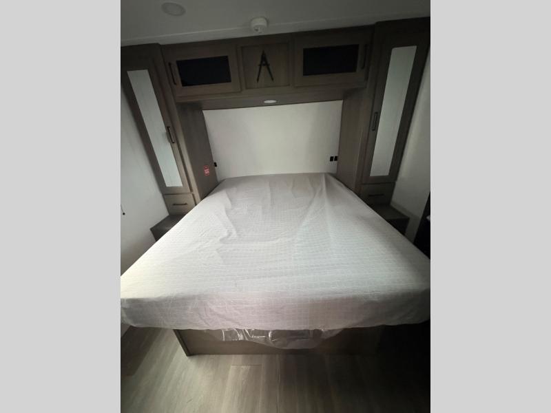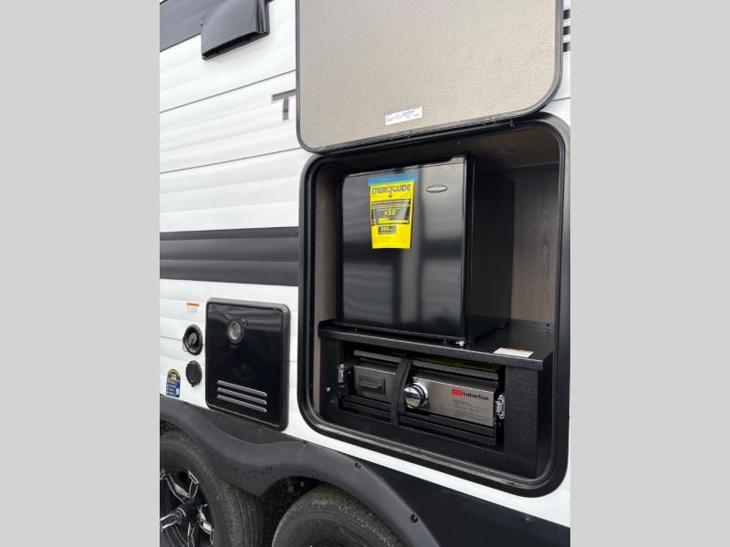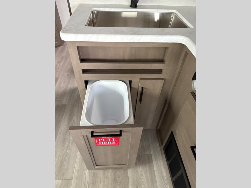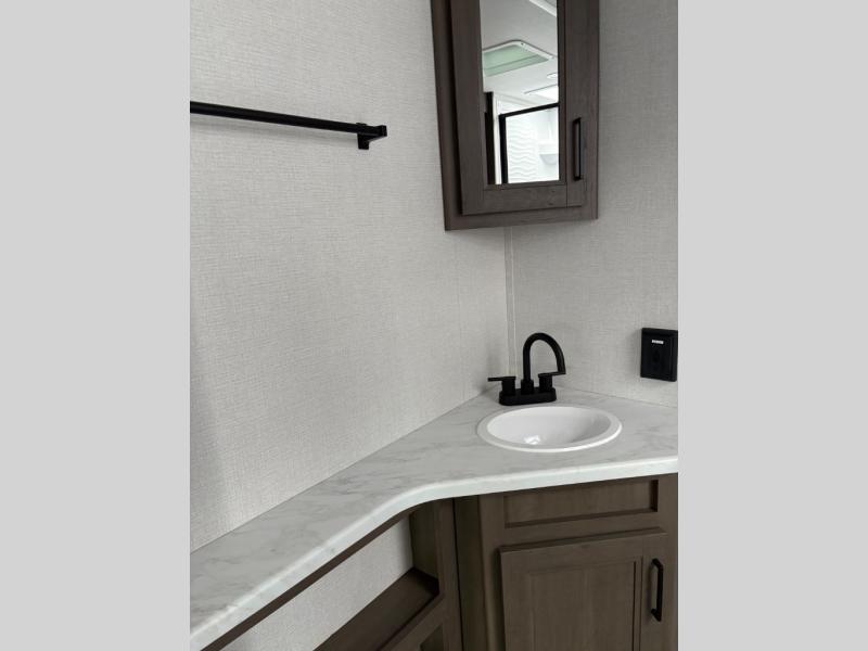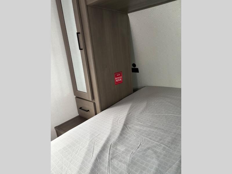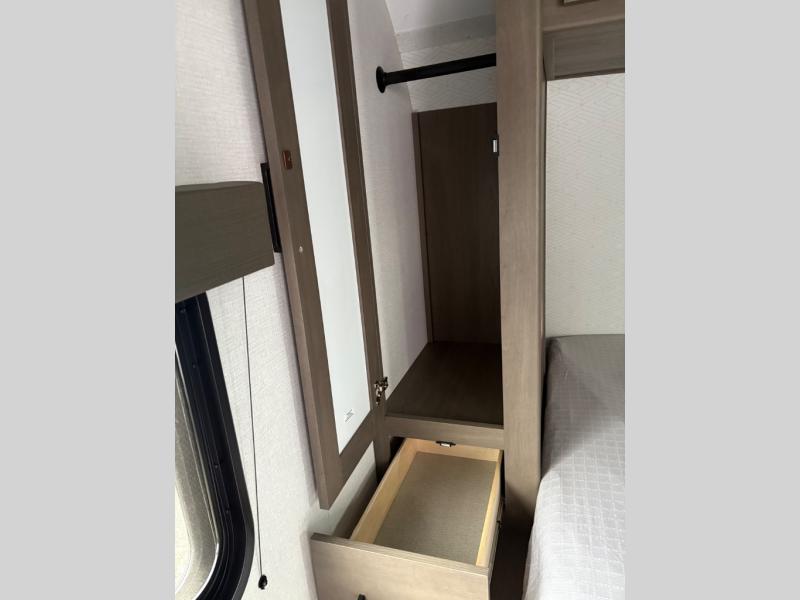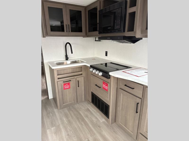 the amount of interior space you have in the living area thanks to the U-shaped dinette slide, which can be switched out for optional theater seats. The rear 70" sleeper sofa will be perfect for guests to sleep on, and the 32" TV lets you enjoy movie nights. There is a three burner range and convection microwave/combo air fryer to cook meals inside, or you can cook on the exterior griddle with a 1.7 cu. ft. refrigerator. And the 17' power awning will provide much wanted shade as you visit with friends. Back inside, the walk-thru bath is both spacious and convenient since it can be accessed from the main living area and the front master bedroom. Here, you'll find a queen bed, storage space, plus TV prep if you want to add a television. You even have your own exterior entry door for convenience!