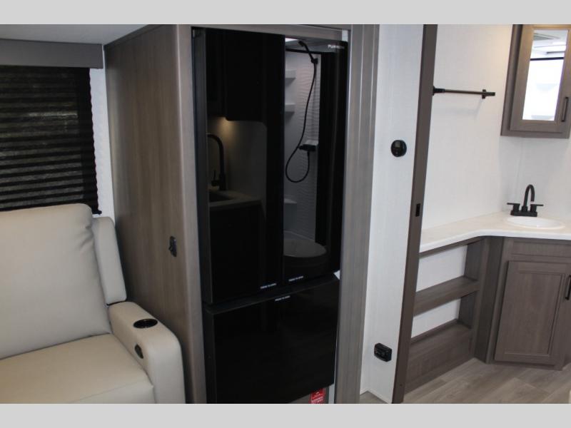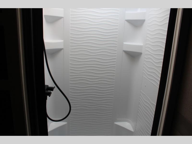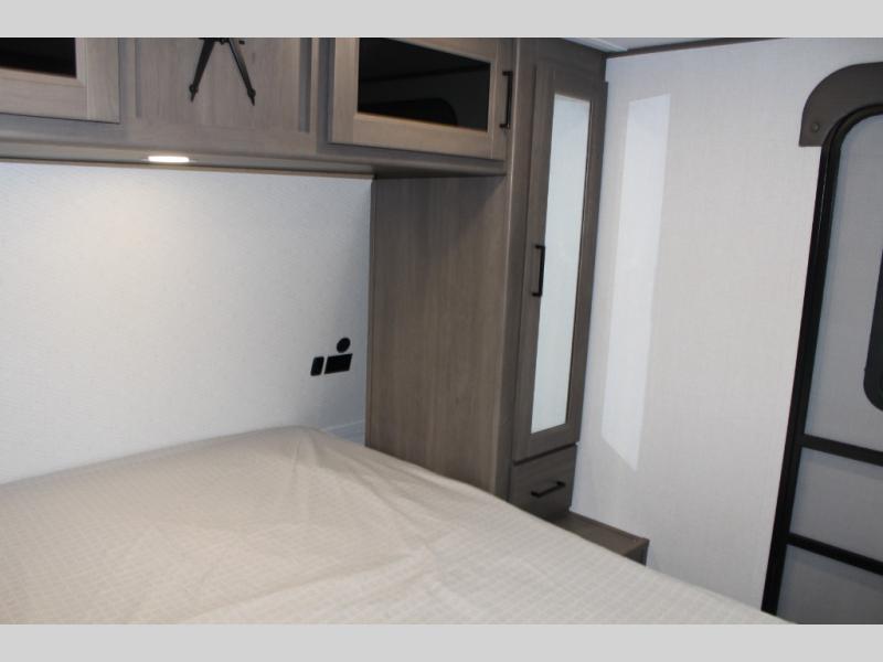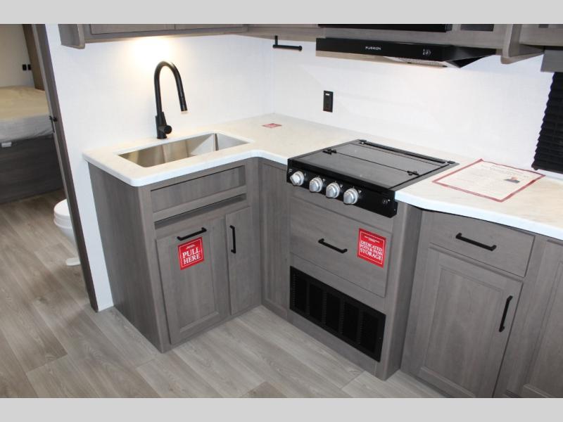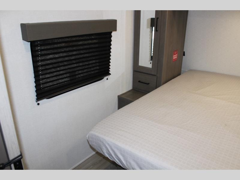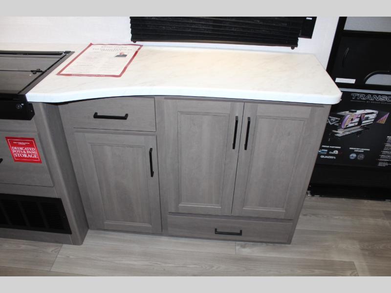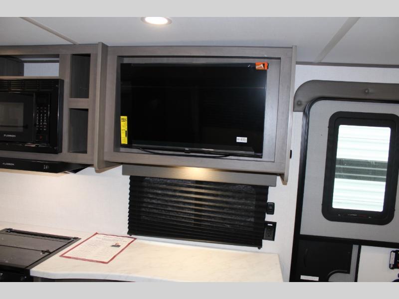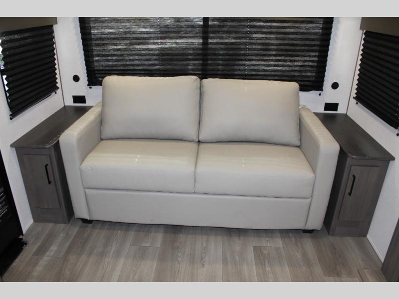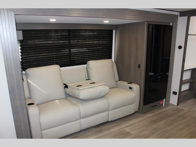 the amount of interior space you have in the living area thanks to the U-shaped dinette slide, which can be switched out for optional theater seats. The rear 70" sleeper sofa will be perfect for guests to sleep on, and the 32" TV lets you enjoy movie nights. There is a three burner range and convection microwave/combo air fryer to cook meals inside, or you can cook on the exterior griddle with a 1.7 cu. ft. refrigerator. And the 17' power awning will provide much wanted shade as you visit with friends. Back inside, the walk-thru bath is both spacious and convenient since it can be accessed from the main living area and the front master bedroom. Here, you'll find a queen bed, storage space, plus TV prep if you want to add a television. You even have your own exterior entry door for convenience!