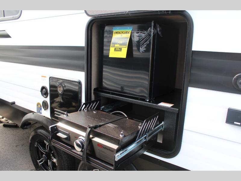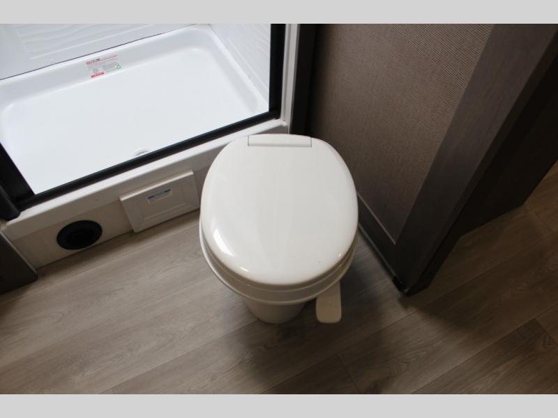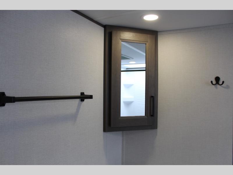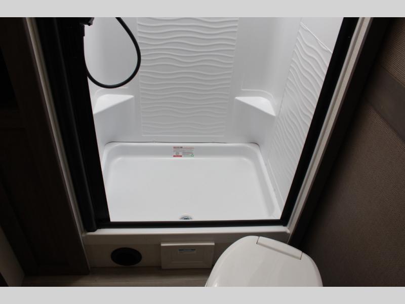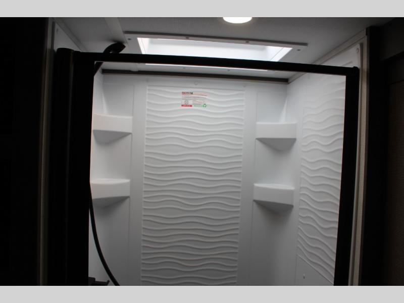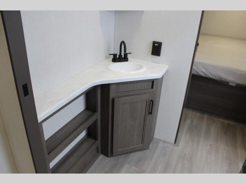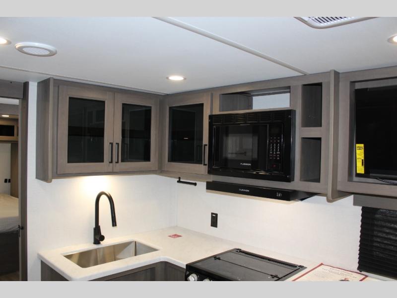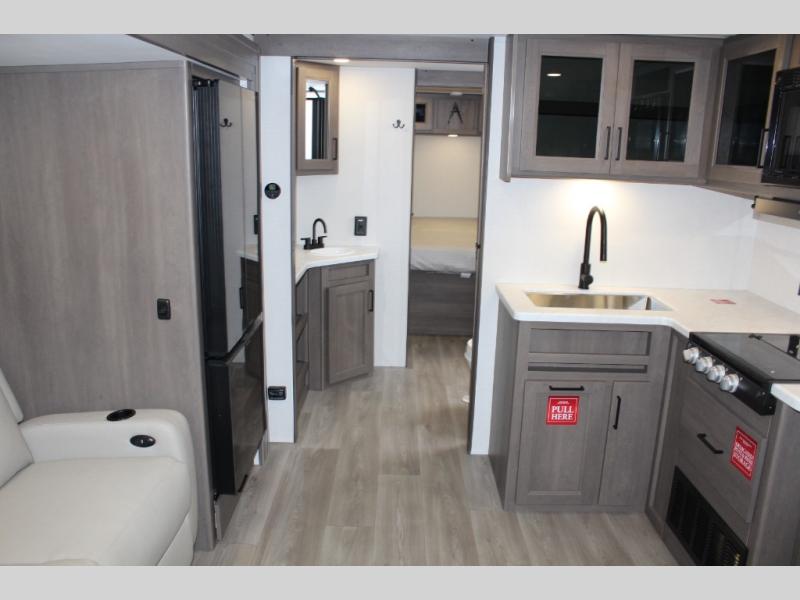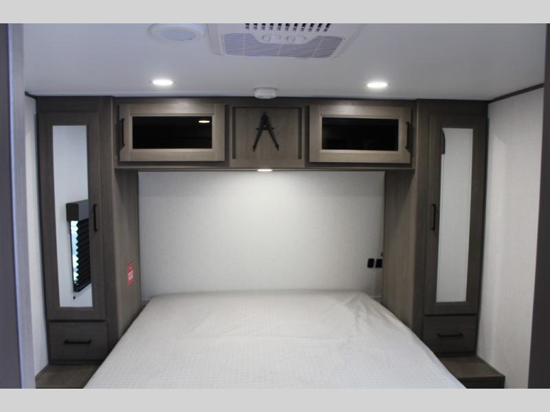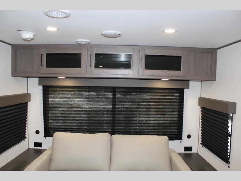 the amount of interior space you have in the living area thanks to the U-shaped dinette slide, which can be switched out for optional theater seats. The rear 70" sleeper sofa will be perfect for guests to sleep on, and the 32" TV lets you enjoy movie nights. There is a three burner range and convection microwave/combo air fryer to cook meals inside, or you can cook on the exterior griddle with a 1.7 cu. ft. refrigerator. And the 17' power awning will provide much wanted shade as you visit with friends. Back inside, the walk-thru bath is both spacious and convenient since it can be accessed from the main living area and the front master bedroom. Here, you'll find a queen bed, storage space, plus TV prep if you want to add a television. You even have your own exterior entry door for convenience!