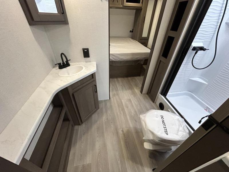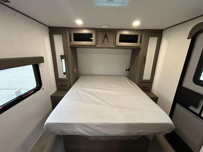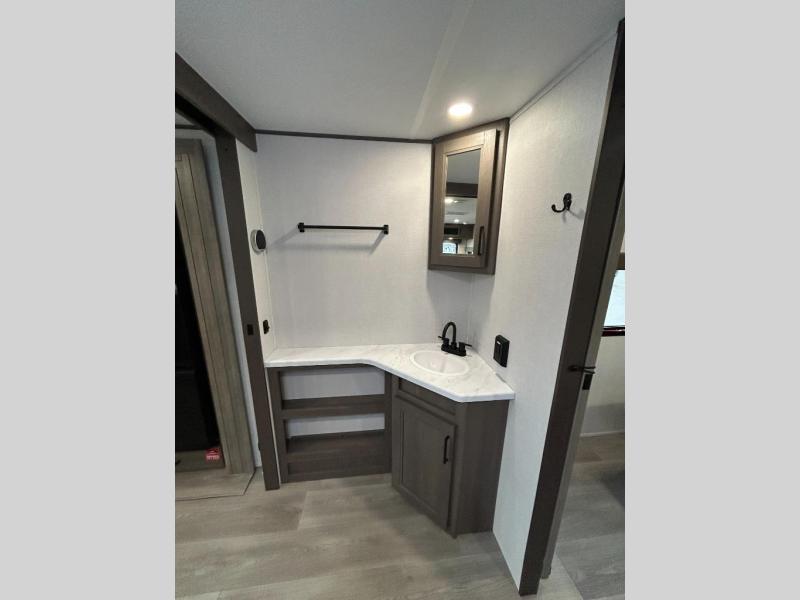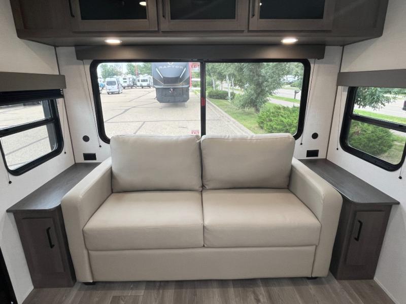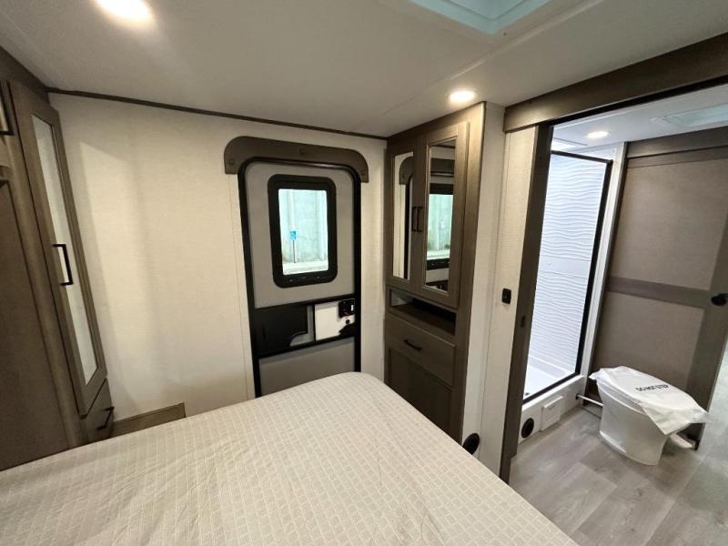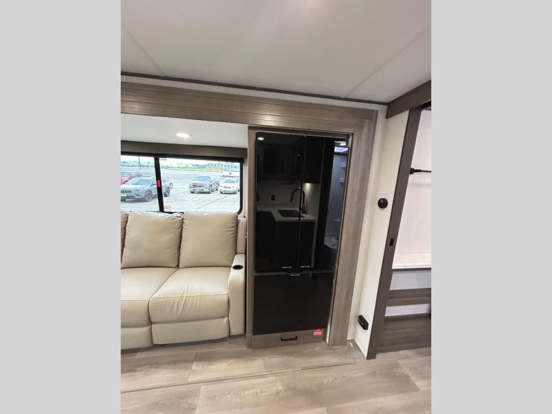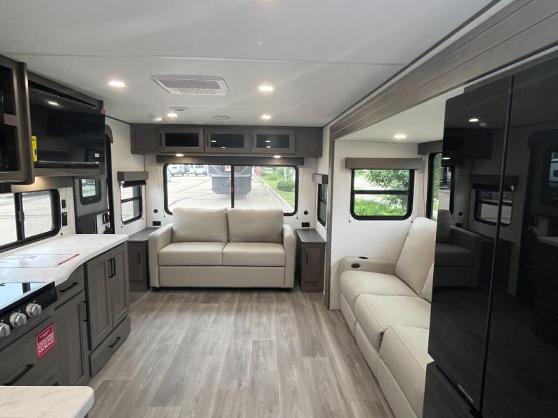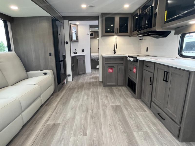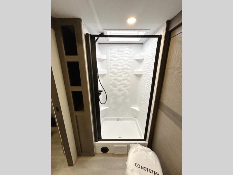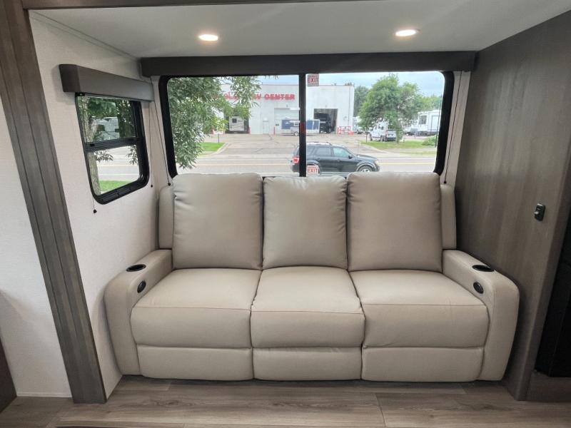 the amount of interior space you have in the living area thanks to the U-shaped dinette slide, which can be switched out for optional theater seats. The rear 70" sleeper sofa will be perfect for guests to sleep on, and the 32" TV lets you enjoy movie nights. There is a three burner range and convection microwave/combo air fryer to cook meals inside, or you can cook on the exterior griddle with a 1.7 cu. ft. refrigerator. And the 17' power awning will provide much wanted shade as you visit with friends. Back inside, the walk-thru bath is both spacious and convenient since it can be accessed from the main living area and the front master bedroom. Here, you'll find a queen bed, storage space, plus TV prep if you want to add a television. You even have your own exterior entry door for convenience!