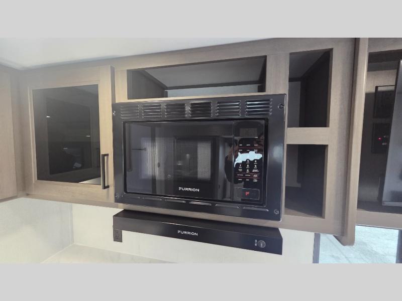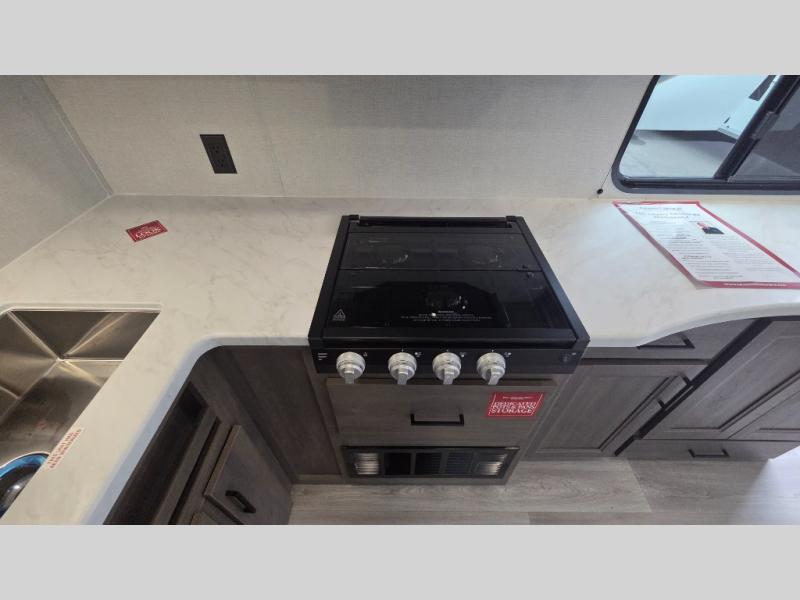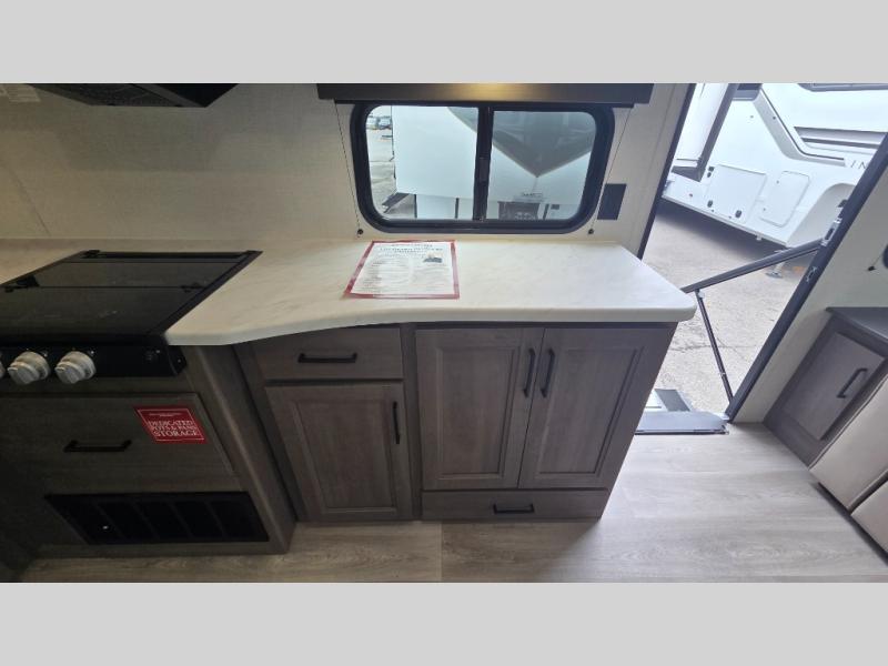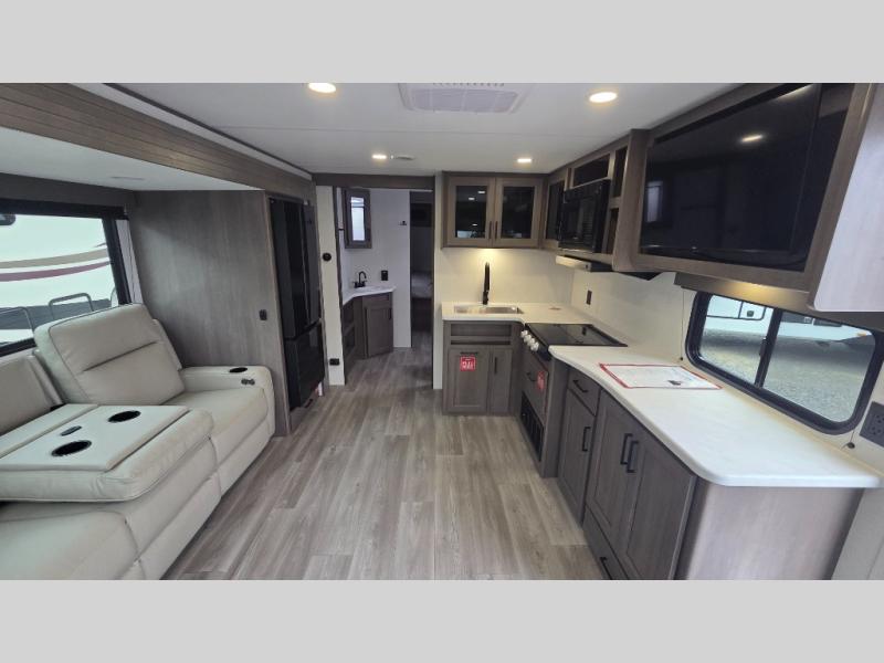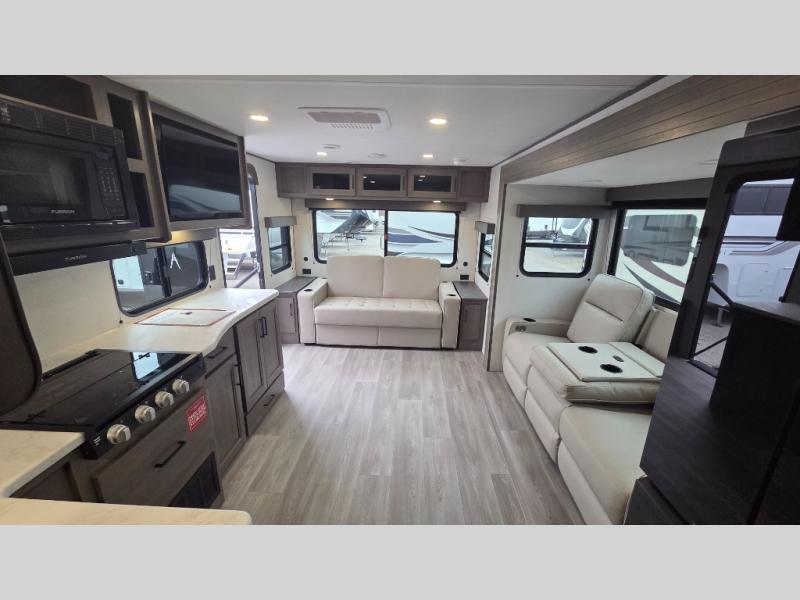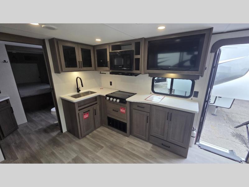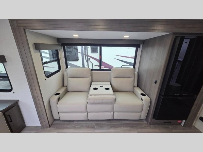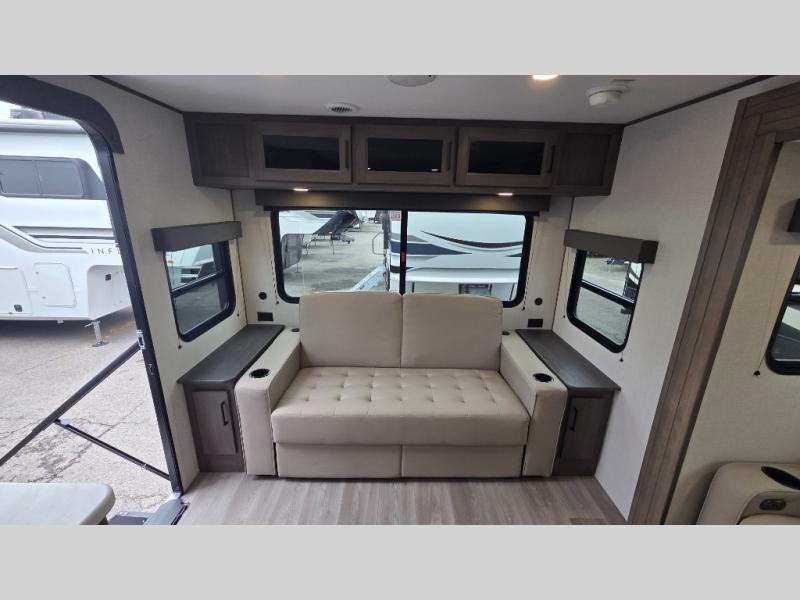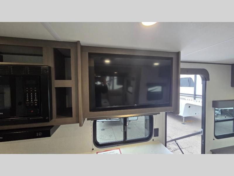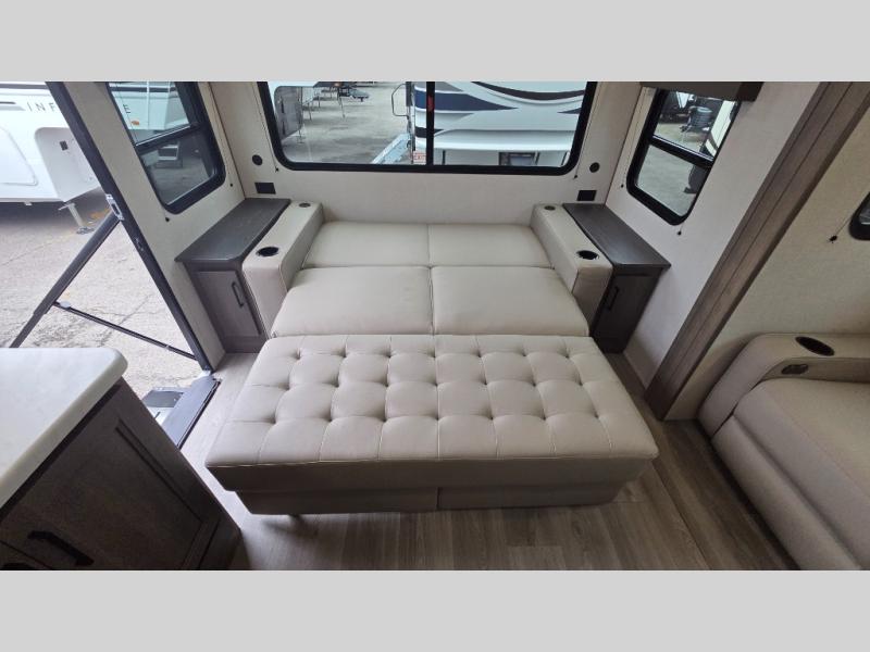the amount of interior space you have in the living area thanks to the U-shaped dinette slide, which can be switched out for optional theater seats. The rear 70" sleeper sofa will be perfect for guests to sleep on, and the 32" TV lets you enjoy movie nights. There is a three burner range and convection microwave/combo air fryer to cook meals inside, or you can cook on the exterior griddle with a 1.7 cu. ft. refrigerator. And the 17' power awning will provide much wanted shade as you visit with friends. Back inside, the walk-thru bath is both spacious and convenient since it can be accessed from the main living area and the front master bedroom. Here, you'll find a queen bed, storage space, plus TV prep if you want to add a television. You even have your own exterior entry door for convenience!