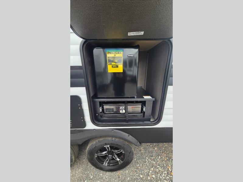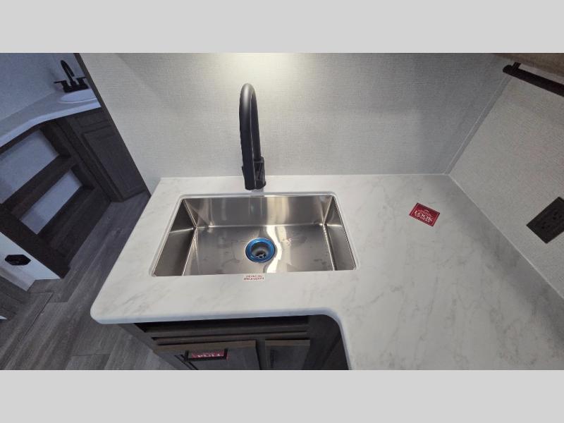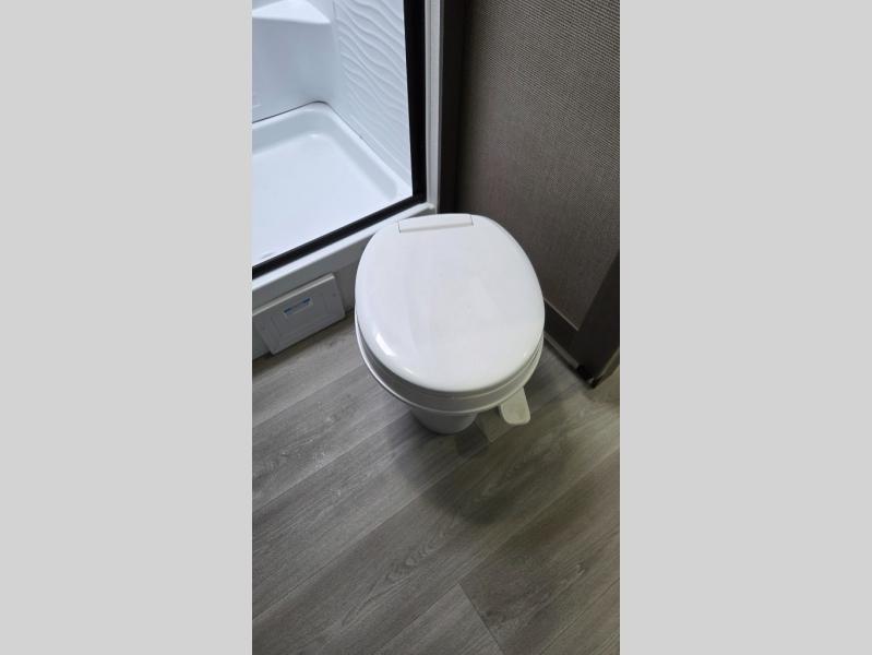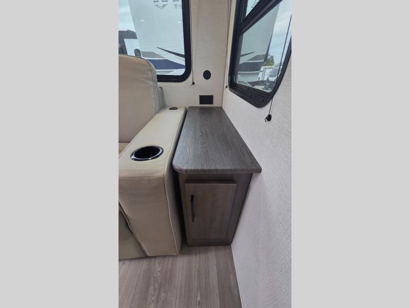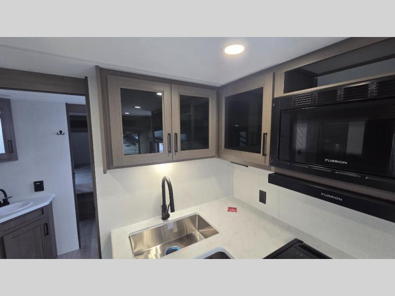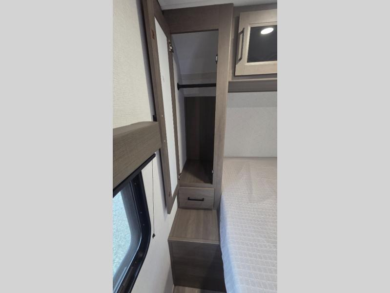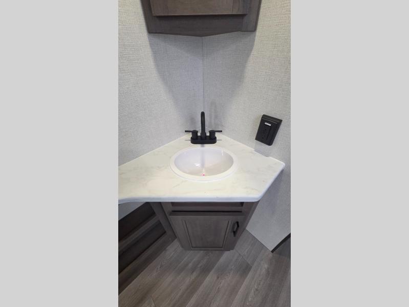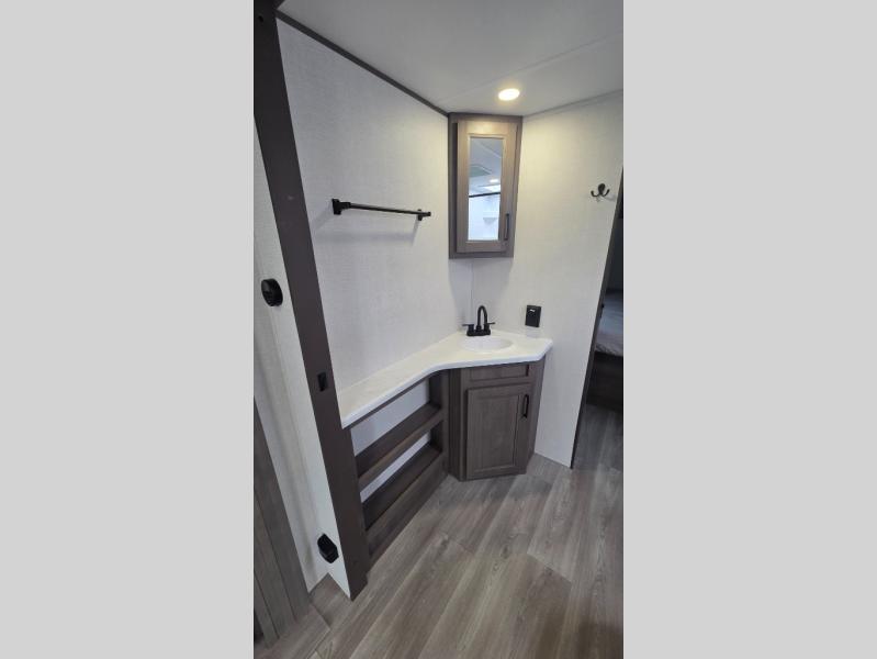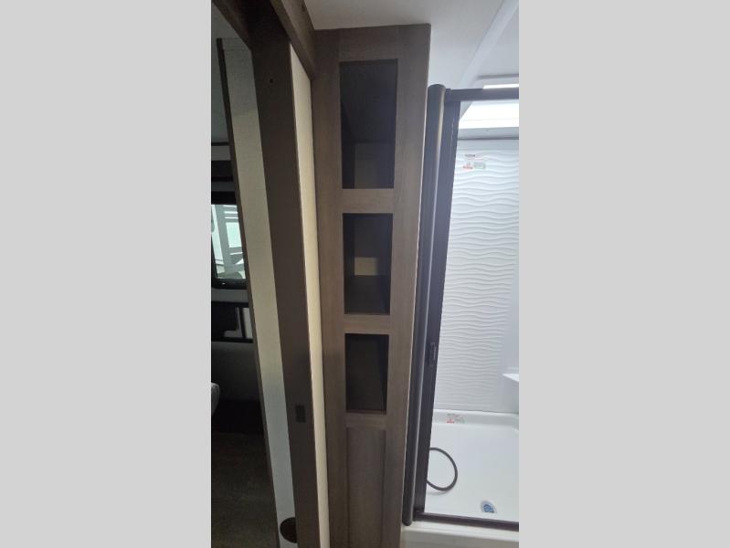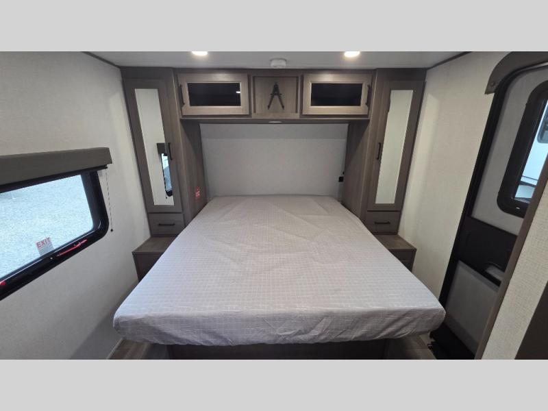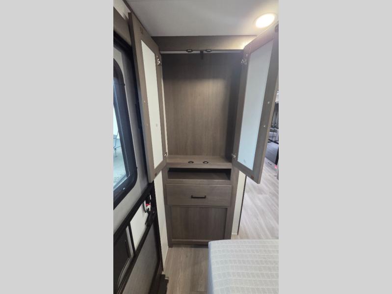 the amount of interior space you have in the living area thanks to the U-shaped dinette slide, which can be switched out for optional theater seats. The rear 70" sleeper sofa will be perfect for guests to sleep on, and the 32" TV lets you enjoy movie nights. There is a three burner range and convection microwave/combo air fryer to cook meals inside, or you can cook on the exterior griddle with a 1.7 cu. ft. refrigerator. And the 17' power awning will provide much wanted shade as you visit with friends. Back inside, the walk-thru bath is both spacious and convenient since it can be accessed from the main living area and the front master bedroom. Here, you'll find a queen bed, storage space, plus TV prep if you want to add a television. You even have your own exterior entry door for convenience!