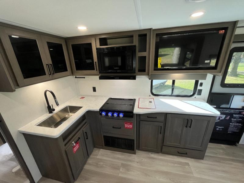 the amount of interior space you have in the living area thanks to the U-shaped dinette slide, which can be switched out for optional theater seats. The rear 70" sleeper sofa will be perfect for guests to sleep on, and the 32" TV lets you enjoy movie nights. There is a three burner range and convection microwave/combo air fryer to cook meals inside, or you can cook on the exterior griddle with a 1.7 cu. ft. refrigerator. And the 17' power awning will provide much wanted shade as you visit with friends. Back inside, the walk-thru bath is both spacious and convenient since it can be accessed from the main living area and the front master bedroom. Here, you'll find a queen bed, storage space, plus TV prep if you want to add a television. You even have your own exterior entry door for convenience!