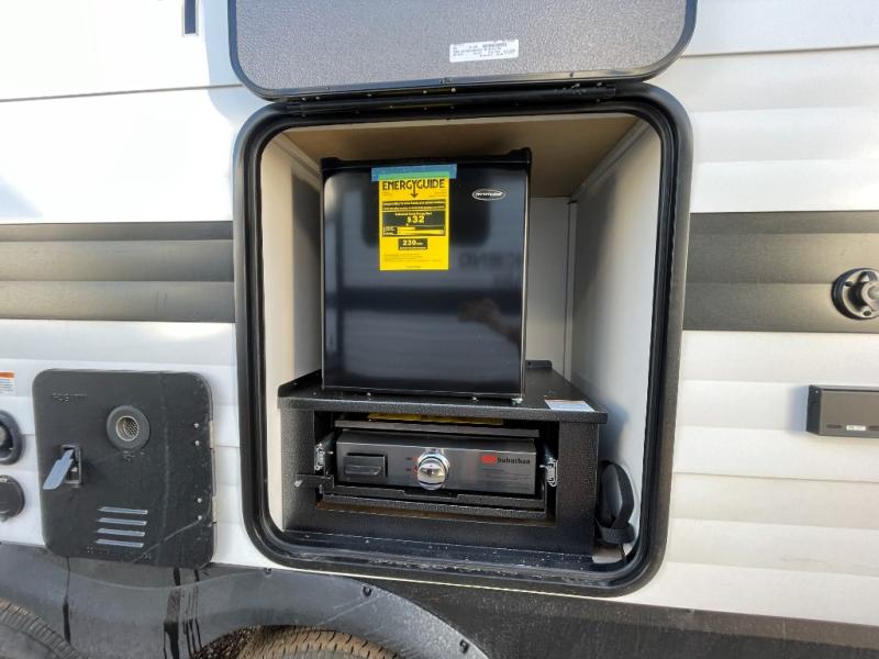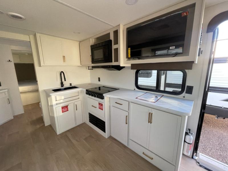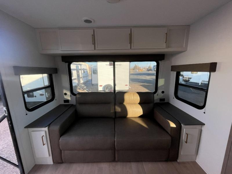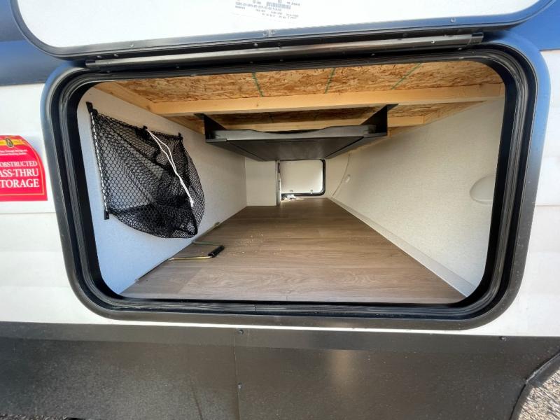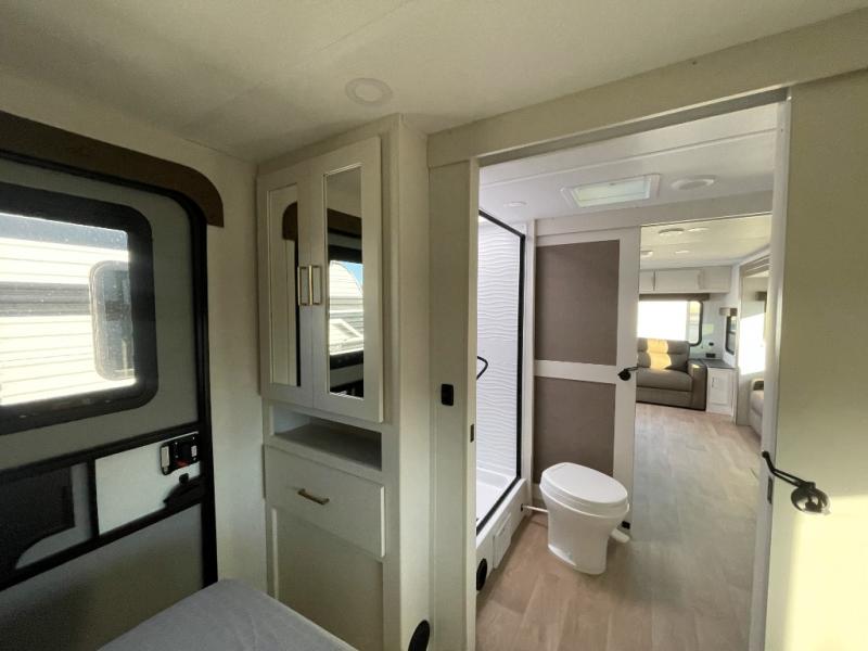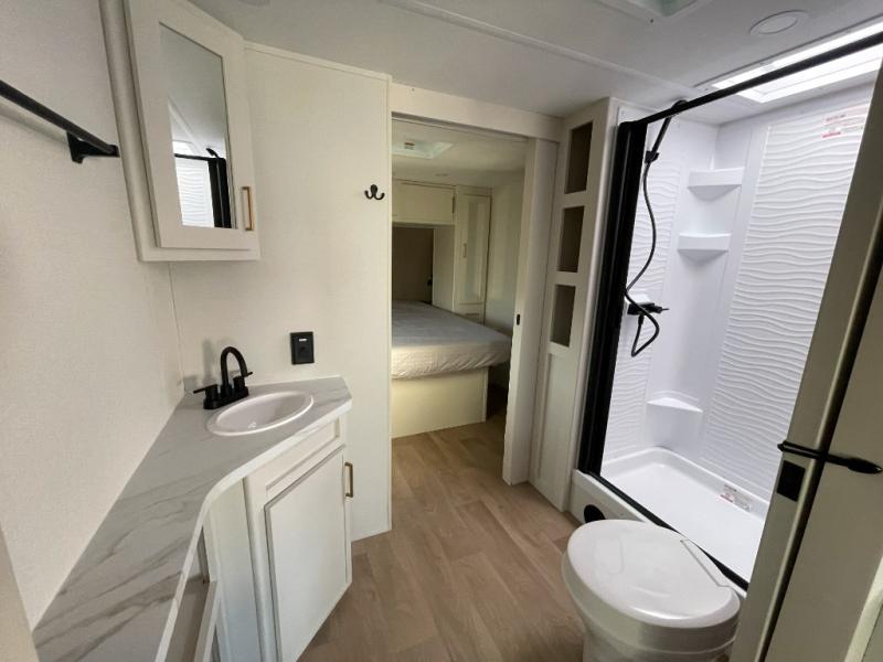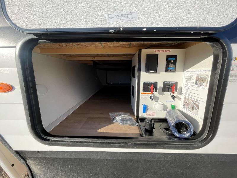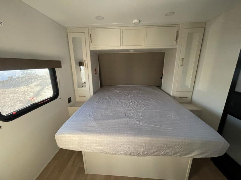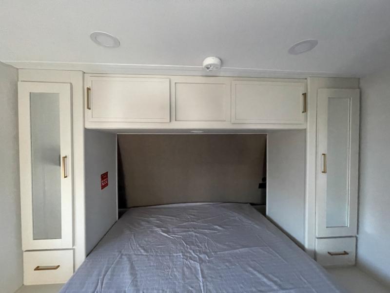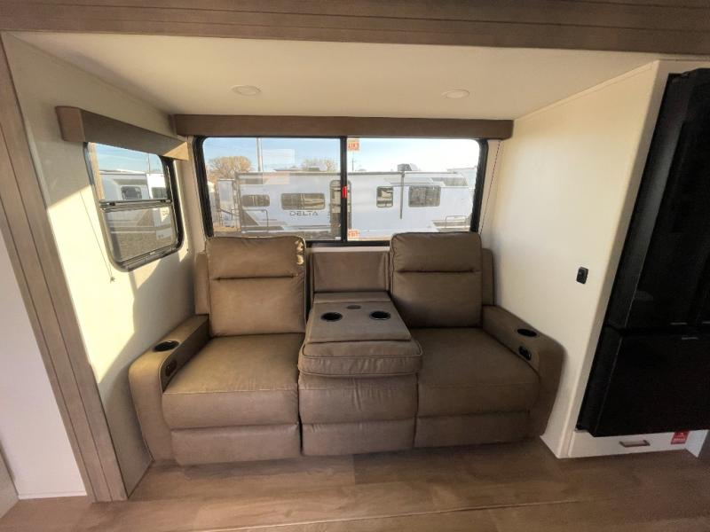 the amount of interior space you have in the living area thanks to the U-shaped dinette slide, which can be switched out for optional theater seats. The rear 70" sleeper sofa will be perfect for guests to sleep on, and the 32" TV lets you enjoy movie nights. There is a three burner range and convection microwave/combo air fryer to cook meals inside, or you can cook on the exterior griddle with a 1.7 cu. ft. refrigerator. And the 17' power awning will provide much wanted shade as you visit with friends. Back inside, the walk-thru bath is both spacious and convenient since it can be accessed from the main living area and the front master bedroom. Here, you'll find a queen bed, storage space, plus TV prep if you want to add a television. You even have your own exterior entry door for convenience!