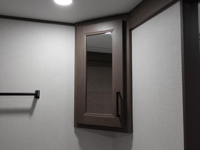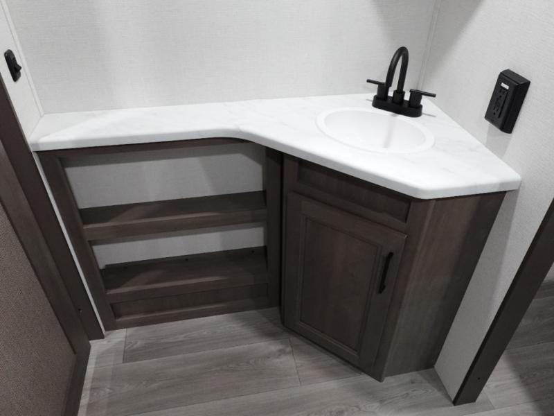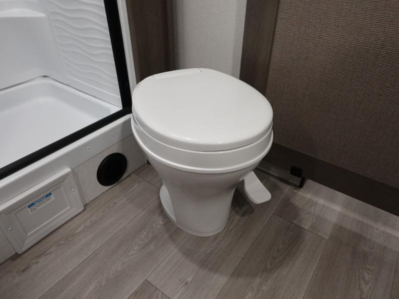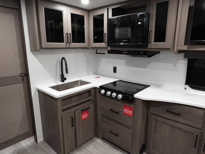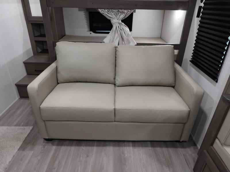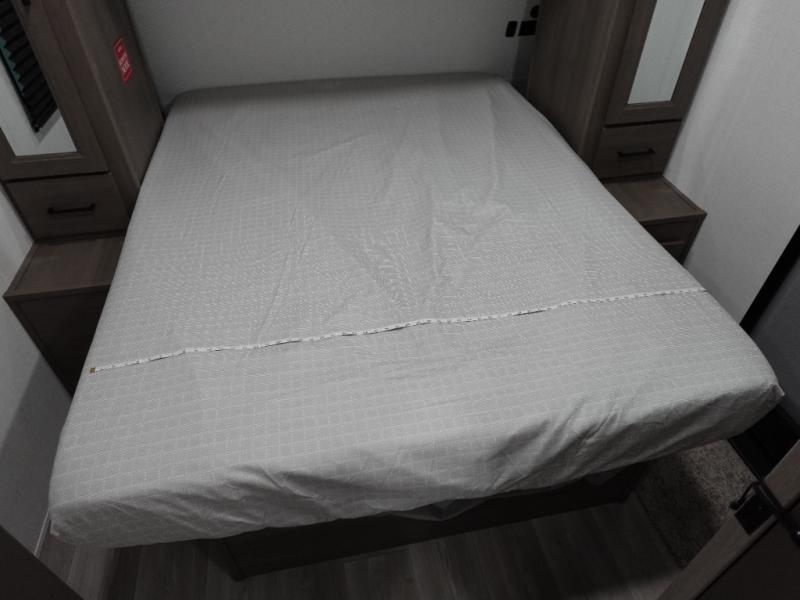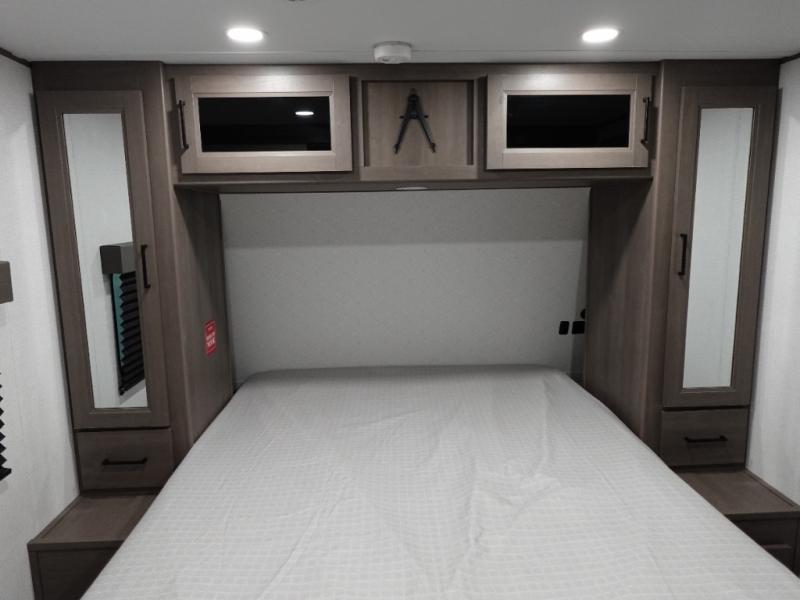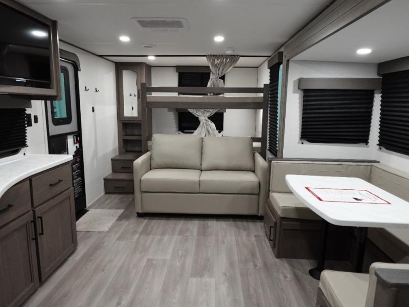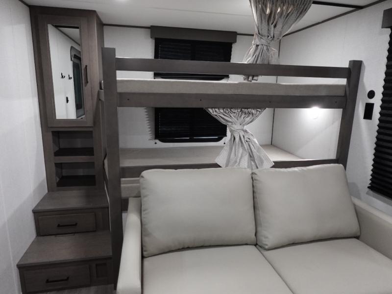 Your crew of eight will love camping in this spacious travel trailer! There are double-size bunks in the back with step storage and an added wardrobe for your guests' things plus exterior storage for camp gear galore. A walk-thru bath will create a front master bedroom you are sure to love, especially with its queen bed, wardrobe storage, and private exterior entry door! The main living area will be a favorite place to hang out with its U-shaped dinette, theater seating and 32" TV. If the weather is nice, you may just find yourselves outdoors since there is a rear exterior griddle and 1.7 cu. ft. refrigerator!