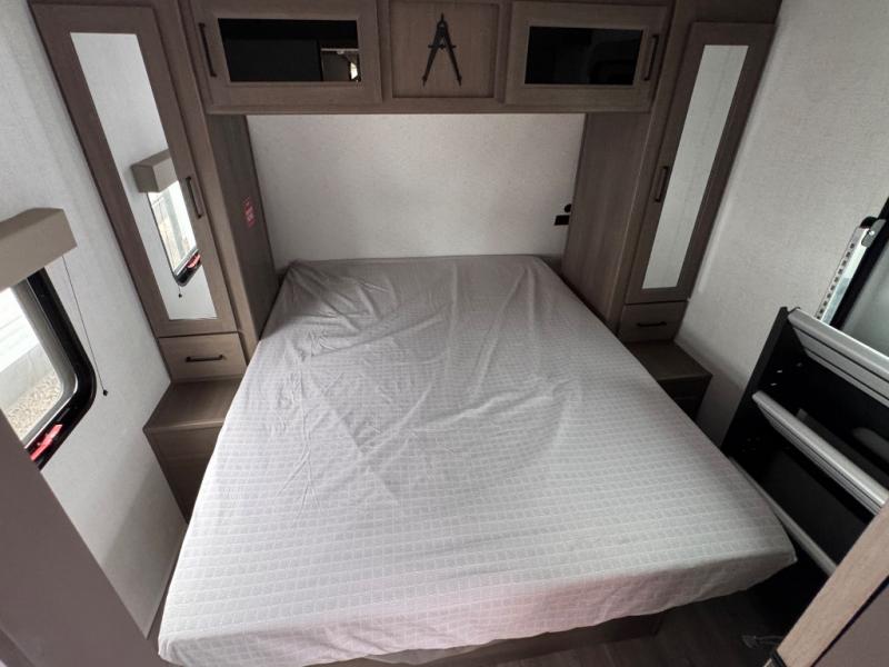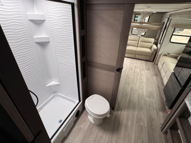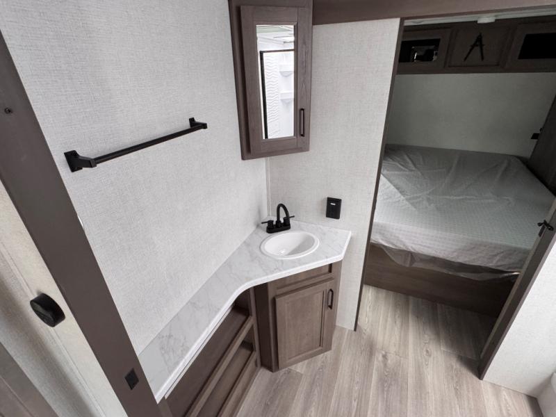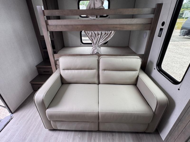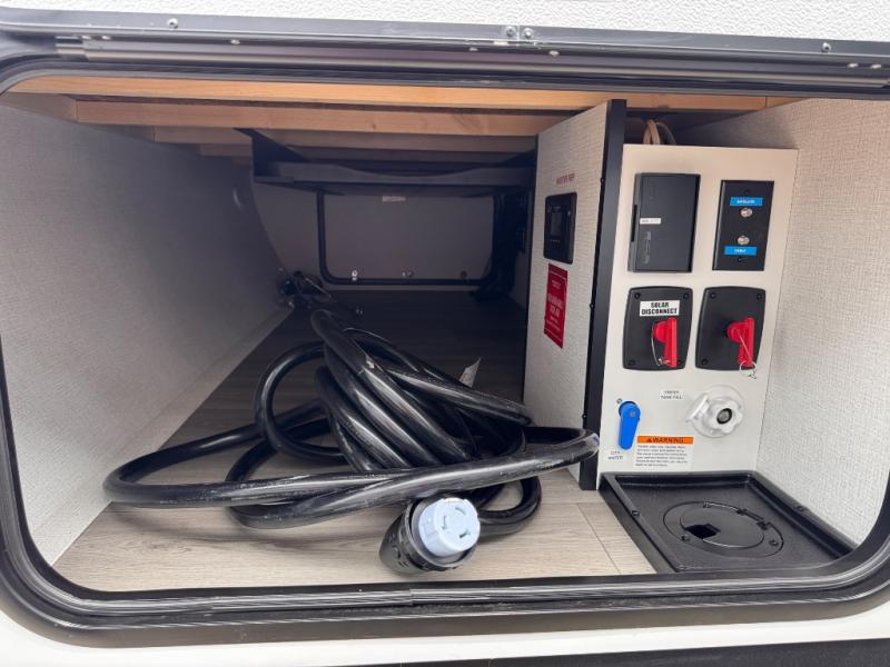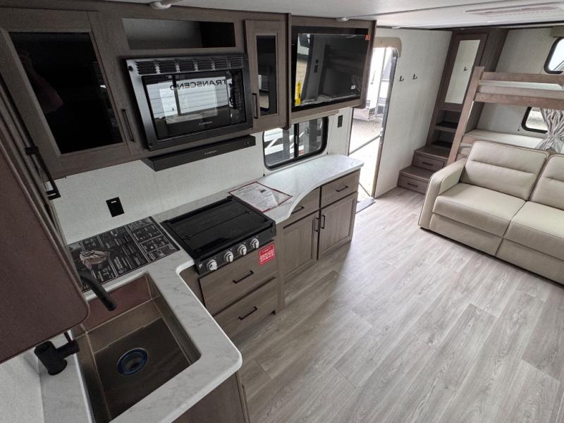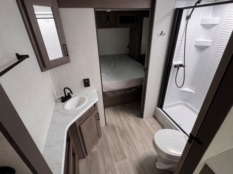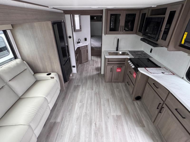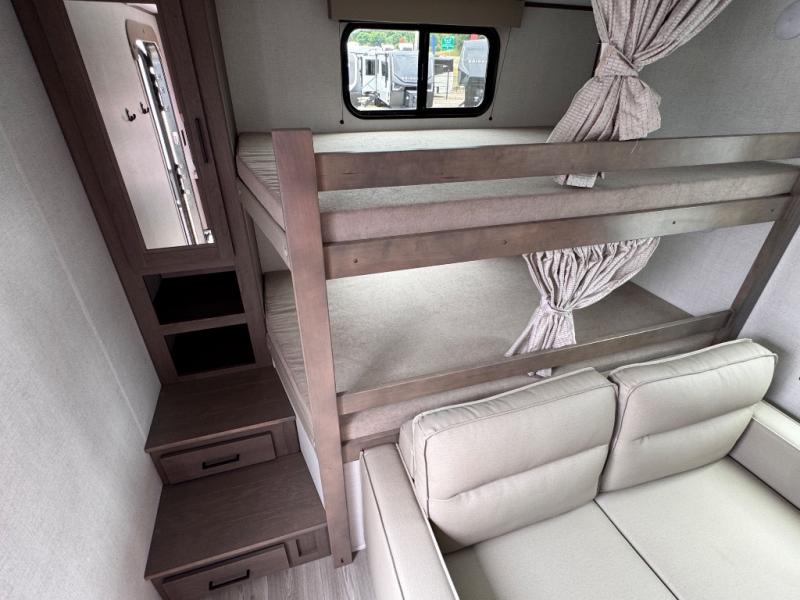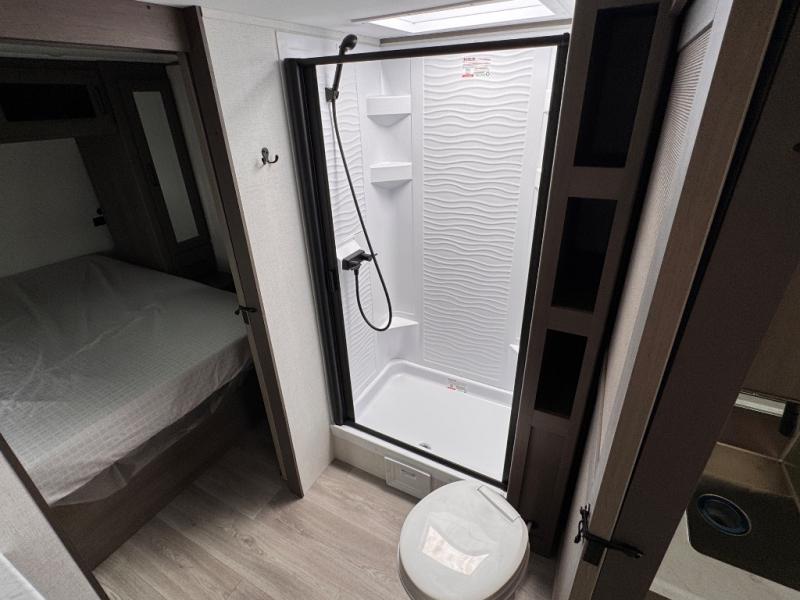 Your crew of eight will love camping in this spacious travel trailer! There are double-size bunks in the back with step storage and an added wardrobe for your guests' things plus exterior storage for camp gear galore. A walk-thru bath will create a front master bedroom you are sure to love, especially with its queen bed, wardrobe storage, and private exterior entry door! The main living area will be a favorite place to hang out with its U-shaped dinette, theater seating and 32" TV. If the weather is nice, you may just find yourselves outdoors since there is a rear exterior griddle and 1.7 cu. ft. refrigerator!