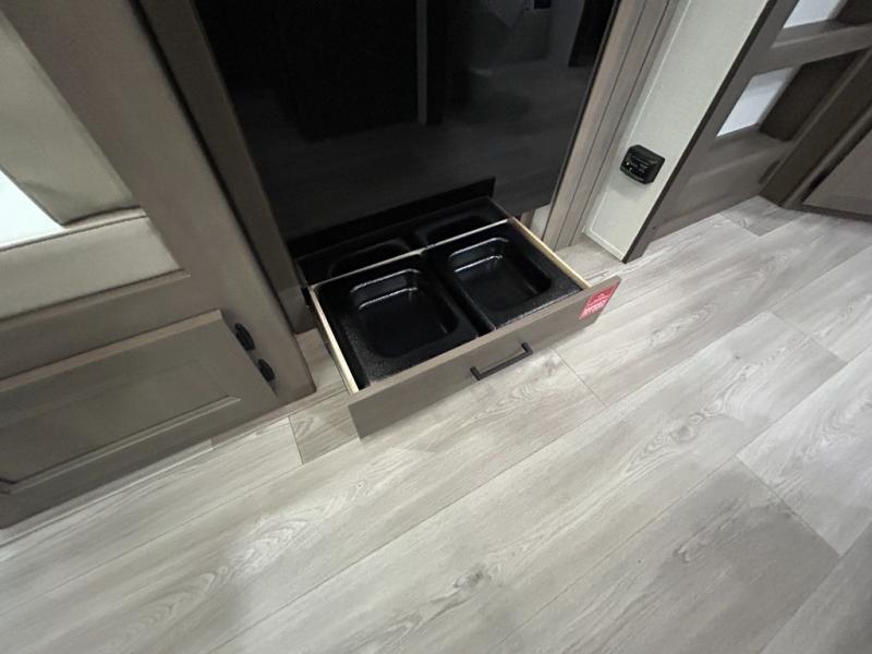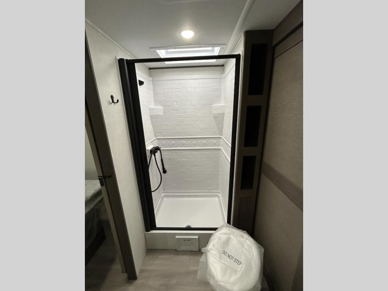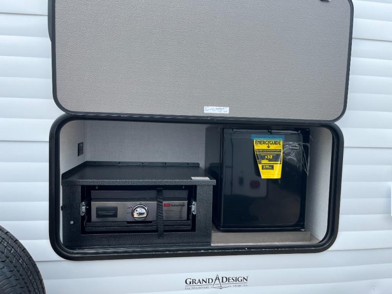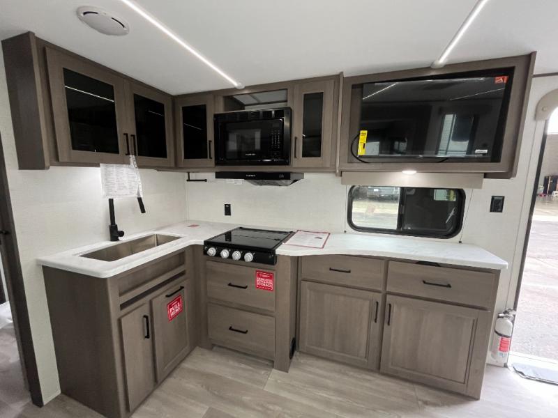 Your crew of eight will love camping in this spacious travel trailer! There are double-size bunks in the back with step storage and an added wardrobe for your guests' things plus exterior storage for camp gear galore. A walk-thru bath will create a front master bedroom you are sure to love, especially with its queen bed, wardrobe storage, and private exterior entry door! The main living area will be a favorite place to hang out with its U-shaped dinette, theater seating and 32" TV. If the weather is nice, you may just find yourselves outdoors since there is a rear exterior griddle and 1.7 cu. ft. refrigerator!