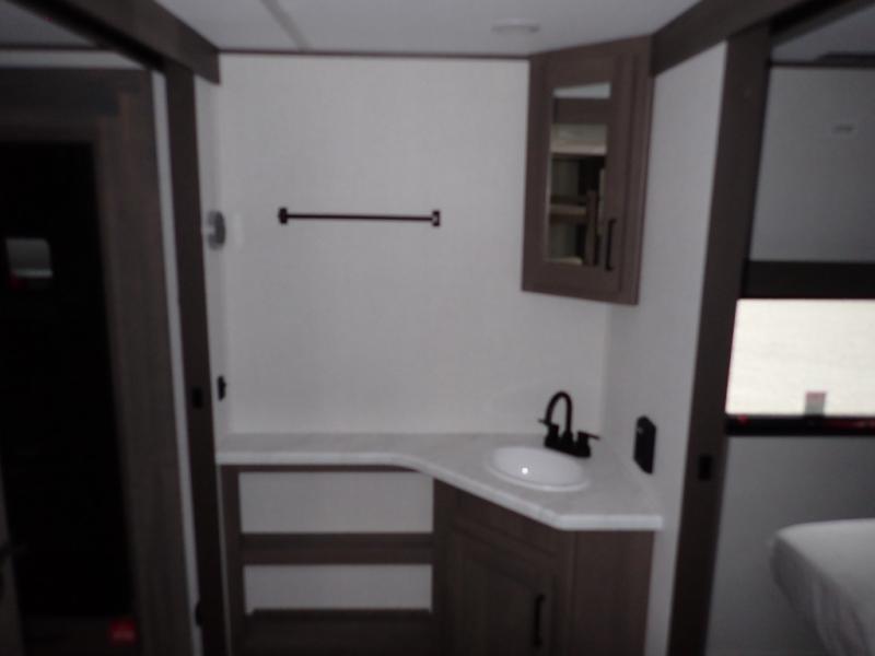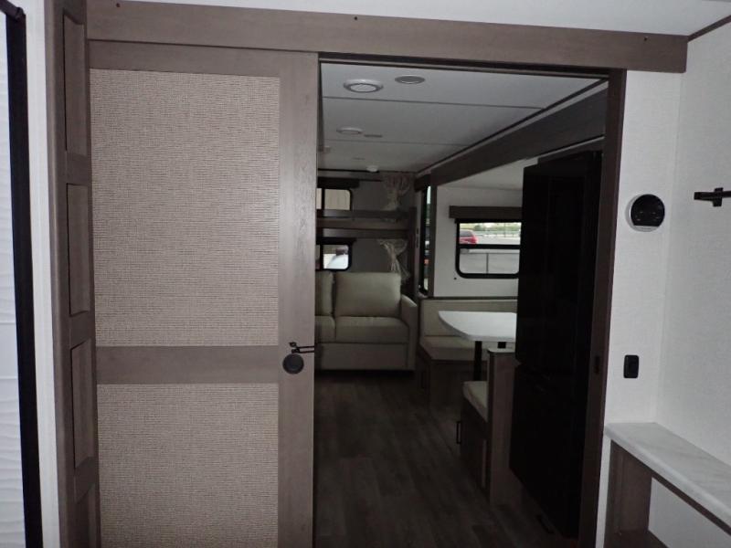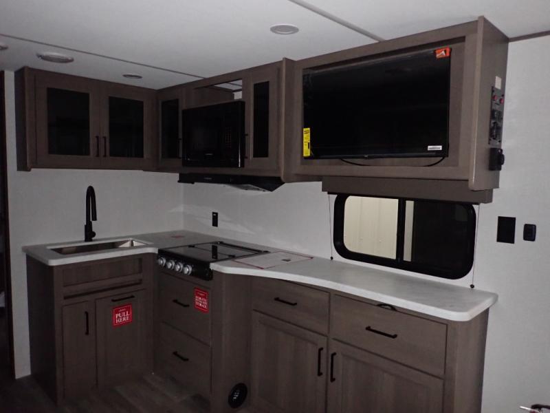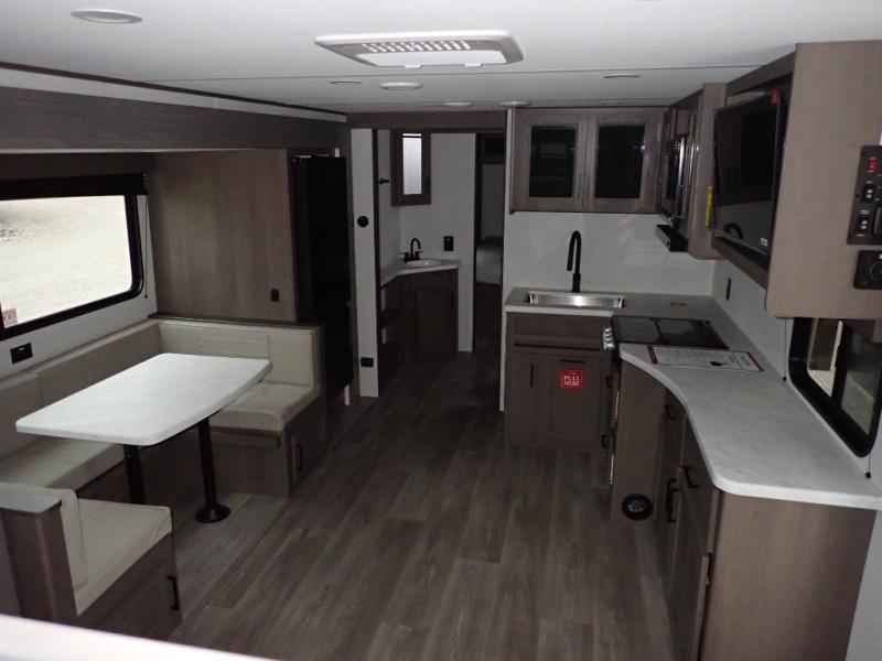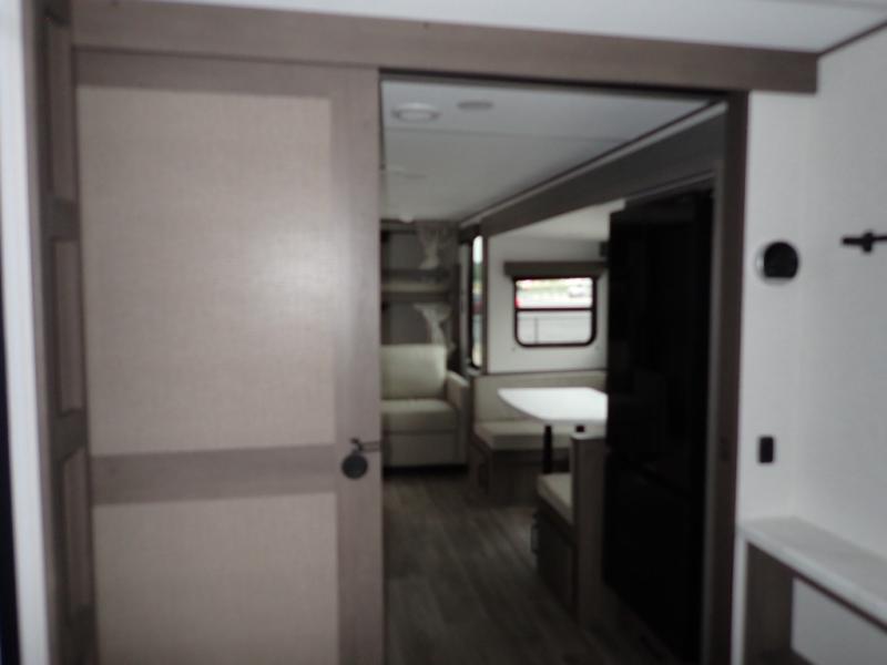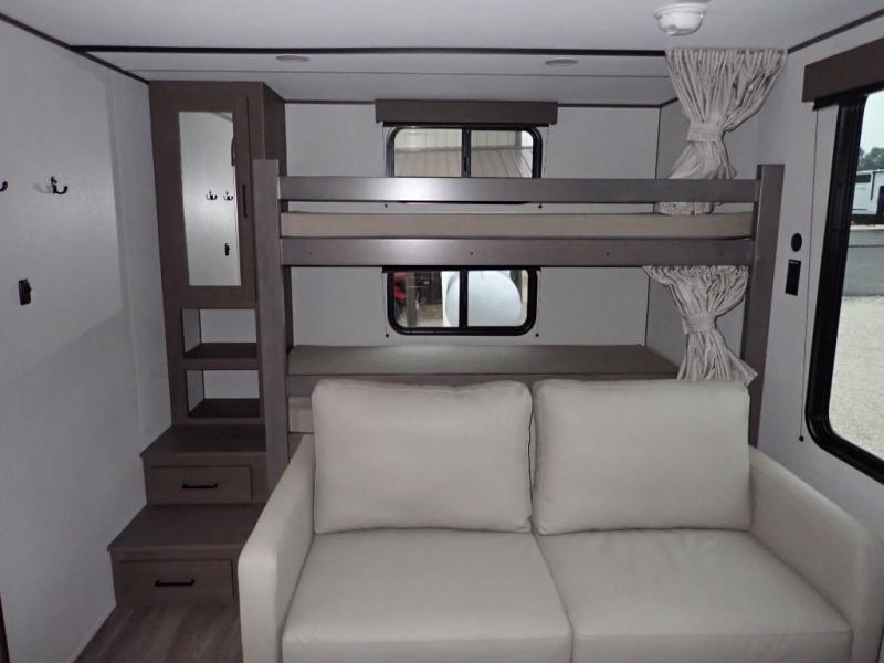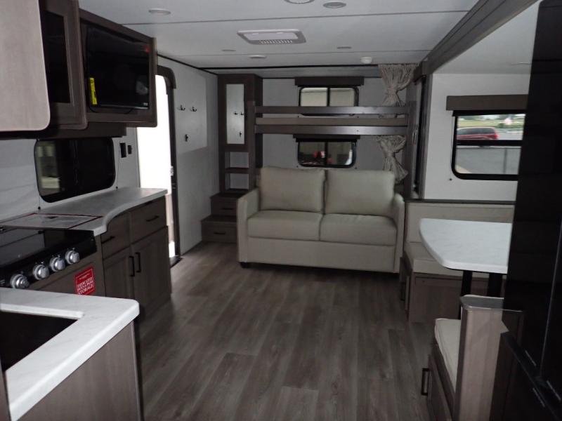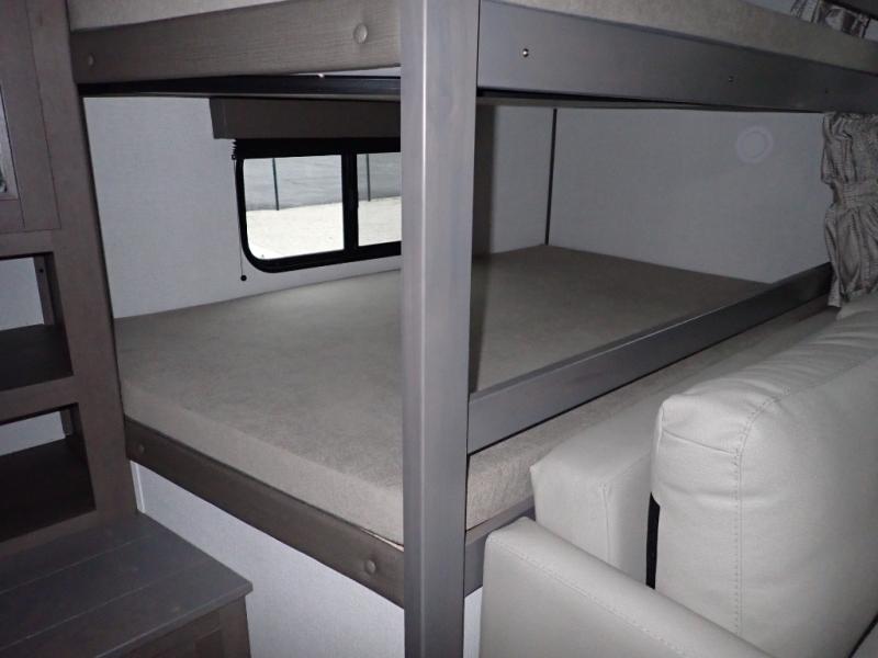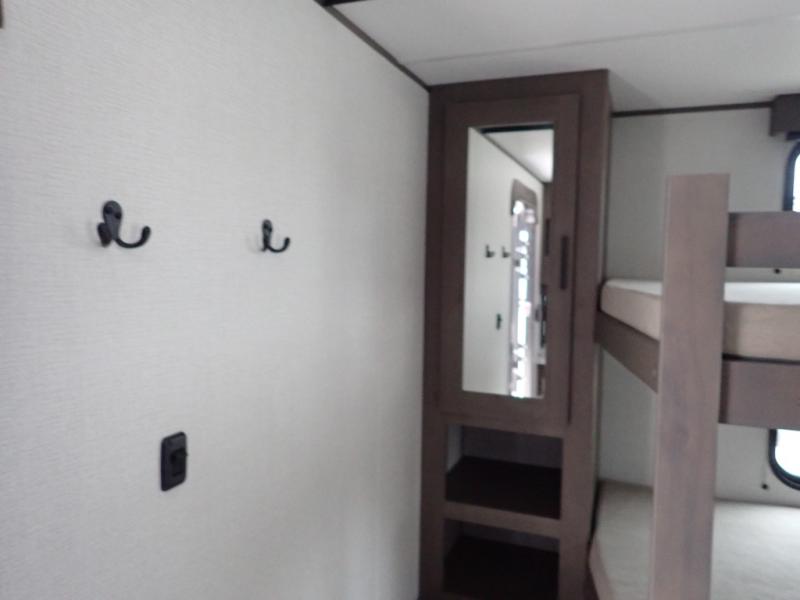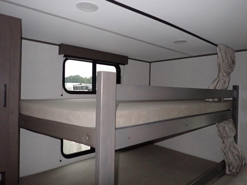 Your crew of eight will love camping in this spacious travel trailer! There are double-size bunks in the back with step storage and an added wardrobe for your guests' things plus exterior storage for camp gear galore. A walk-thru bath will create a front master bedroom you are sure to love, especially with its queen bed, wardrobe storage, and private exterior entry door! The main living area will be a favorite place to hang out with its U-shaped dinette, theater seating and 32" TV. If the weather is nice, you may just find yourselves outdoors since there is a rear exterior griddle and 1.7 cu. ft. refrigerator!