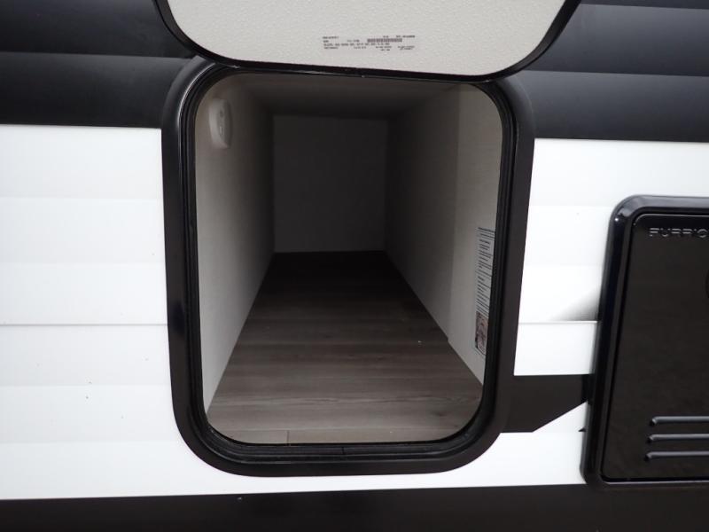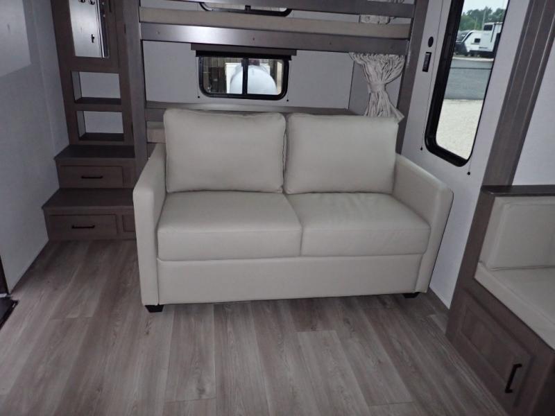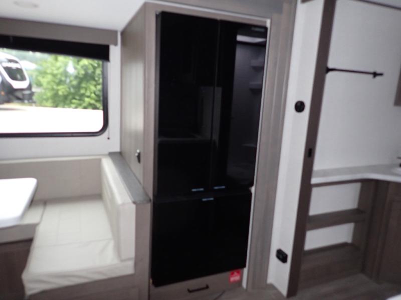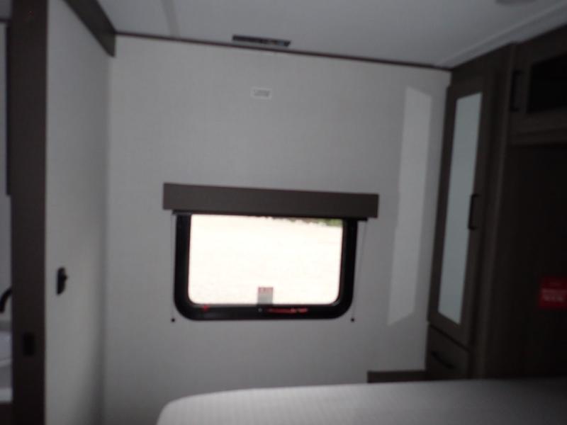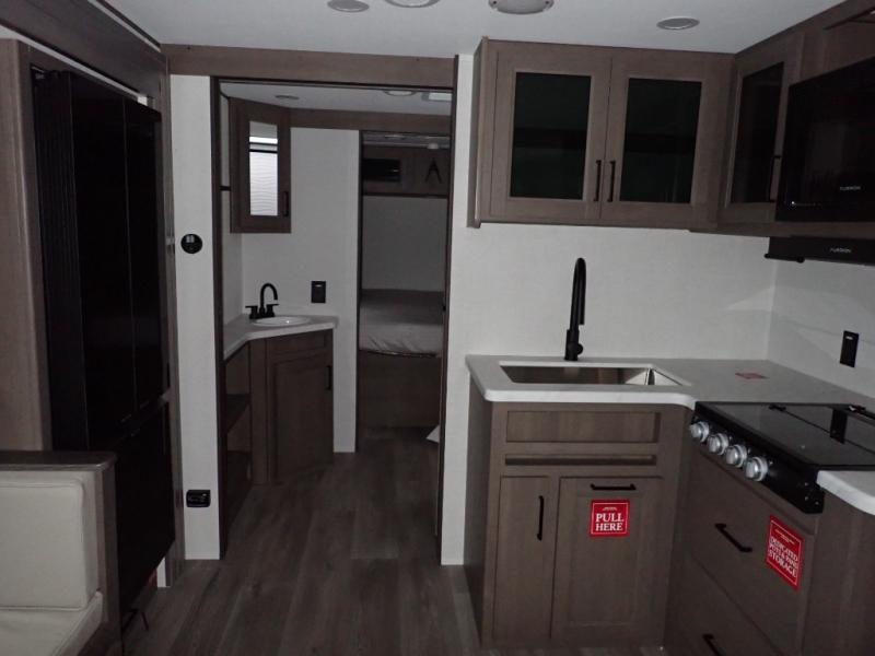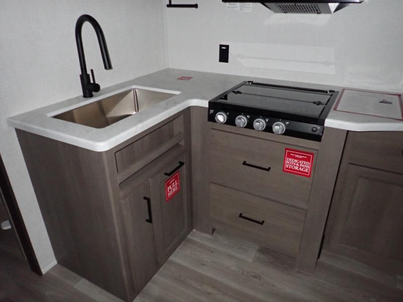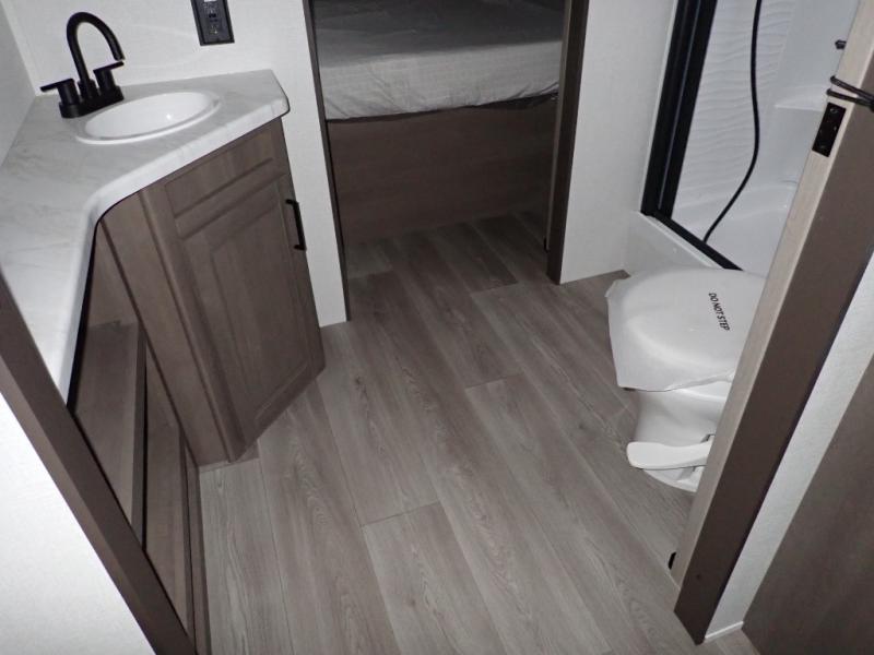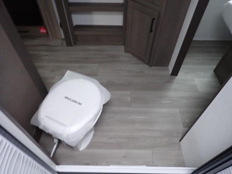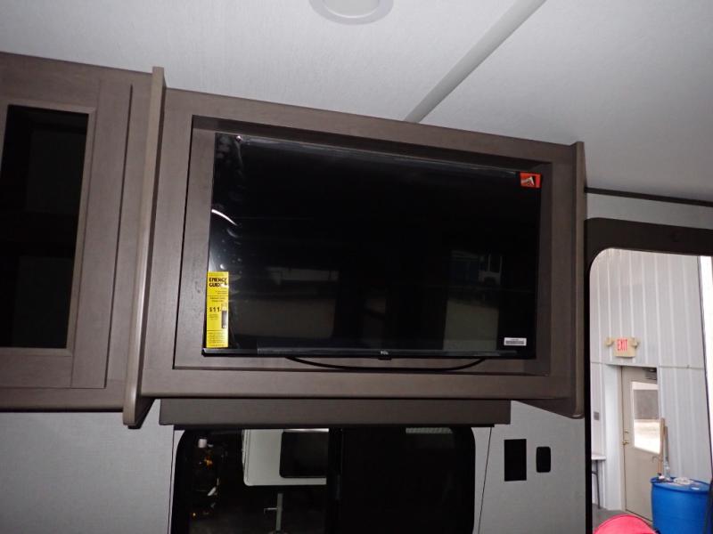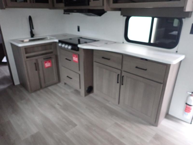 Your crew of eight will love camping in this spacious travel trailer! There are double-size bunks in the back with step storage and an added wardrobe for your guests' things plus exterior storage for camp gear galore. A walk-thru bath will create a front master bedroom you are sure to love, especially with its queen bed, wardrobe storage, and private exterior entry door! The main living area will be a favorite place to hang out with its U-shaped dinette, theater seating and 32" TV. If the weather is nice, you may just find yourselves outdoors since there is a rear exterior griddle and 1.7 cu. ft. refrigerator!