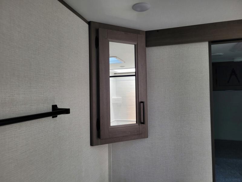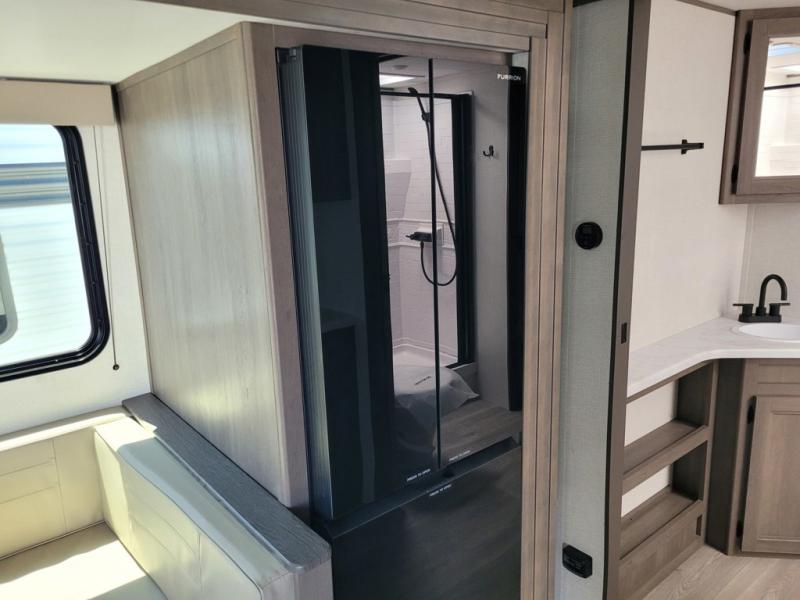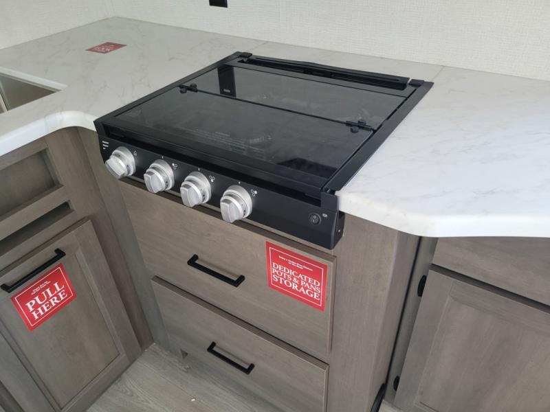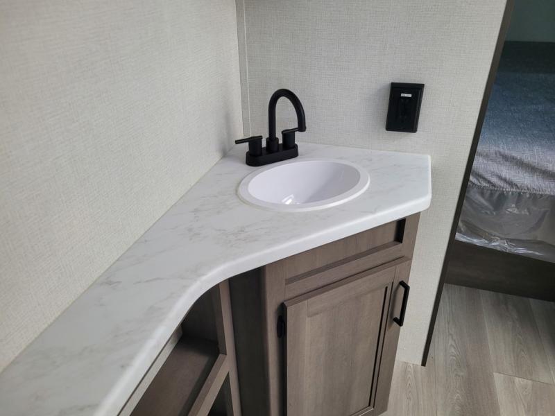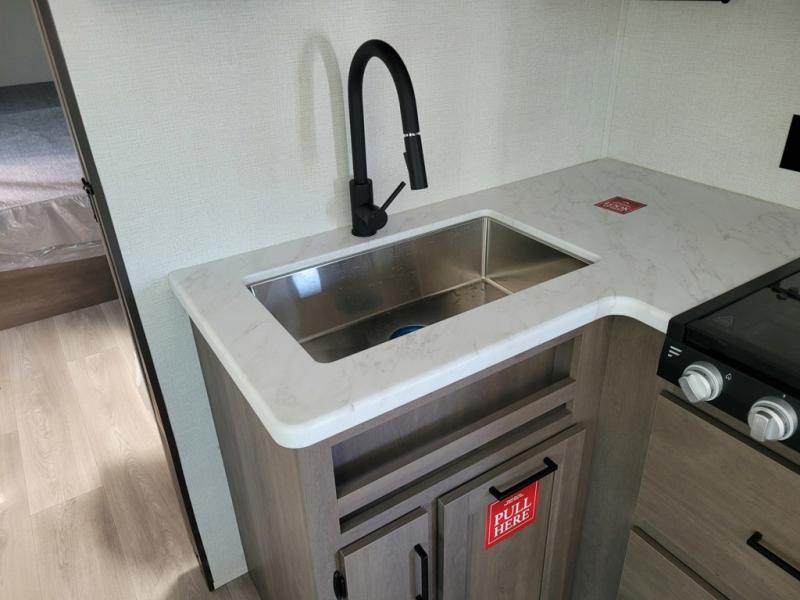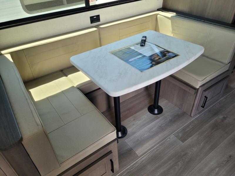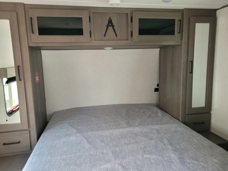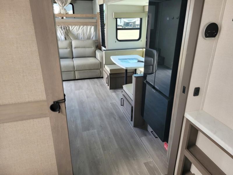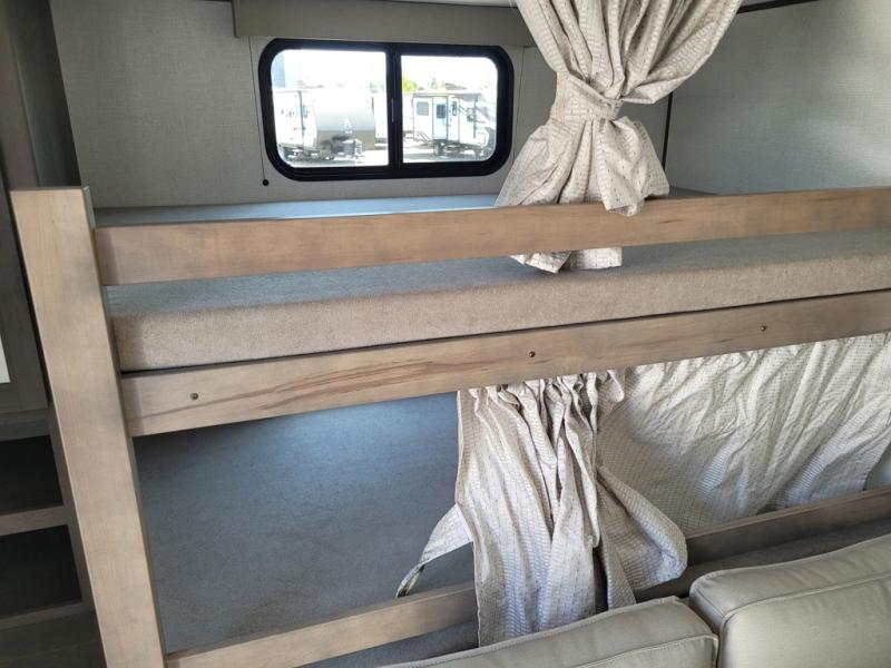 Your crew of eight will love camping in this spacious travel trailer! There are double-size bunks in the back with step storage and an added wardrobe for your guests' things plus exterior storage for camp gear galore. A walk-thru bath will create a front master bedroom you are sure to love, especially with its queen bed, wardrobe storage, and private exterior entry door! The main living area will be a favorite place to hang out with its U-shaped dinette, theater seating and 32" TV. If the weather is nice, you may just find yourselves outdoors since there is a rear exterior griddle and 1.7 cu. ft. refrigerator!
