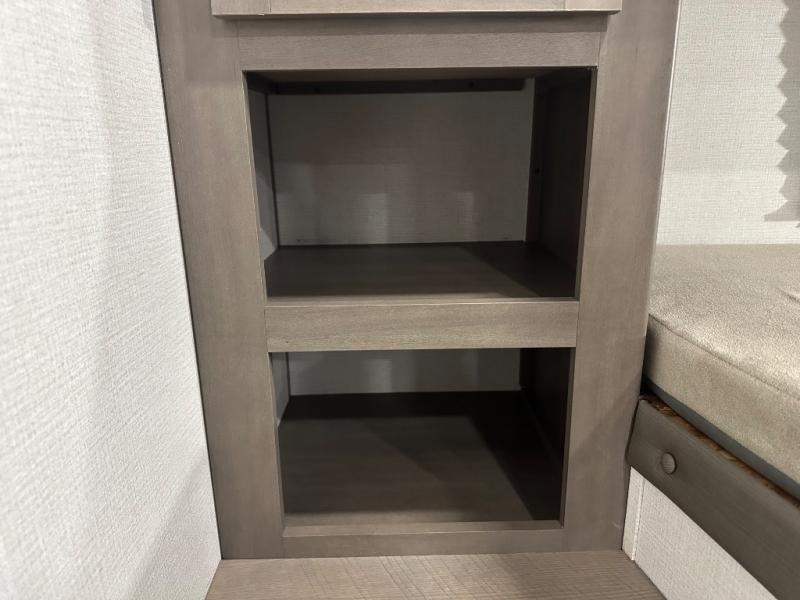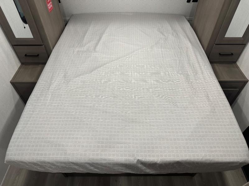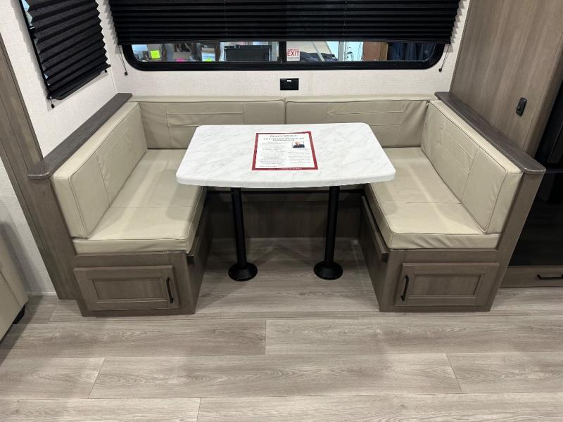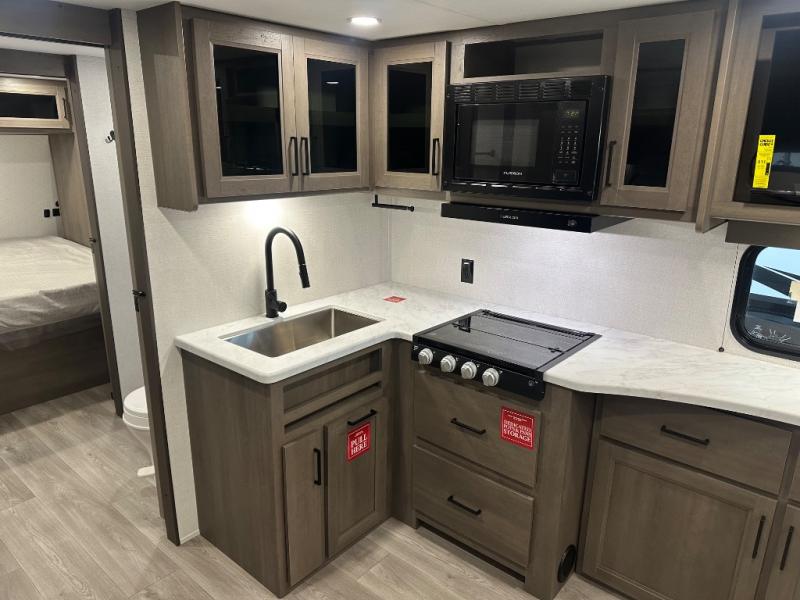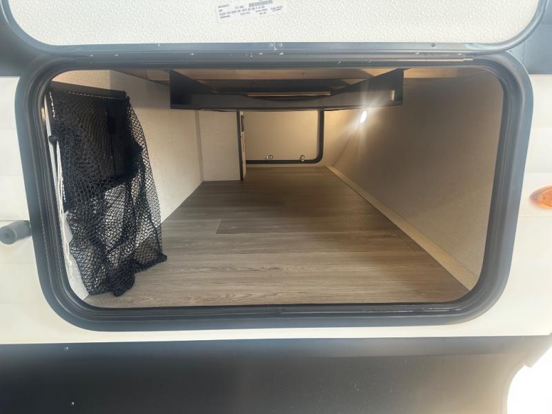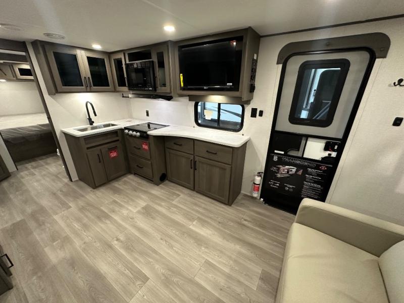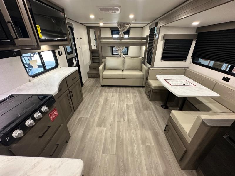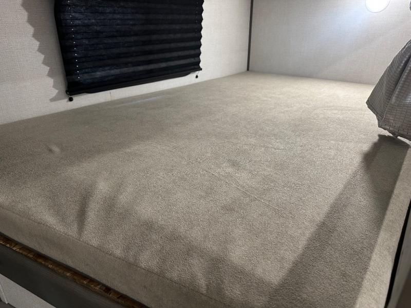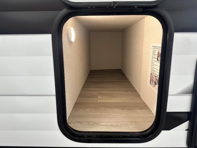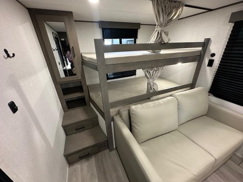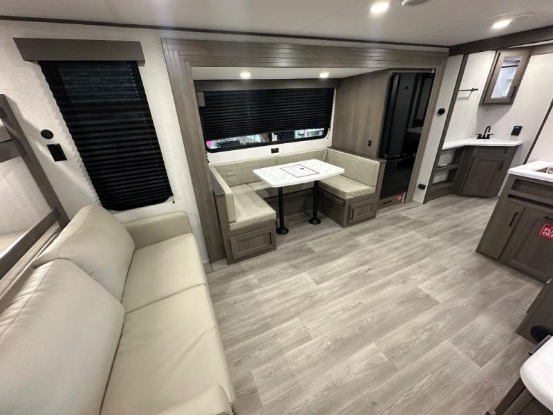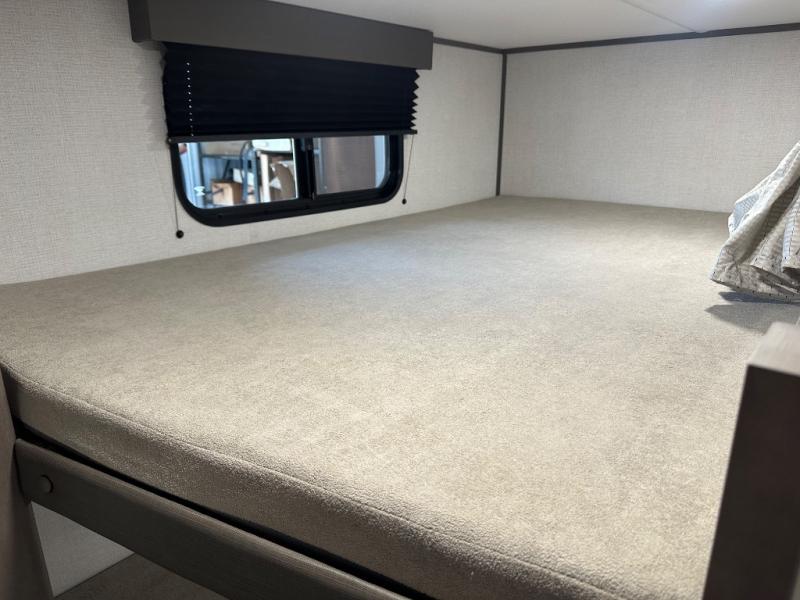 Your crew of eight will love camping in this spacious travel trailer! There are double-size bunks in the back with step storage and an added wardrobe for your guests' things plus exterior storage for camp gear galore. A walk-thru bath will create a front master bedroom you are sure to love, especially with its queen bed, wardrobe storage, and private exterior entry door! The main living area will be a favorite place to hang out with its U-shaped dinette, theater seating and 32" TV. If the weather is nice, you may just find yourselves outdoors since there is a rear exterior griddle and 1.7 cu. ft. refrigerator!