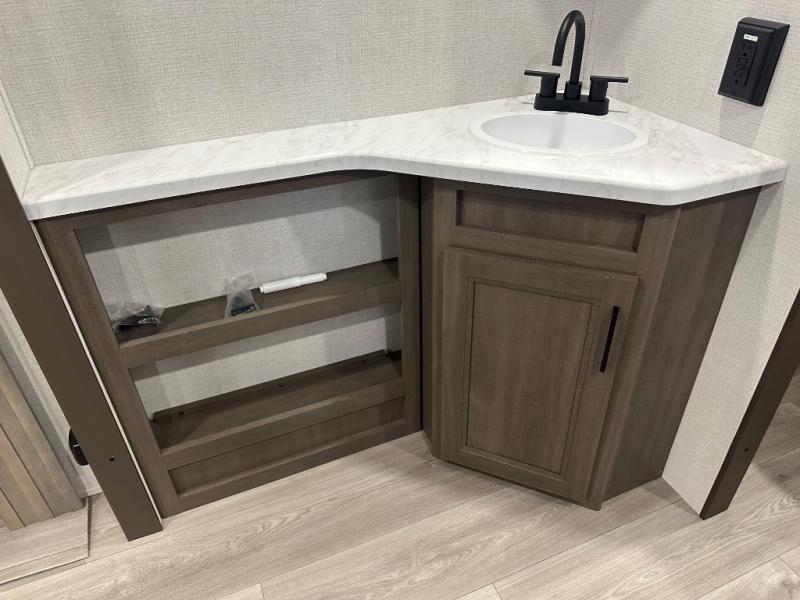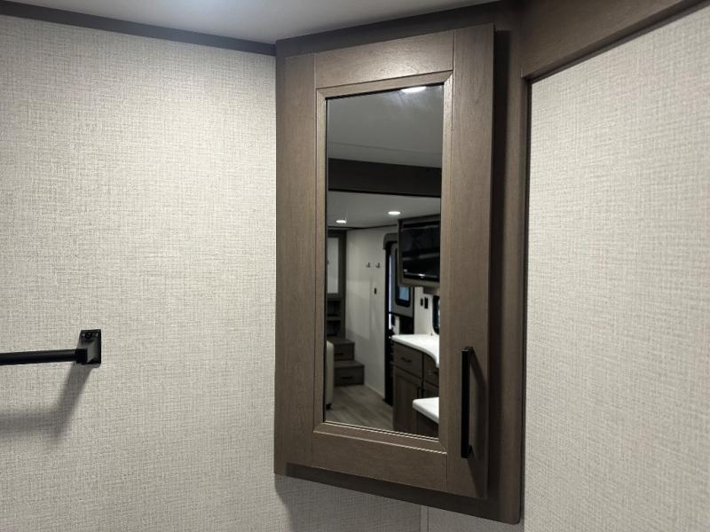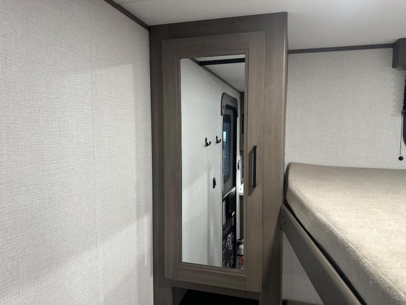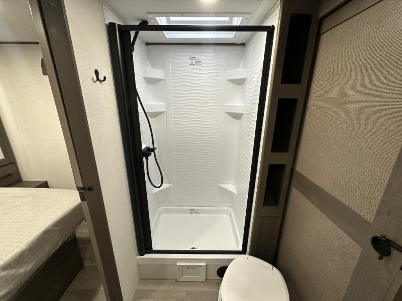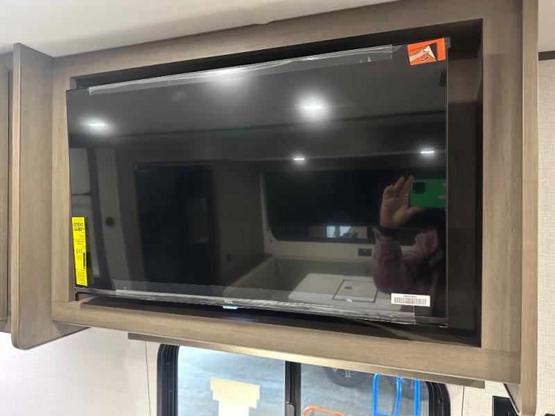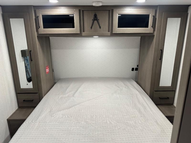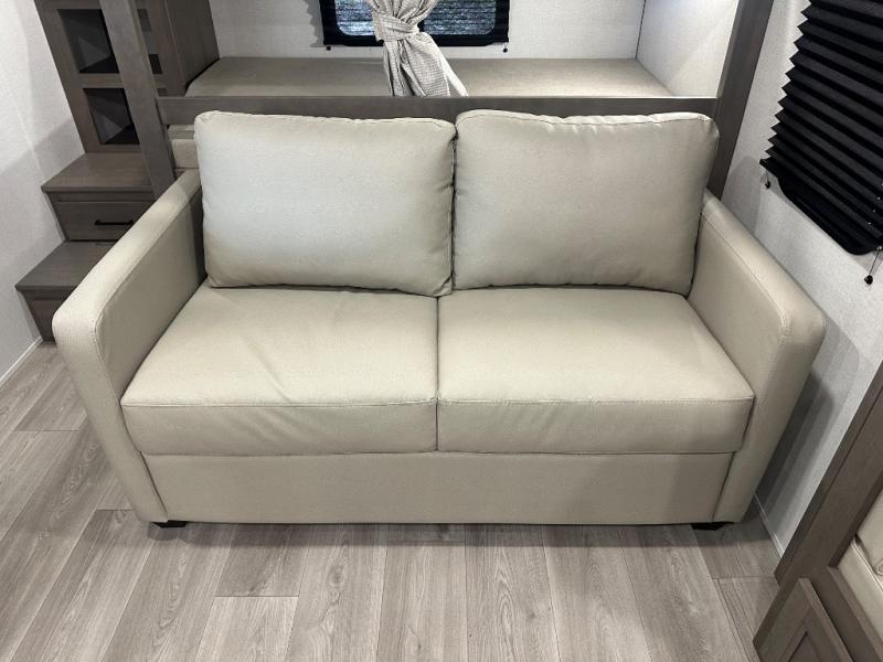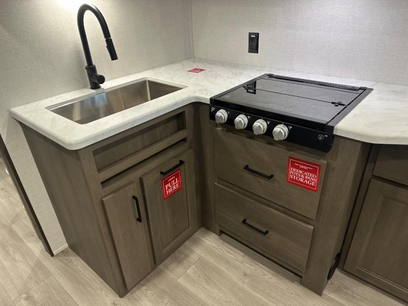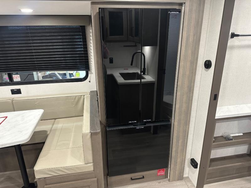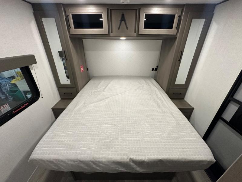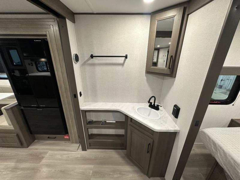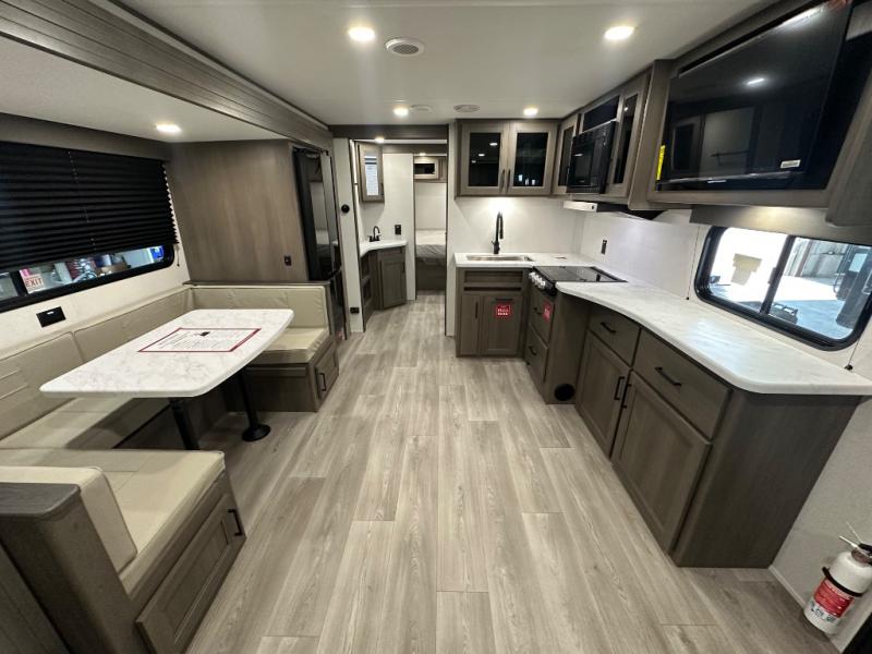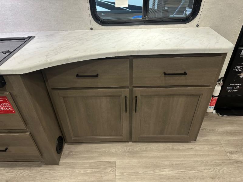 Your crew of eight will love camping in this spacious travel trailer! There are double-size bunks in the back with step storage and an added wardrobe for your guests' things plus exterior storage for camp gear galore. A walk-thru bath will create a front master bedroom you are sure to love, especially with its queen bed, wardrobe storage, and private exterior entry door! The main living area will be a favorite place to hang out with its U-shaped dinette, theater seating and 32" TV. If the weather is nice, you may just find yourselves outdoors since there is a rear exterior griddle and 1.7 cu. ft. refrigerator!