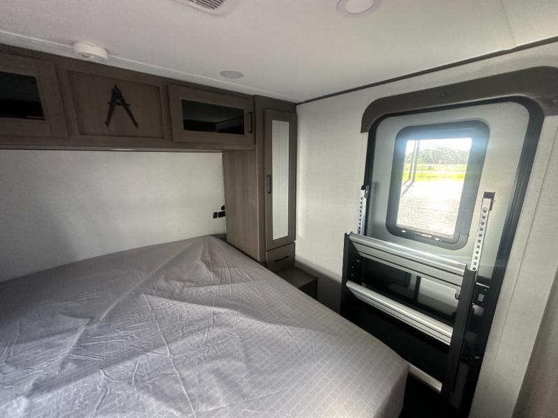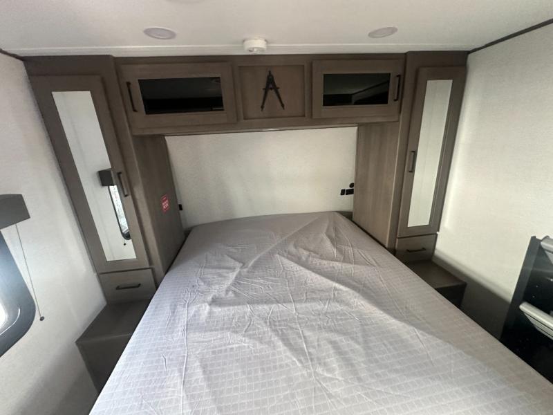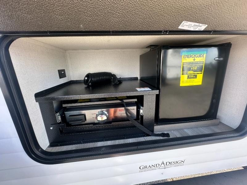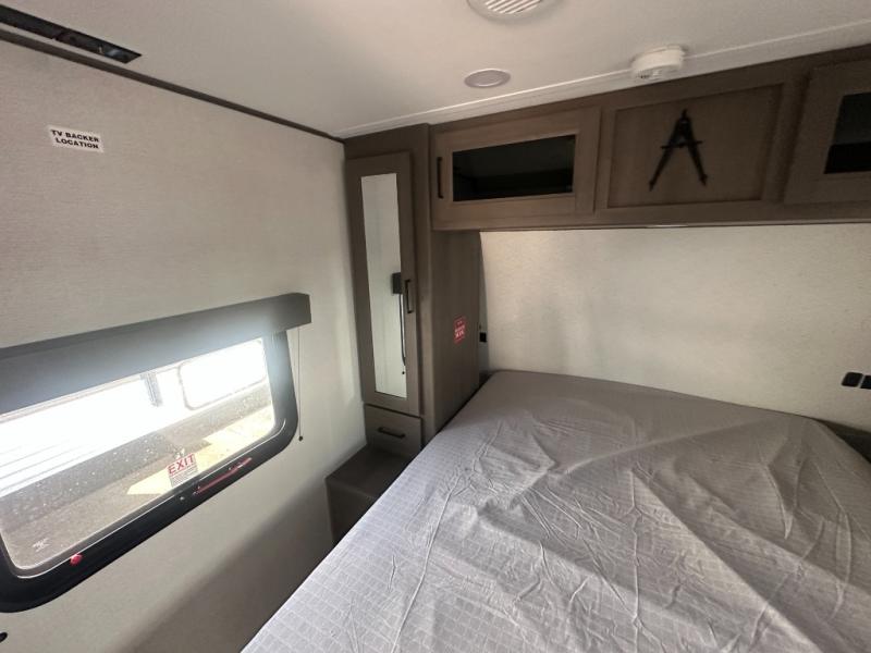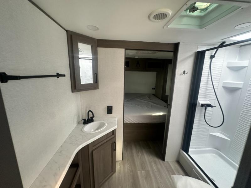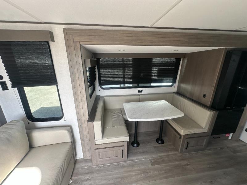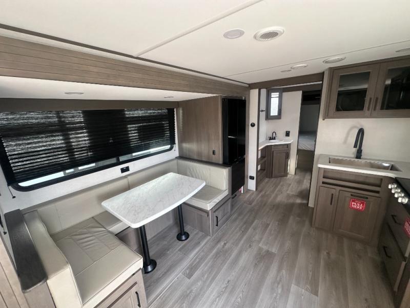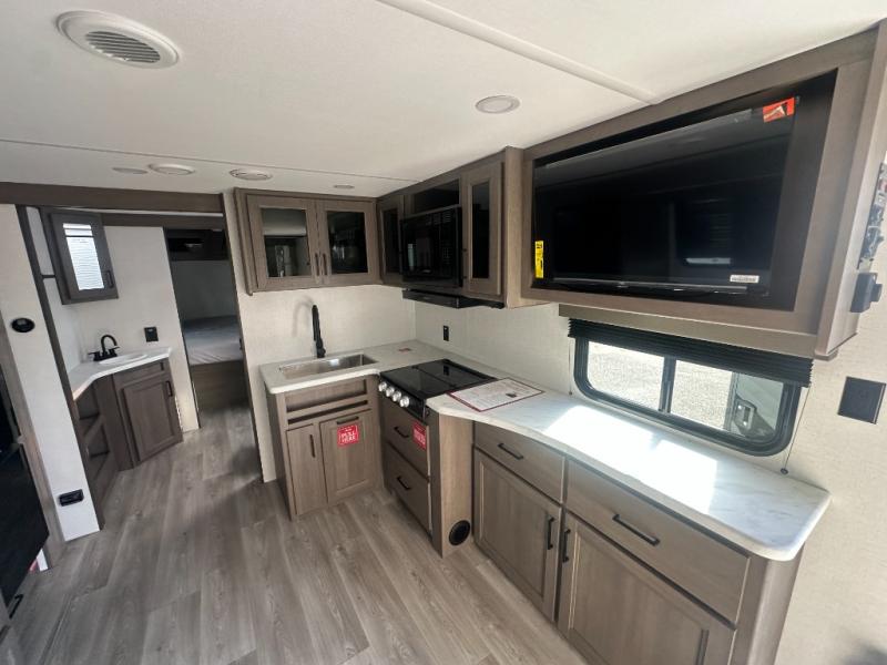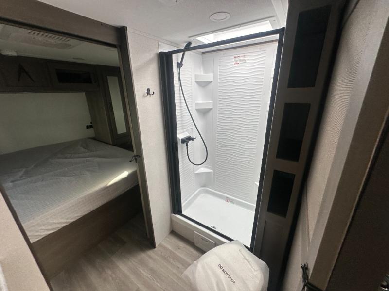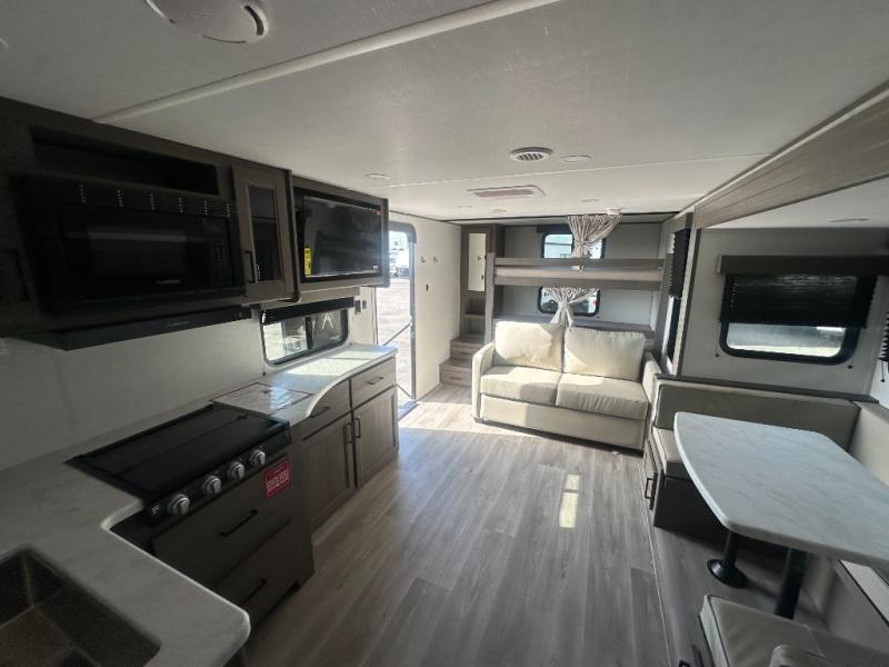 Your crew of eight will love camping in this spacious travel trailer! There are double-size bunks in the back with step storage and an added wardrobe for your guests' things plus exterior storage for camp gear galore. A walk-thru bath will create a front master bedroom you are sure to love, especially with its queen bed, wardrobe storage, and private exterior entry door! The main living area will be a favorite place to hang out with its U-shaped dinette, theater seating and 32" TV. If the weather is nice, you may just find yourselves outdoors since there is a rear exterior griddle and 1.7 cu. ft. refrigerator!