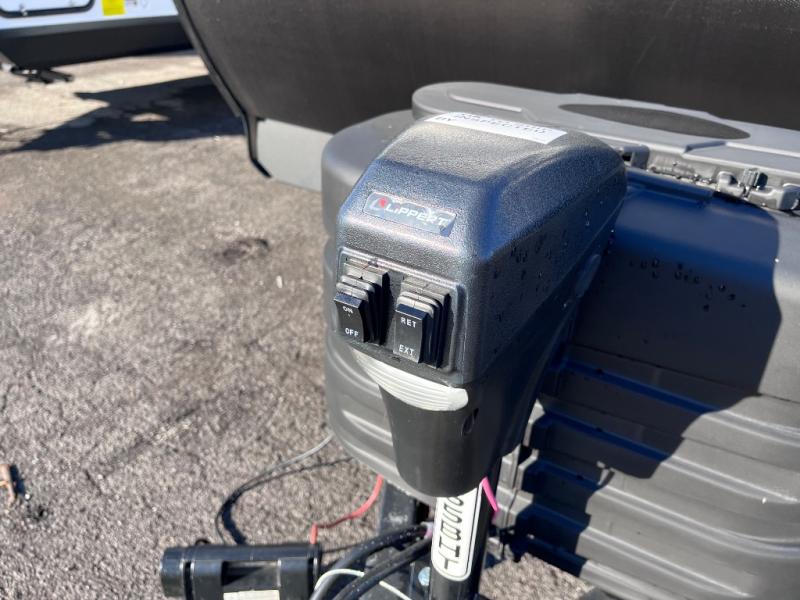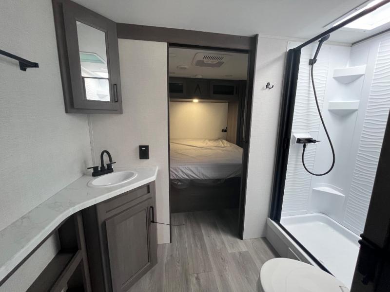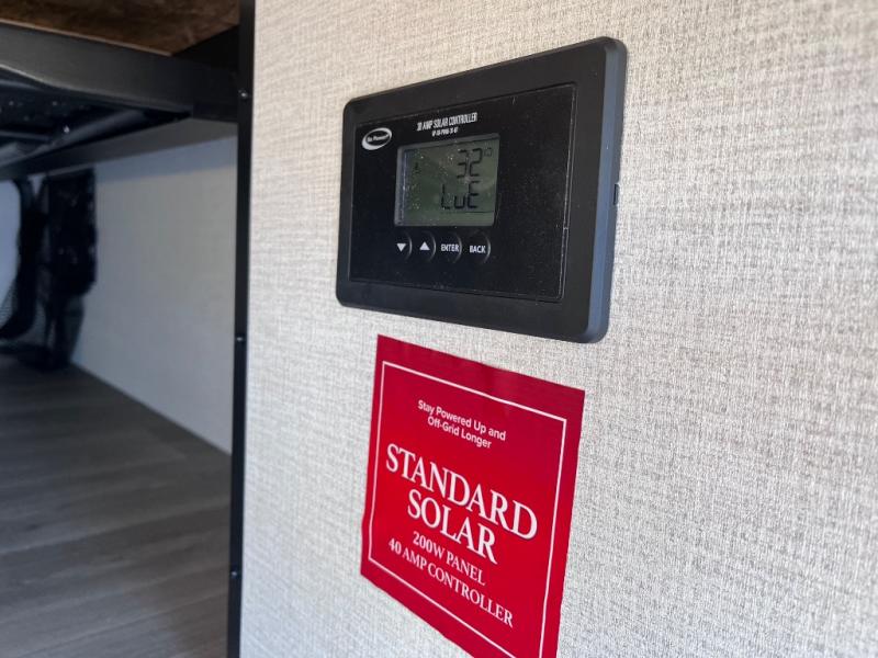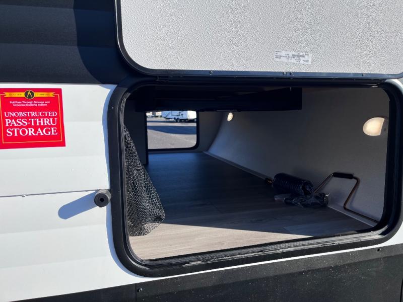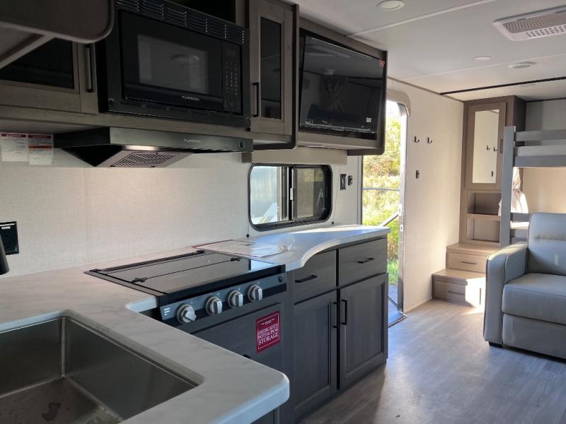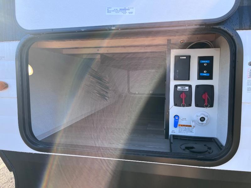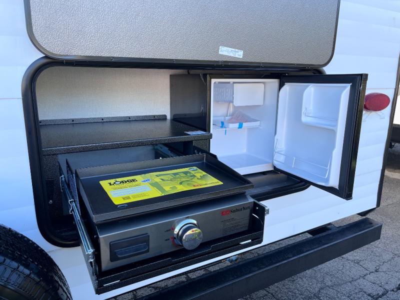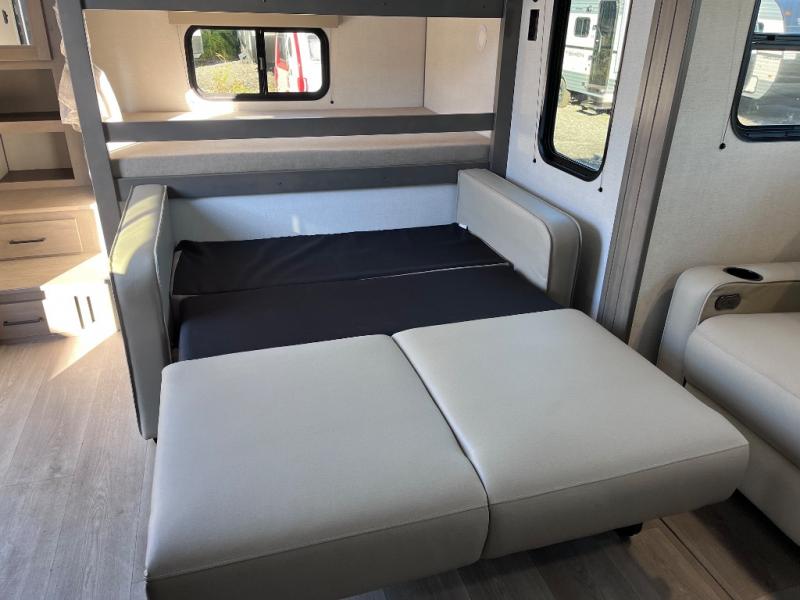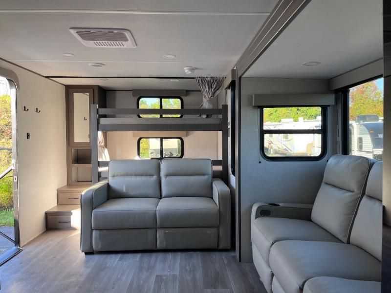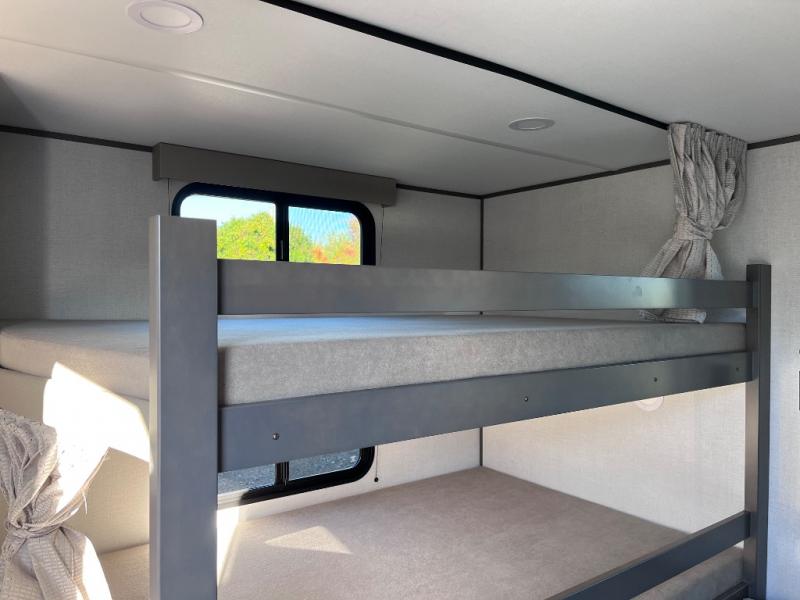 Your crew of eight will love camping in this spacious travel trailer! There are double-size bunks in the back with step storage and an added wardrobe for your guests' things plus exterior storage for camp gear galore. A walk-thru bath will create a front master bedroom you are sure to love, especially with its queen bed, wardrobe storage, and private exterior entry door! The main living area will be a favorite place to hang out with its U-shaped dinette, theater seating and 32" TV. If the weather is nice, you may just find yourselves outdoors since there is a rear exterior griddle and 1.7 cu. ft. refrigerator!
