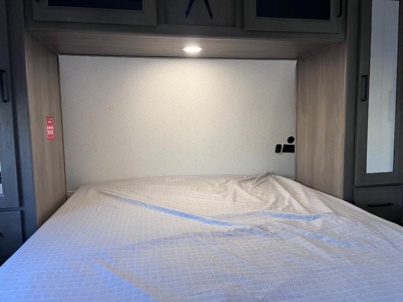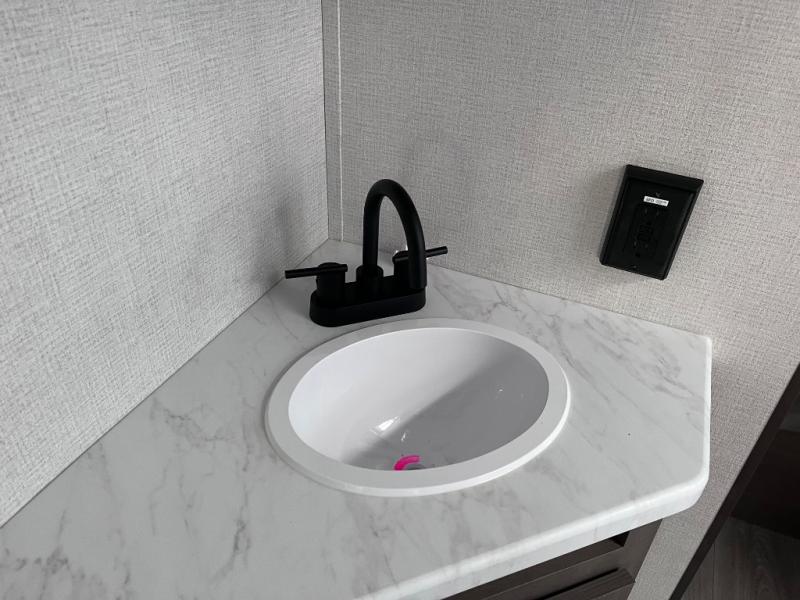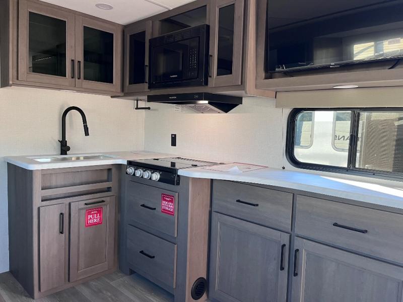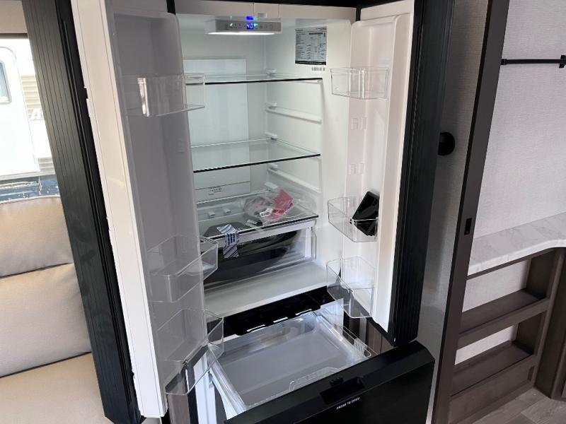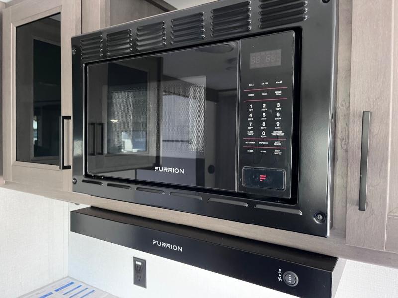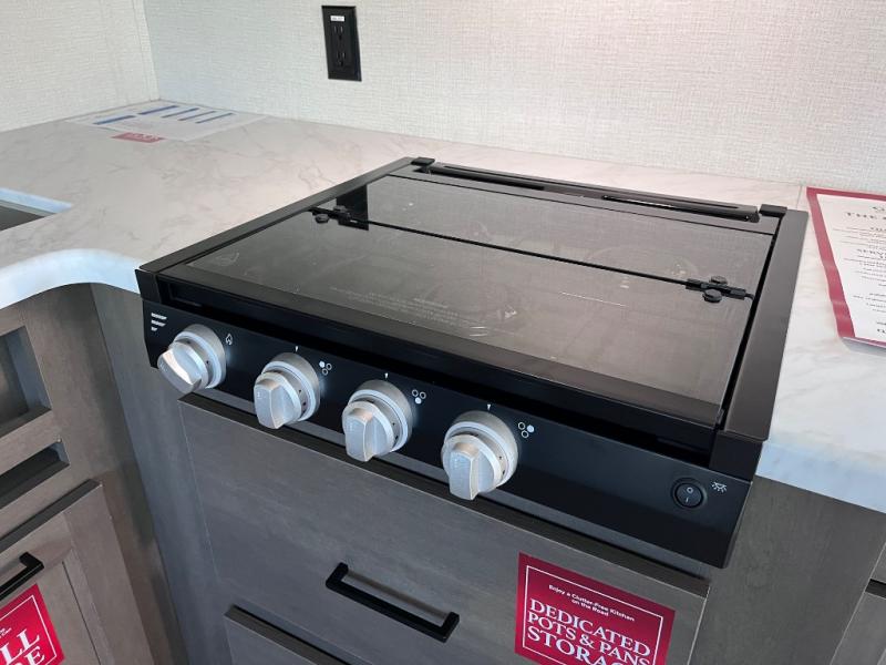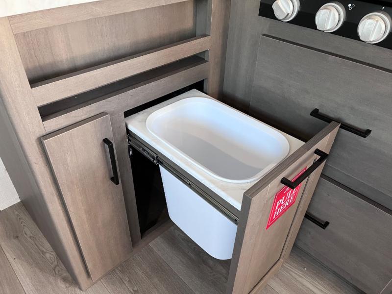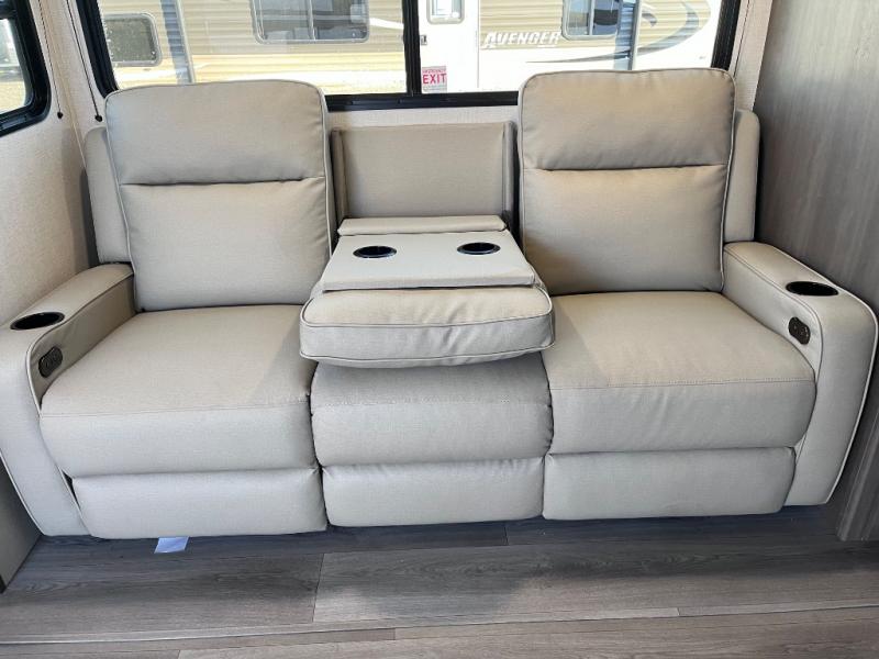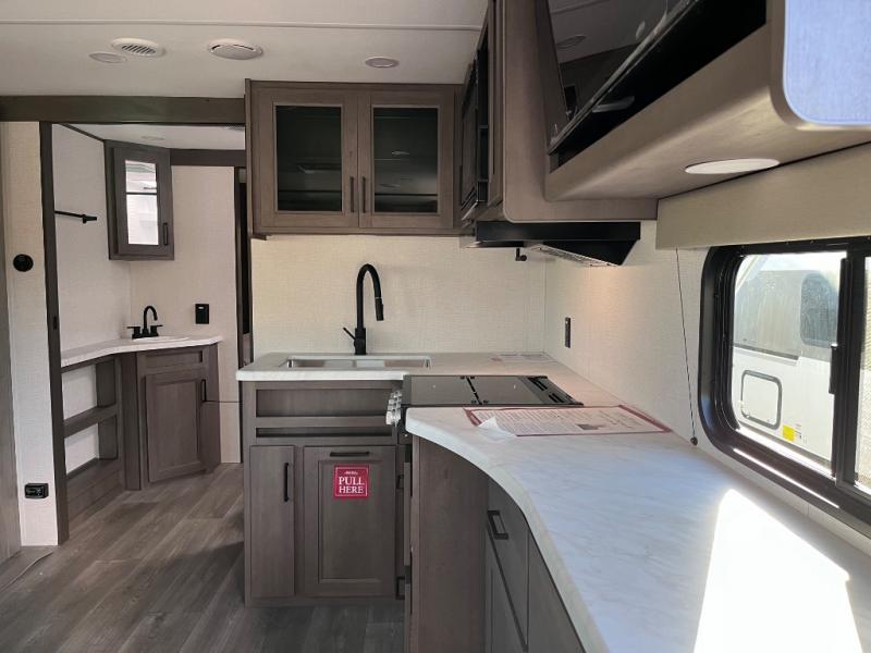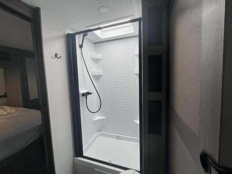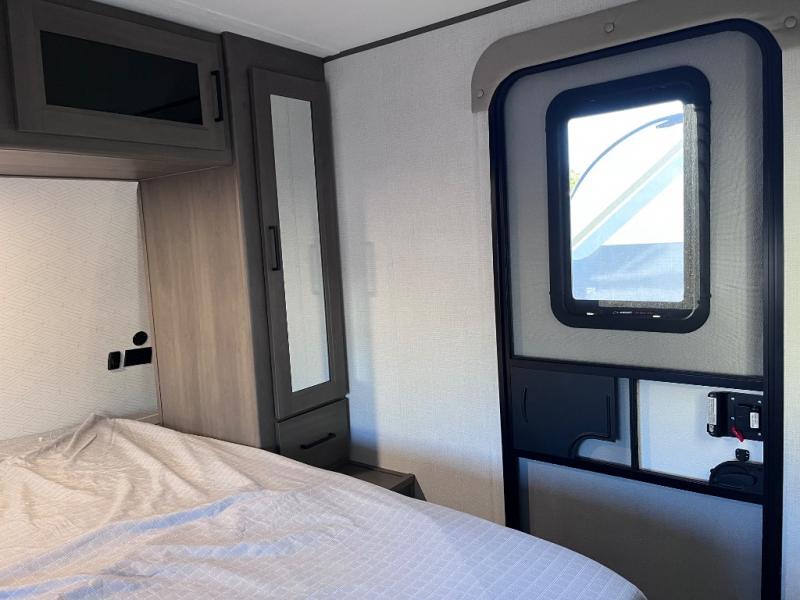 Your crew of eight will love camping in this spacious travel trailer! There are double-size bunks in the back with step storage and an added wardrobe for your guests' things plus exterior storage for camp gear galore. A walk-thru bath will create a front master bedroom you are sure to love, especially with its queen bed, wardrobe storage, and private exterior entry door! The main living area will be a favorite place to hang out with its U-shaped dinette, theater seating and 32" TV. If the weather is nice, you may just find yourselves outdoors since there is a rear exterior griddle and 1.7 cu. ft. refrigerator!