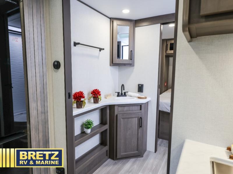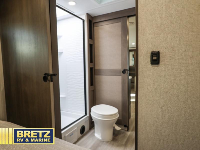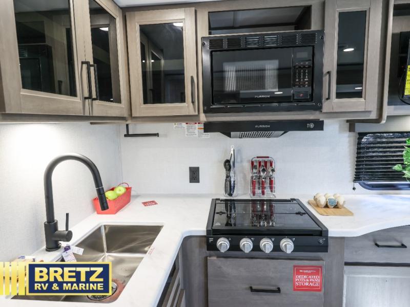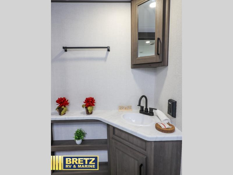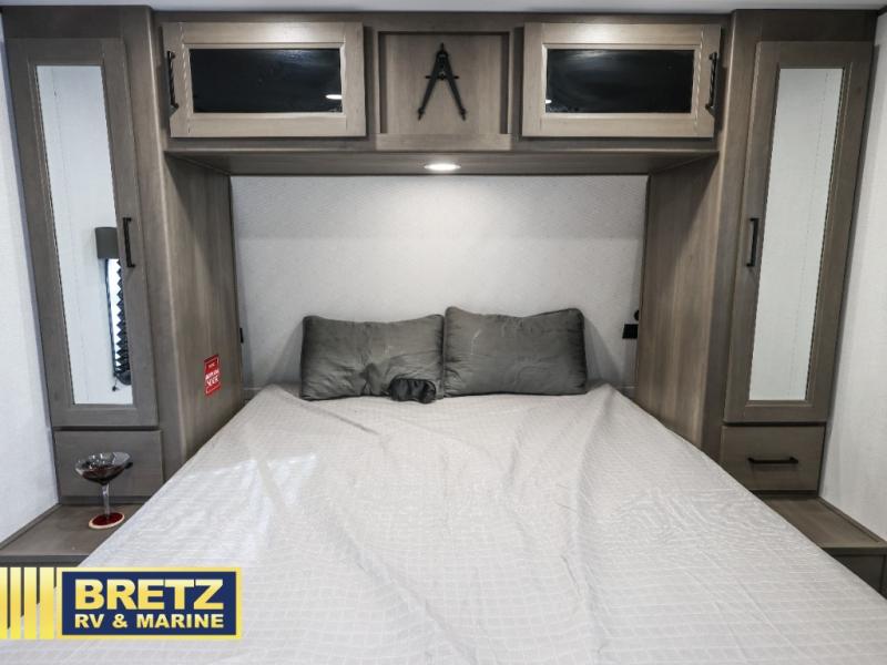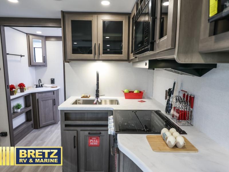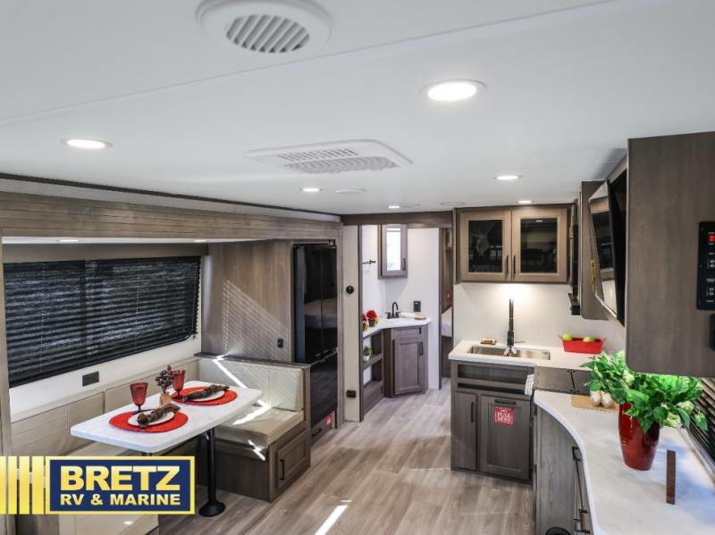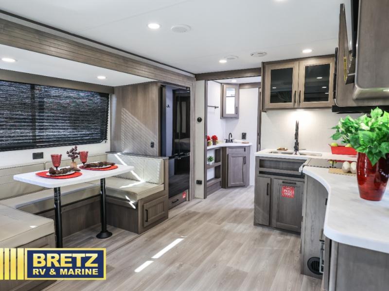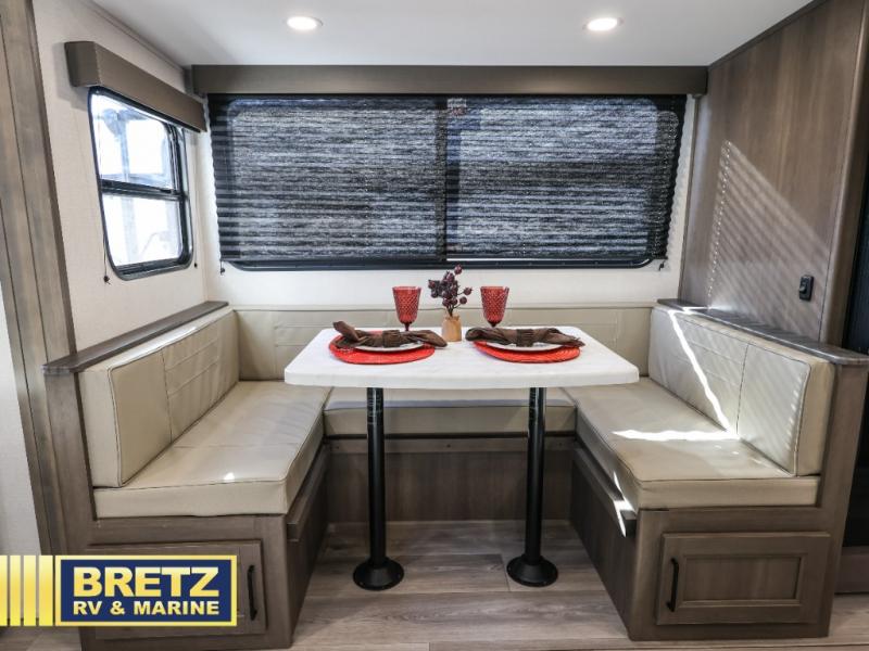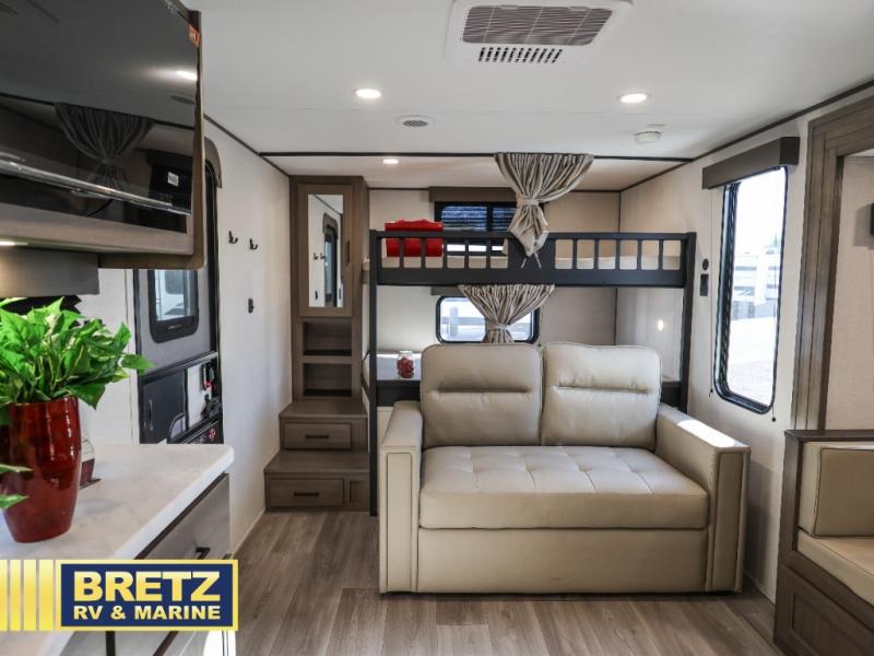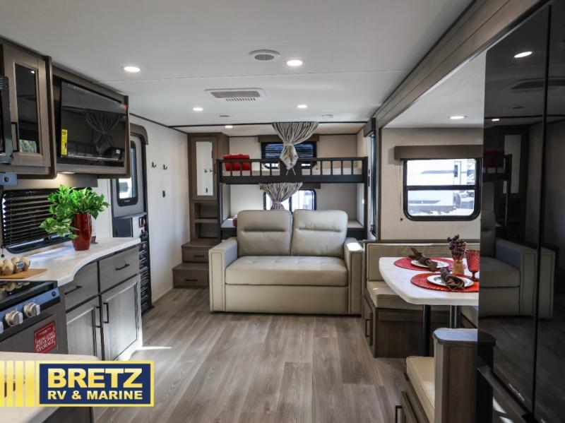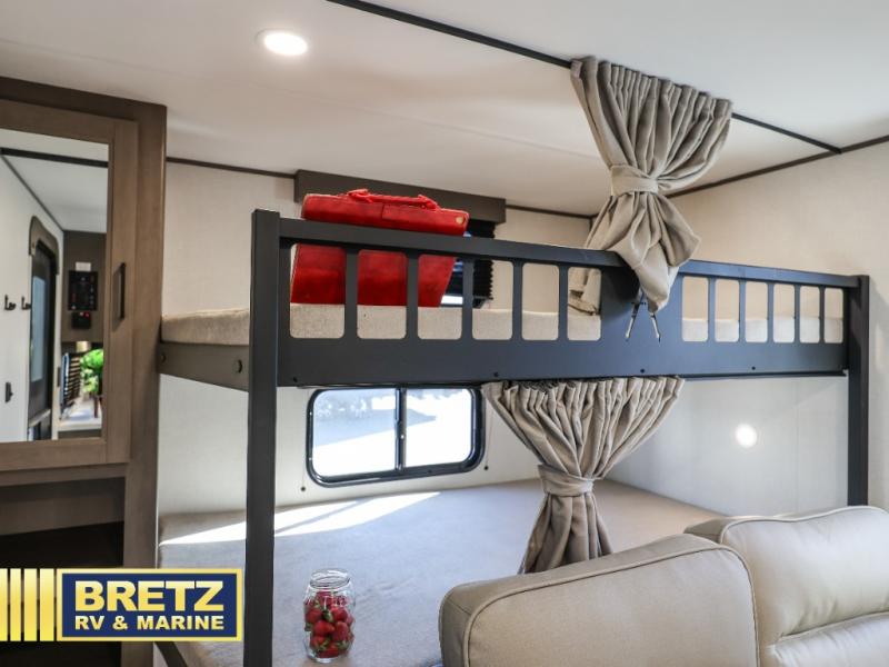 Your crew of eight will love camping in this spacious travel trailer! There are double-size bunks in the back with step storage and an added wardrobe for your guests' things plus exterior storage for camp gear galore. A walk-thru bath will create a front master bedroom you are sure to love, especially with its queen bed, wardrobe storage, and private exterior entry door! The main living area will be a favorite place to hang out with its U-shaped dinette, theater seating and 32" TV. If the weather is nice, you may just find yourselves outdoors since there is a rear exterior griddle and 1.7 cu. ft. refrigerator!
