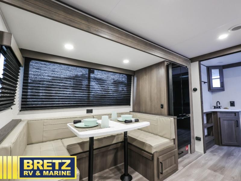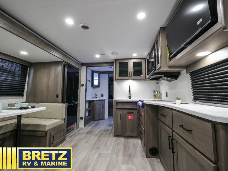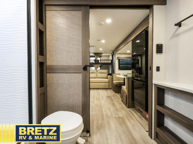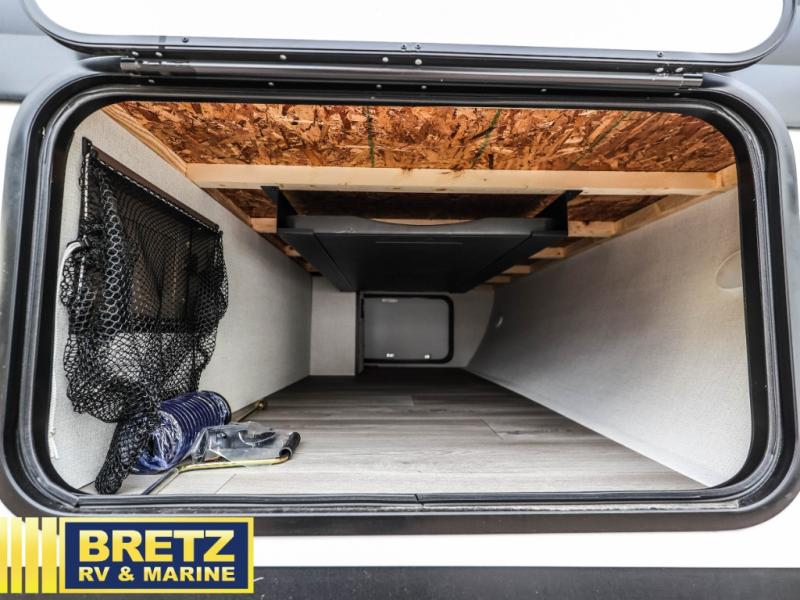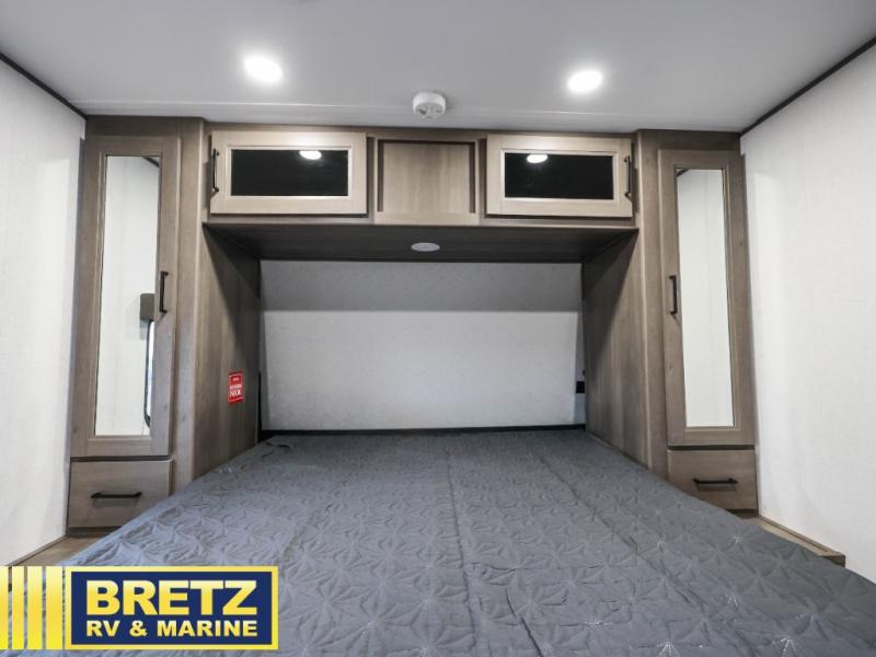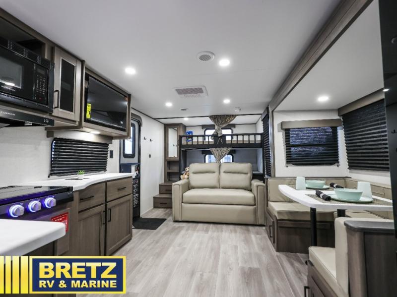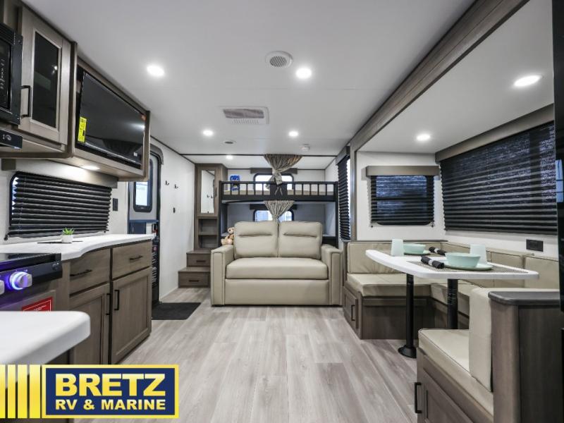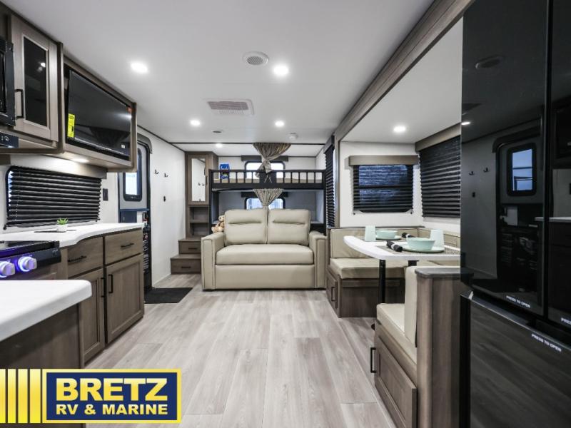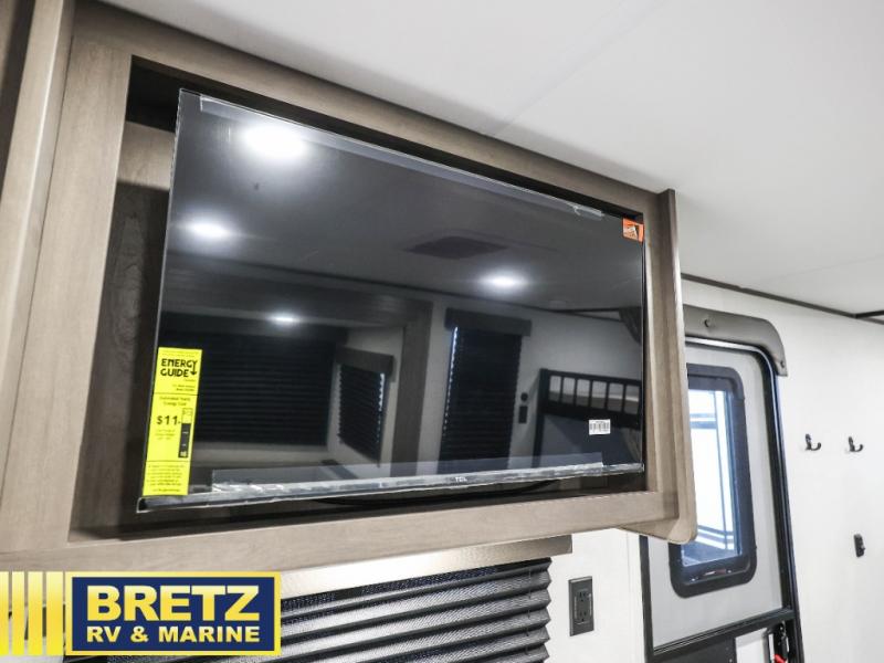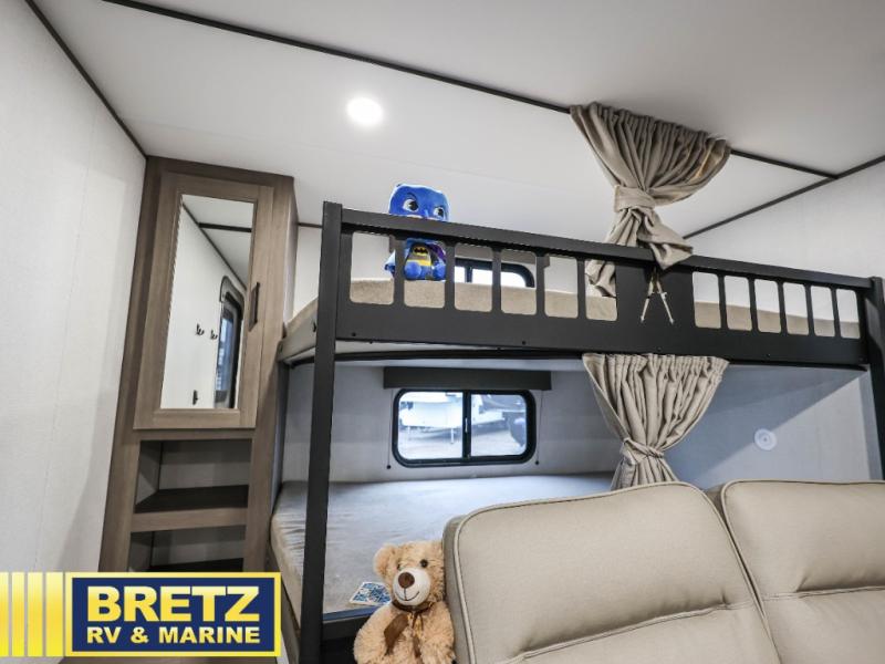 Your crew of eight will love camping in this spacious travel trailer! There are double-size bunks in the back with step storage and an added wardrobe for your guests' things plus exterior storage for camp gear galore. A walk-thru bath will create a front master bedroom you are sure to love, especially with its queen bed, wardrobe storage, and private exterior entry door! The main living area will be a favorite place to hang out with its U-shaped dinette, theater seating and 32" TV. If the weather is nice, you may just find yourselves outdoors since there is a rear exterior griddle and 1.7 cu. ft. refrigerator!