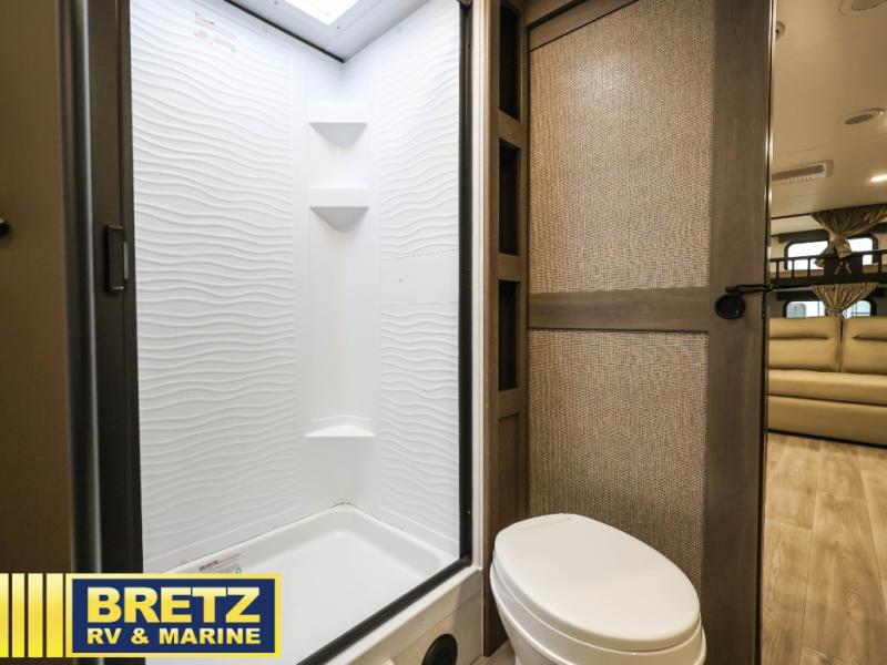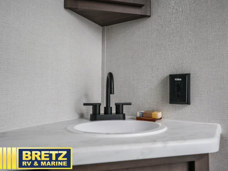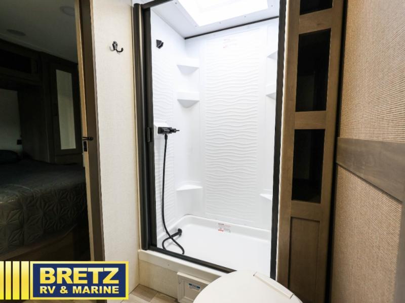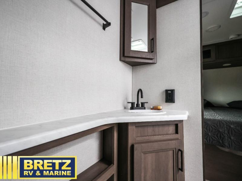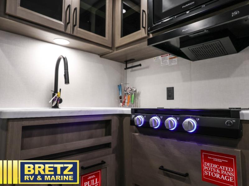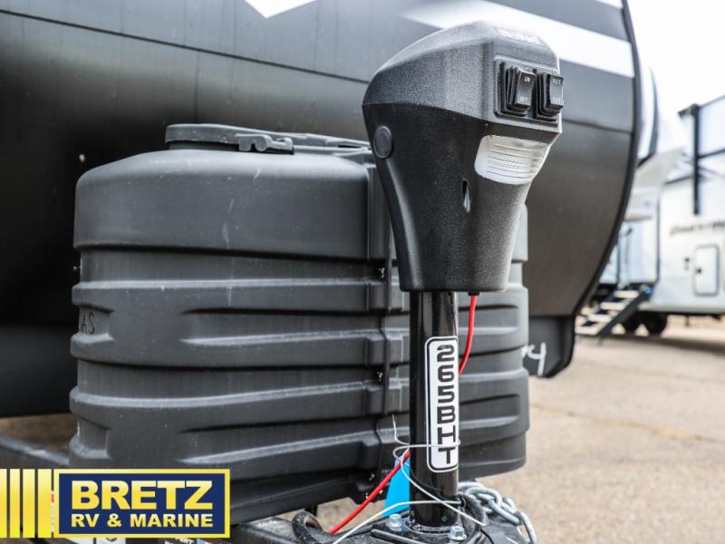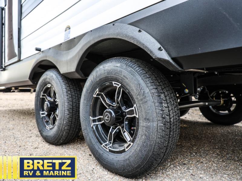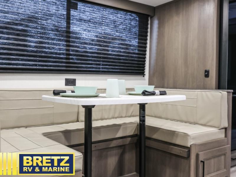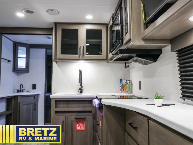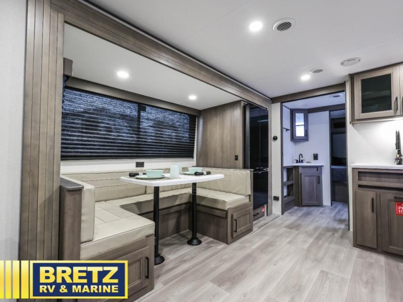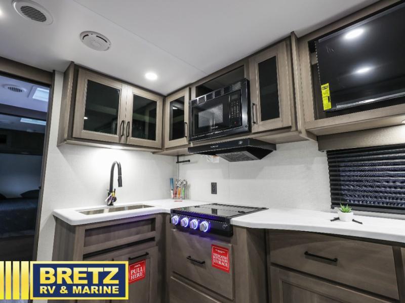 Your crew of eight will love camping in this spacious travel trailer! There are double-size bunks in the back with step storage and an added wardrobe for your guests' things plus exterior storage for camp gear galore. A walk-thru bath will create a front master bedroom you are sure to love, especially with its queen bed, wardrobe storage, and private exterior entry door! The main living area will be a favorite place to hang out with its U-shaped dinette, theater seating and 32" TV. If the weather is nice, you may just find yourselves outdoors since there is a rear exterior griddle and 1.7 cu. ft. refrigerator!