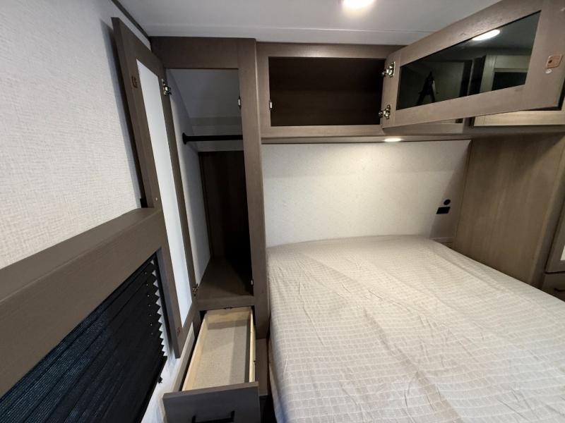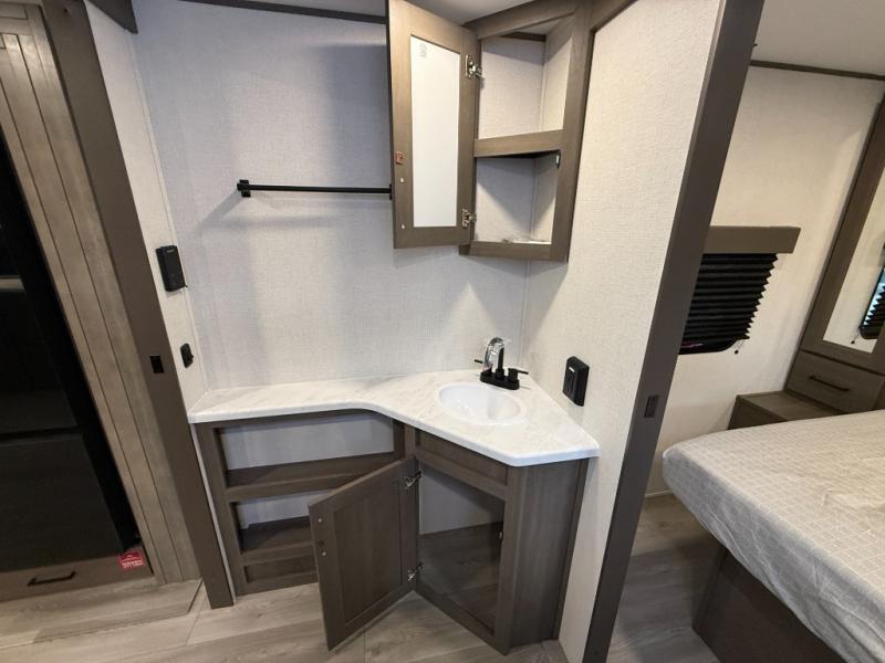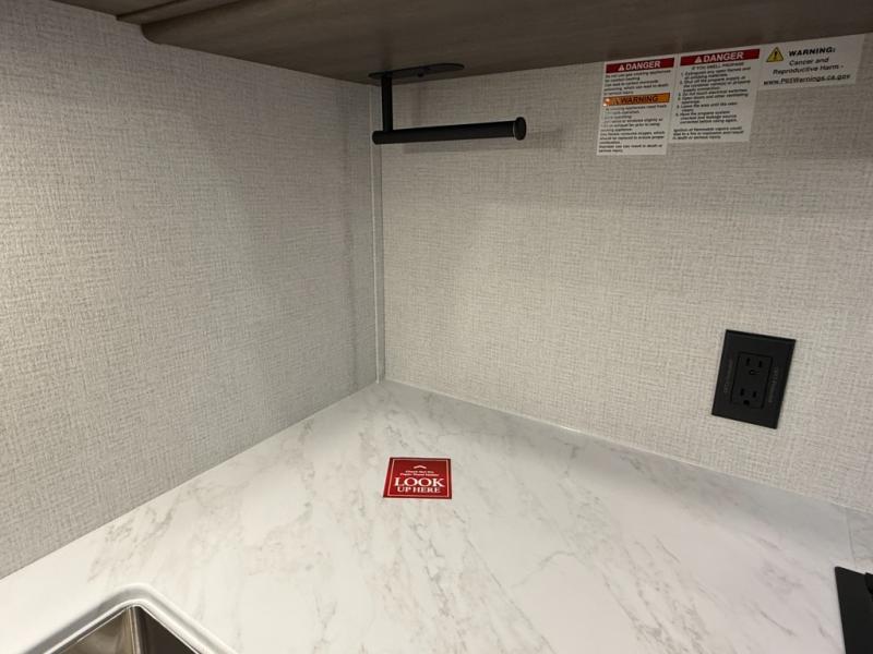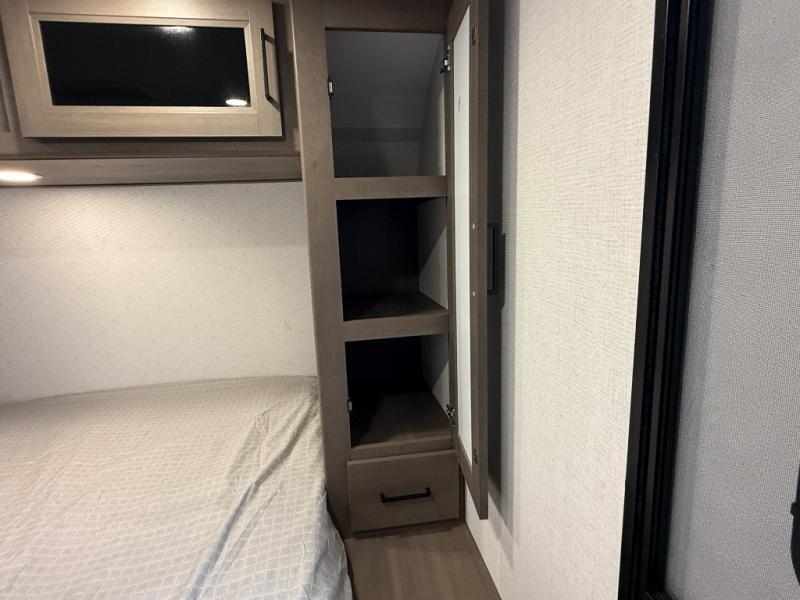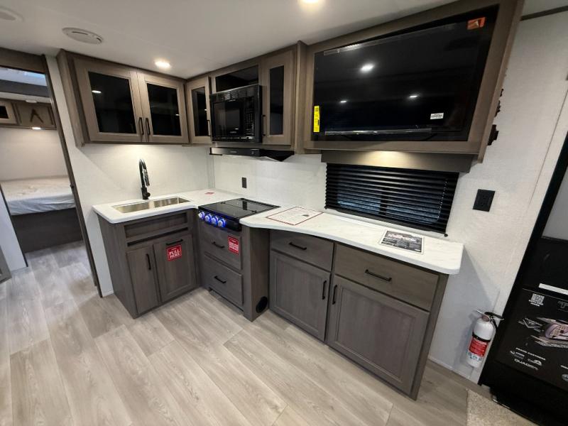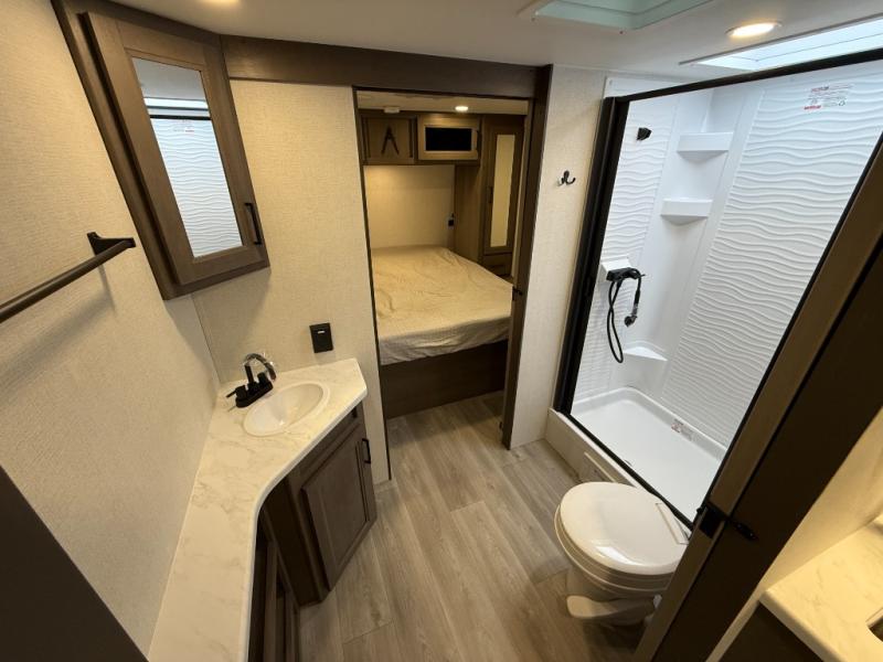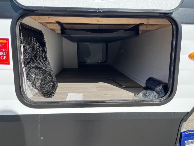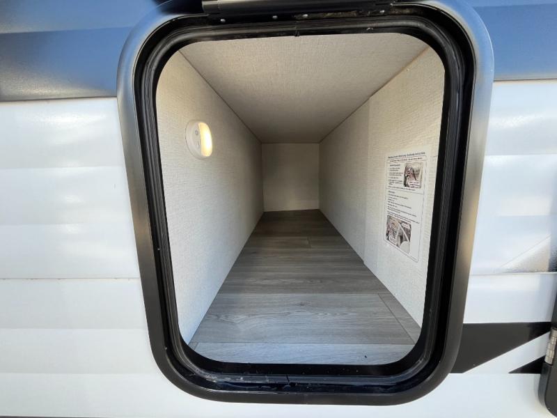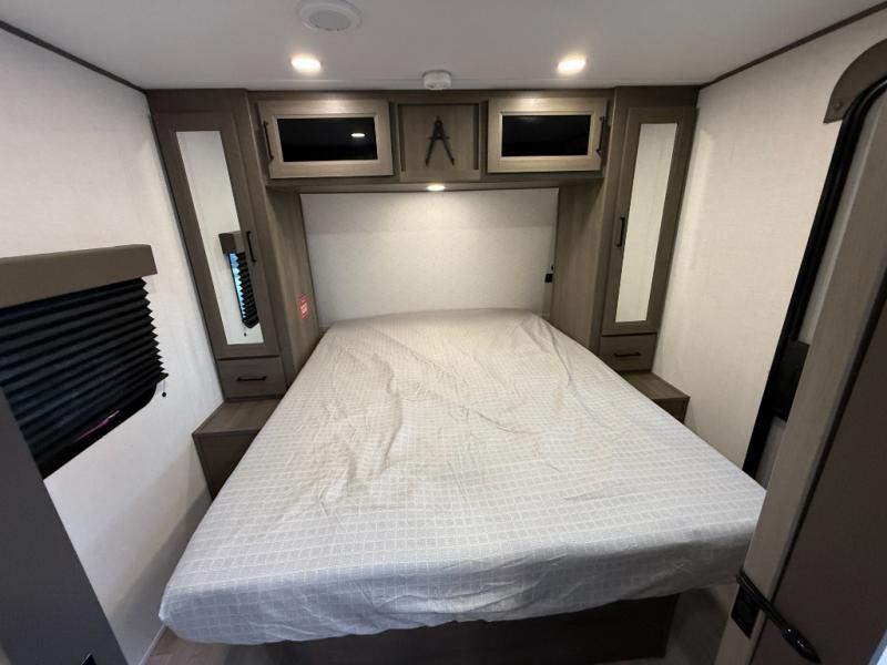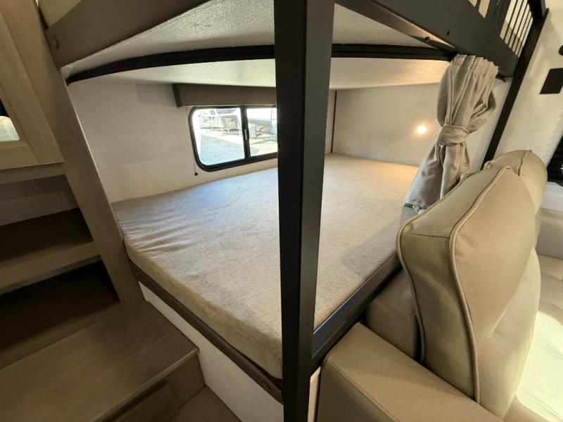Your crew of eight will love camping in this spacious travel trailer! There are double-size bunks in the back with step storage and an added wardrobe for your guests' things plus exterior storage for camp gear galore. A walk-thru bath will create a front master bedroom you are sure to love, especially with its queen bed, wardrobe storage, and private exterior entry door! The main living area will be a favorite place to hang out with its U-shaped dinette, theater seating and 32" TV. If the weather is nice, you may just find yourselves outdoors since there is a rear exterior griddle and 1.7 cu. ft. refrigerator!