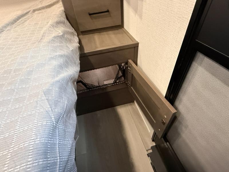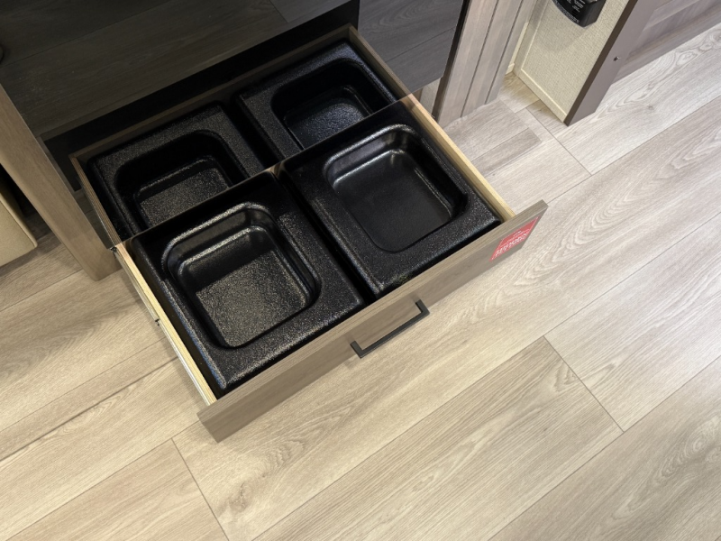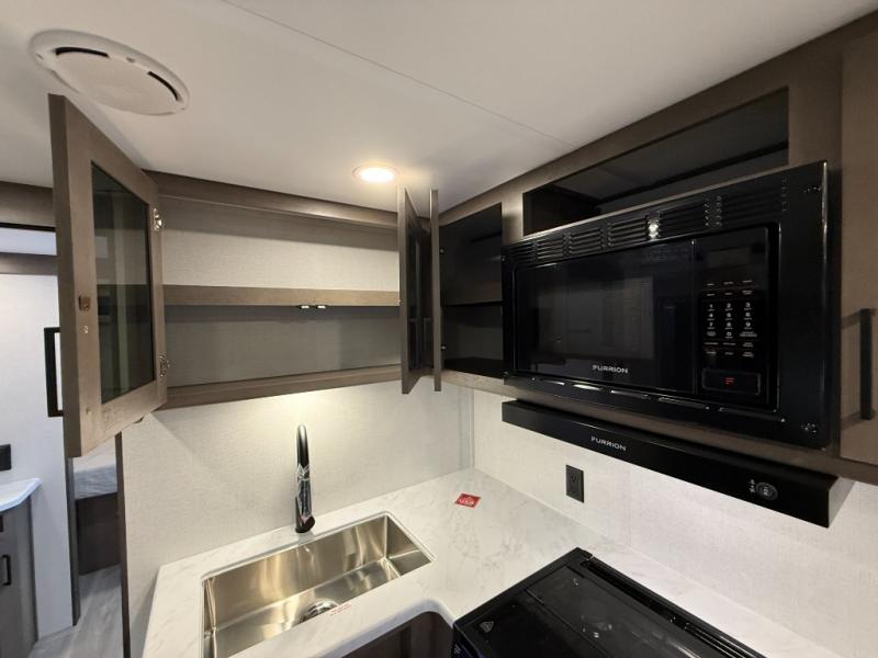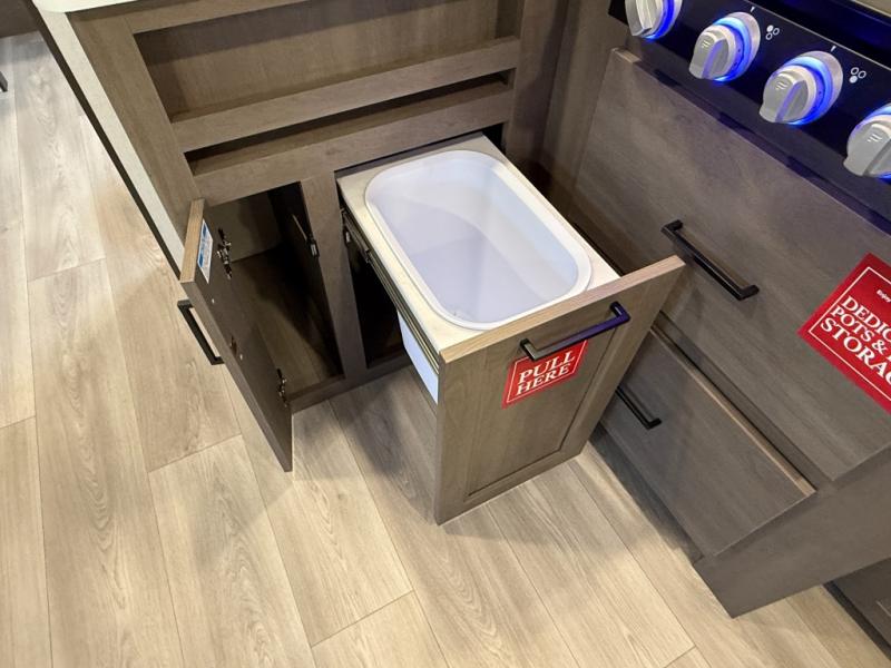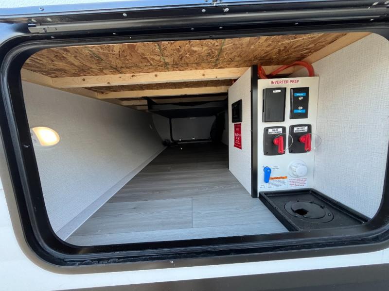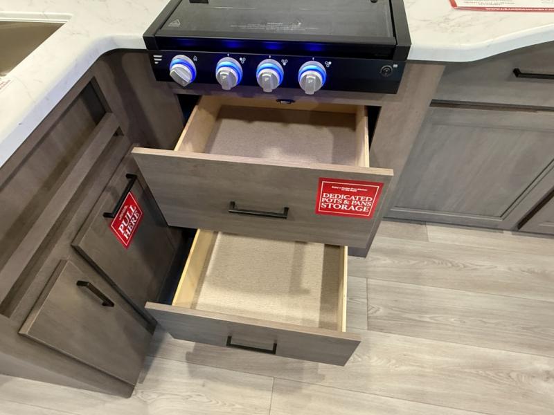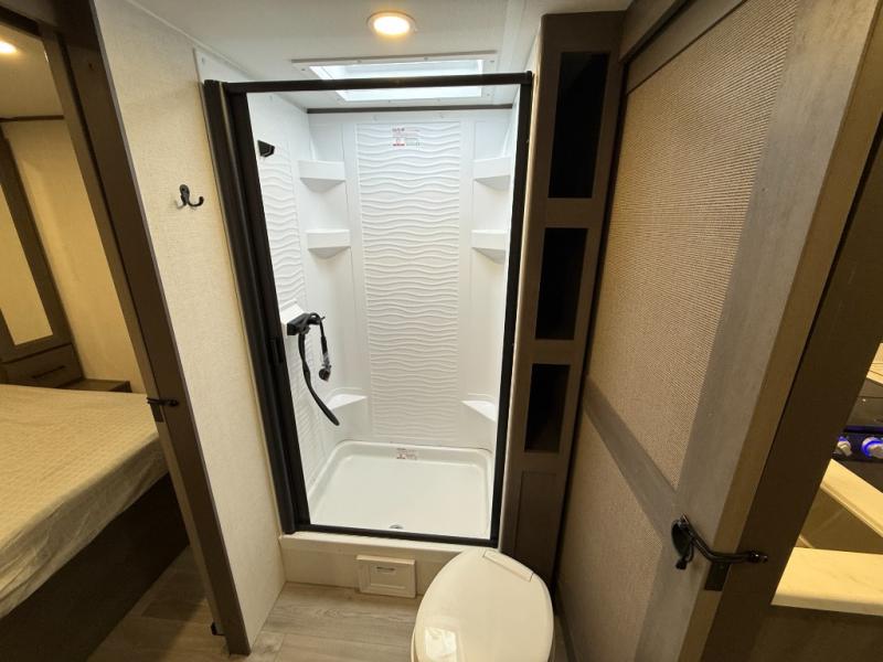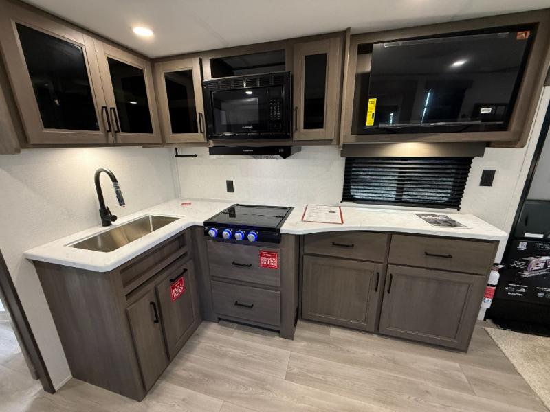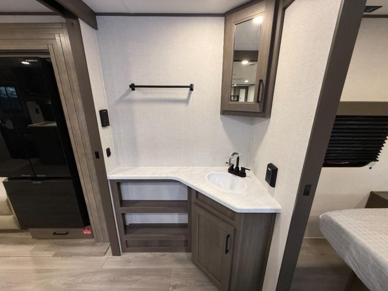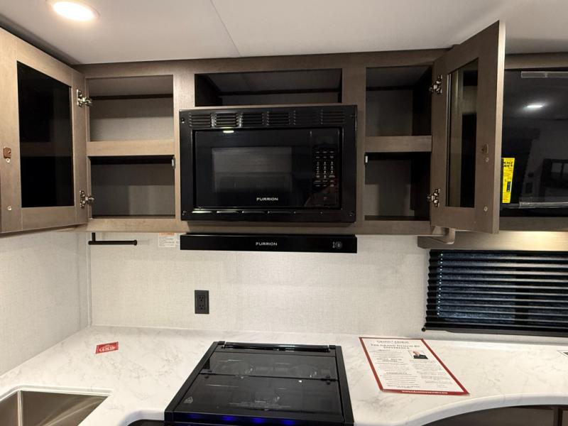 Your crew of eight will love camping in this spacious travel trailer! There are double-size bunks in the back with step storage and an added wardrobe for your guests' things plus exterior storage for camp gear galore. A walk-thru bath will create a front master bedroom you are sure to love, especially with its queen bed, wardrobe storage, and private exterior entry door! The main living area will be a favorite place to hang out with its U-shaped dinette, theater seating and 32" TV. If the weather is nice, you may just find yourselves outdoors since there is a rear exterior griddle and 1.7 cu. ft. refrigerator!