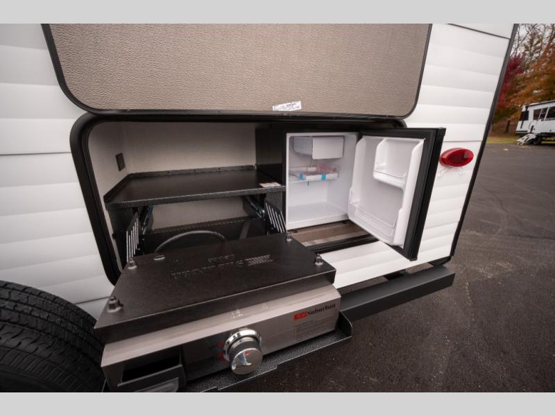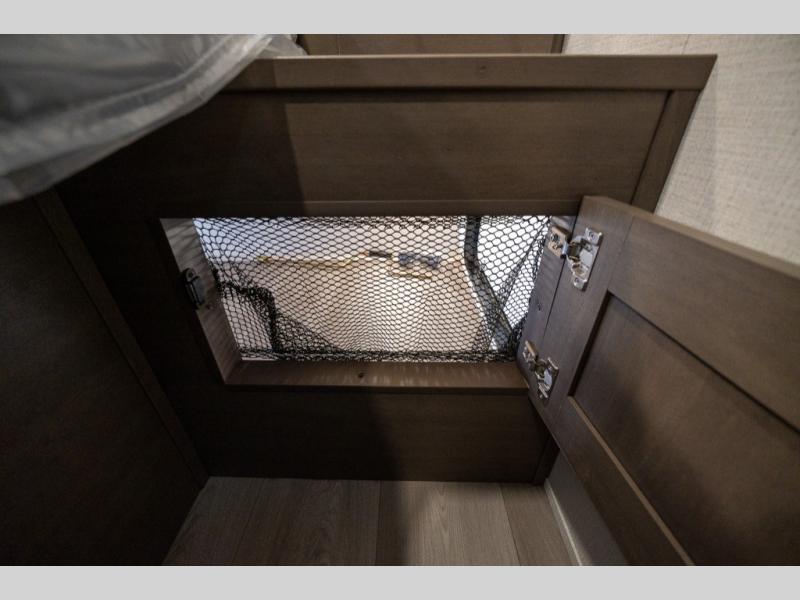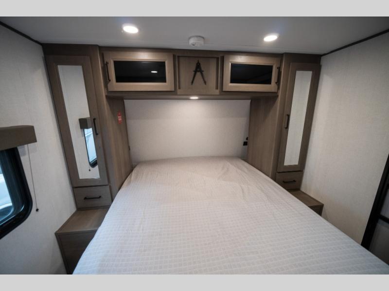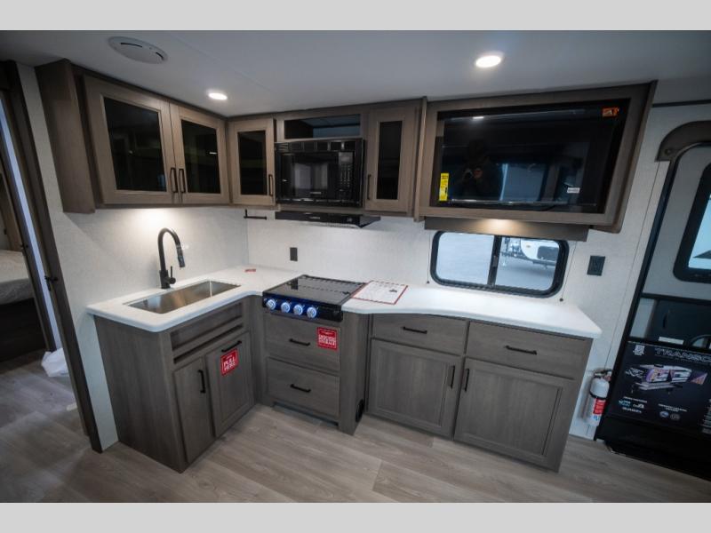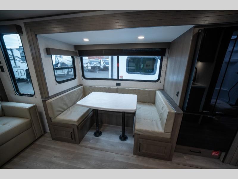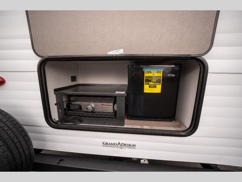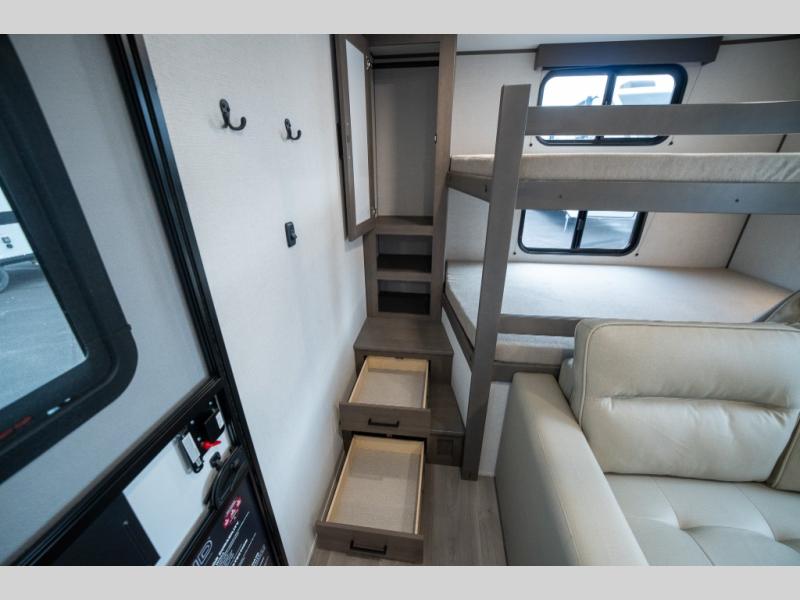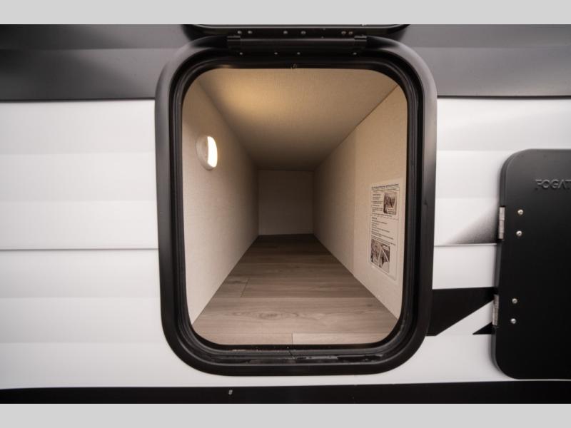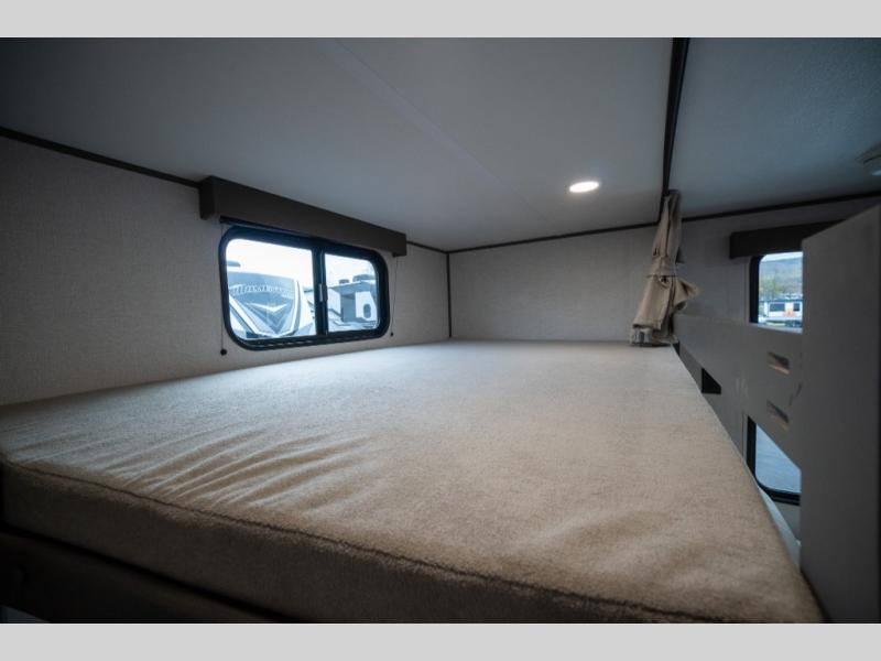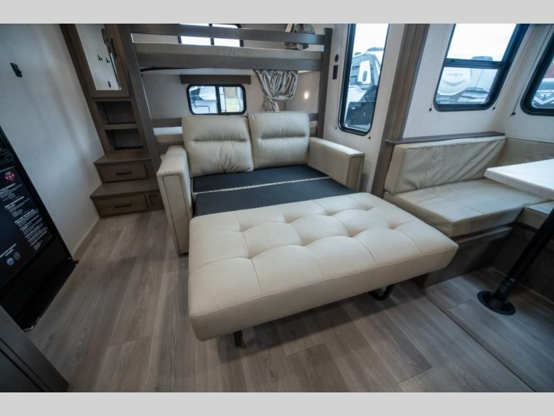 Your crew of eight will love camping in this spacious travel trailer! There are double-size bunks in the back with step storage and an added wardrobe for your guests' things plus exterior storage for camp gear galore. A walk-thru bath will create a front master bedroom you are sure to love, especially with its queen bed, wardrobe storage, and private exterior entry door! The main living area will be a favorite place to hang out with its U-shaped dinette, theater seating and 32" TV. If the weather is nice, you may just find yourselves outdoors since there is a rear exterior griddle and 1.7 cu. ft. refrigerator!