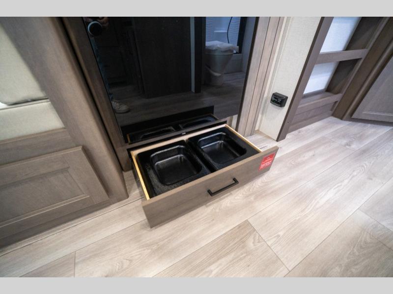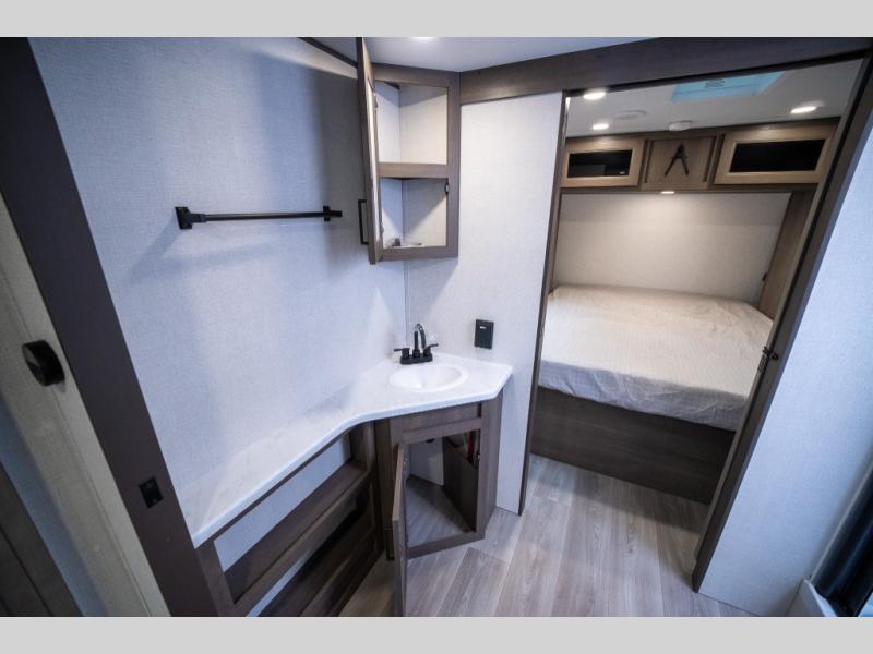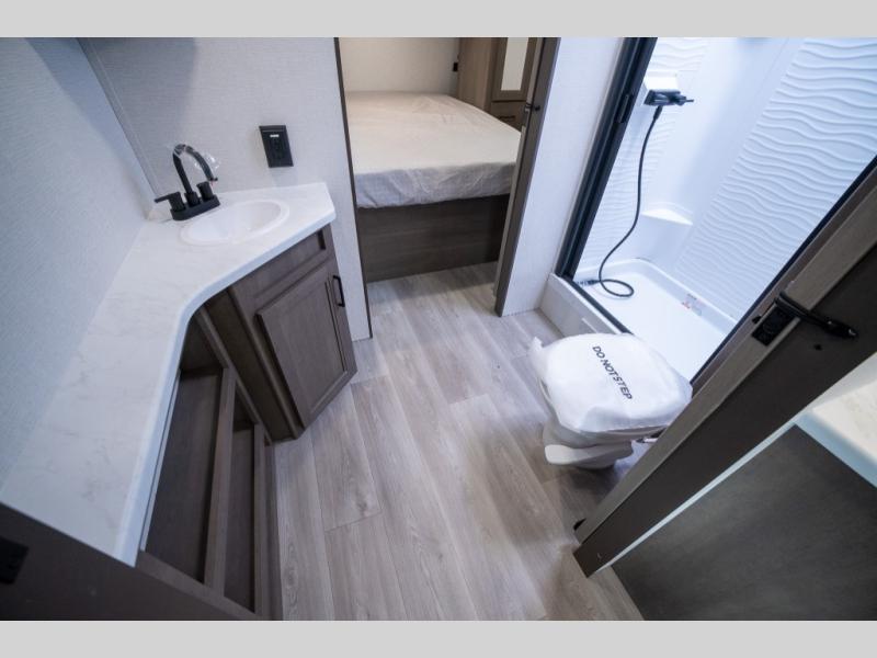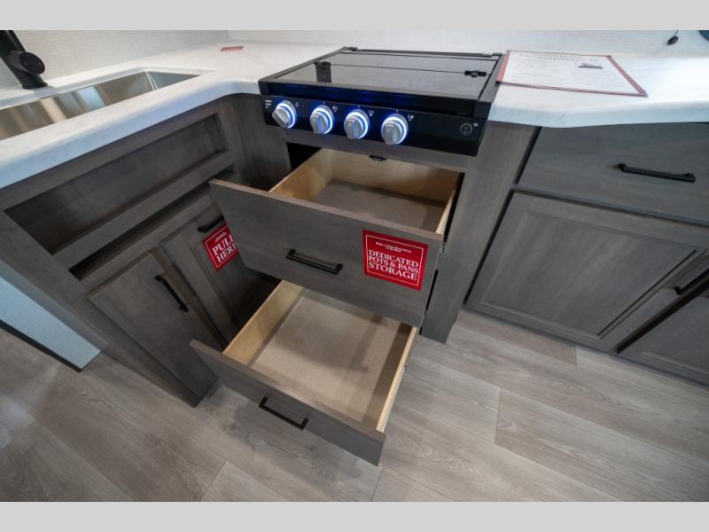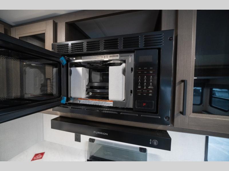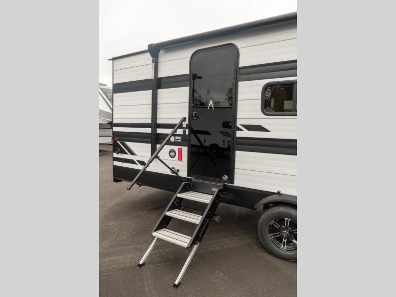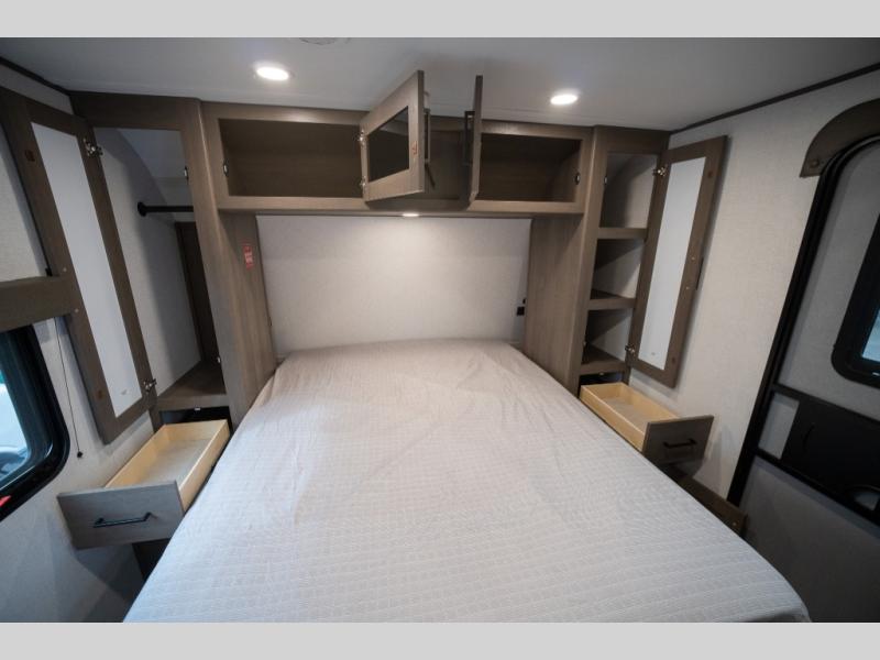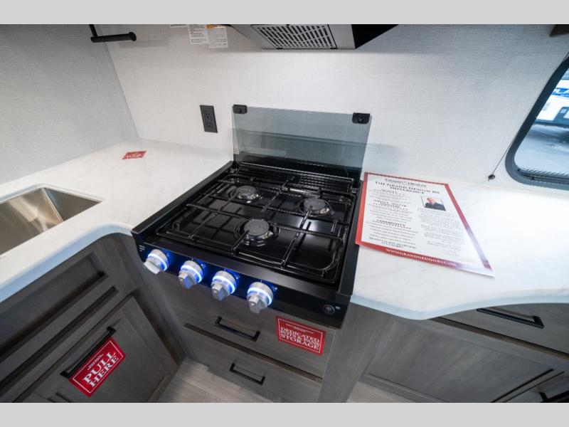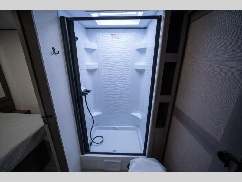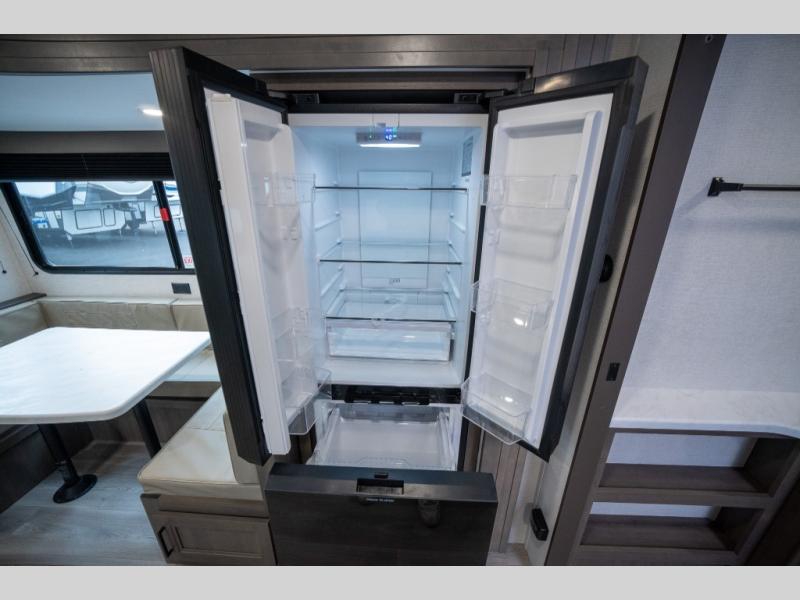 Your crew of eight will love camping in this spacious travel trailer! There are double-size bunks in the back with step storage and an added wardrobe for your guests' things plus exterior storage for camp gear galore. A walk-thru bath will create a front master bedroom you are sure to love, especially with its queen bed, wardrobe storage, and private exterior entry door! The main living area will be a favorite place to hang out with its U-shaped dinette, theater seating and 32" TV. If the weather is nice, you may just find yourselves outdoors since there is a rear exterior griddle and 1.7 cu. ft. refrigerator!
