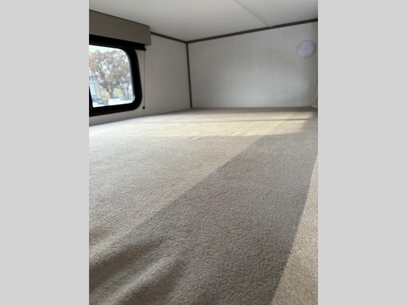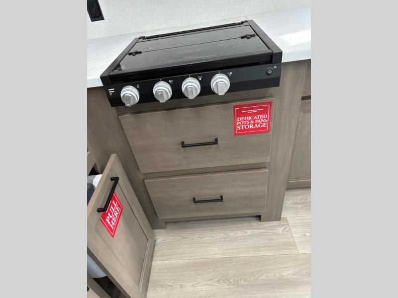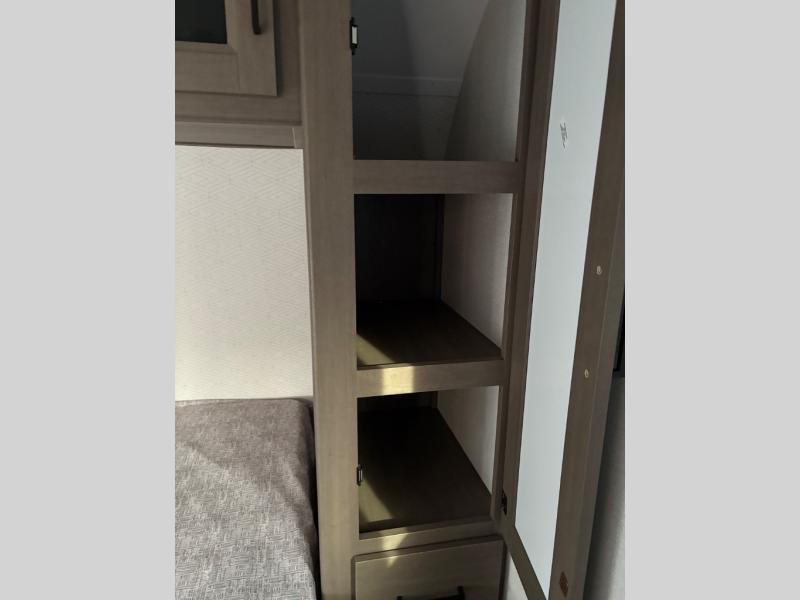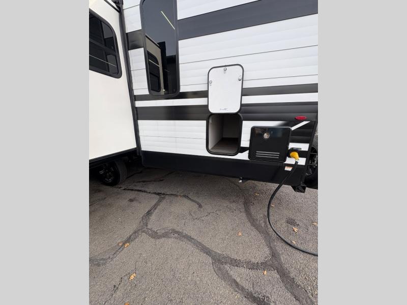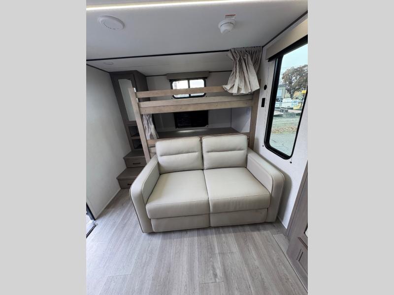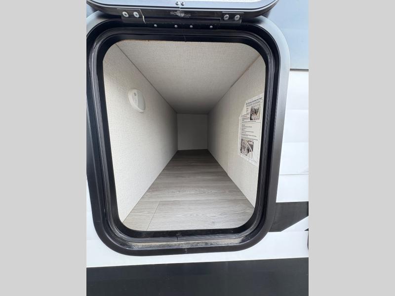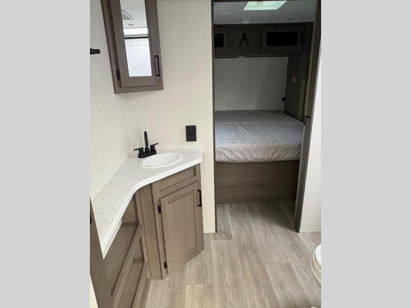 Your crew of eight will love camping in this spacious travel trailer! There are double-size bunks in the back with step storage and an added wardrobe for your guests' things plus exterior storage for camp gear galore. A walk-thru bath will create a front master bedroom you are sure to love, especially with its queen bed, wardrobe storage, and private exterior entry door! The main living area will be a favorite place to hang out with its U-shaped dinette, theater seating and 32" TV. If the weather is nice, you may just find yourselves outdoors since there is a rear exterior griddle and 1.7 cu. ft. refrigerator!