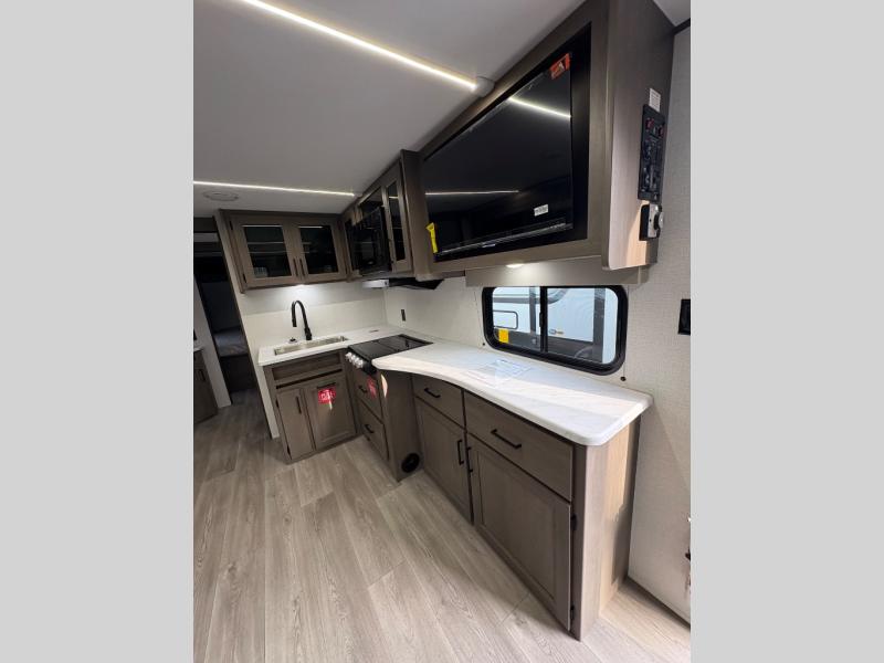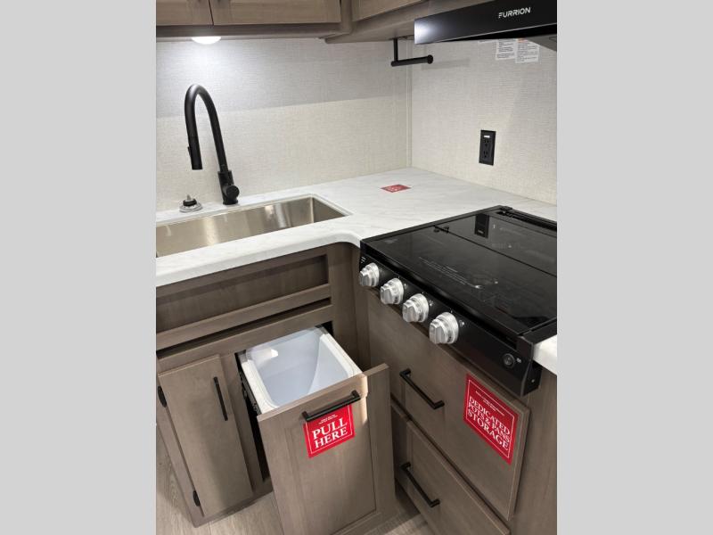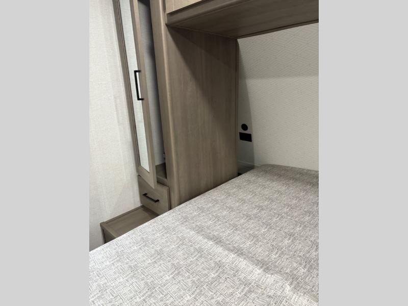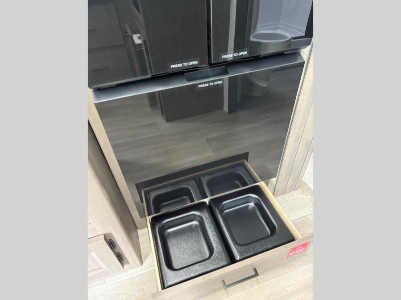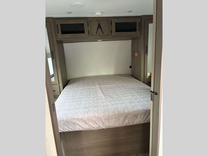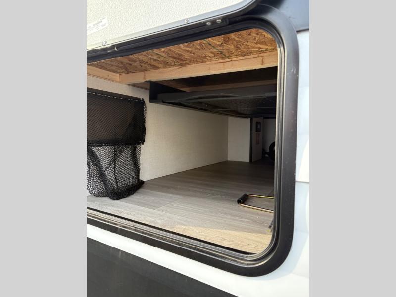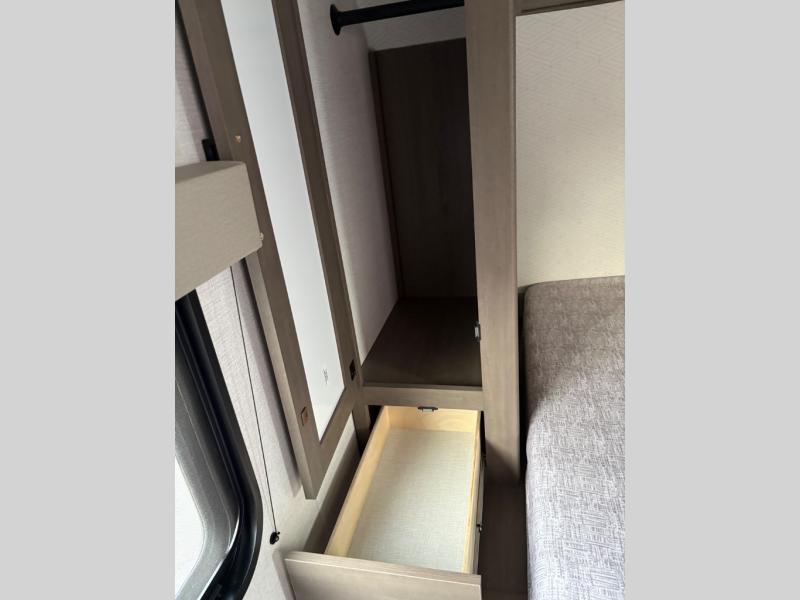 Your crew of eight will love camping in this spacious travel trailer! There are double-size bunks in the back with step storage and an added wardrobe for your guests' things plus exterior storage for camp gear galore. A walk-thru bath will create a front master bedroom you are sure to love, especially with its queen bed, wardrobe storage, and private exterior entry door! The main living area will be a favorite place to hang out with its U-shaped dinette, theater seating and 32" TV. If the weather is nice, you may just find yourselves outdoors since there is a rear exterior griddle and 1.7 cu. ft. refrigerator!