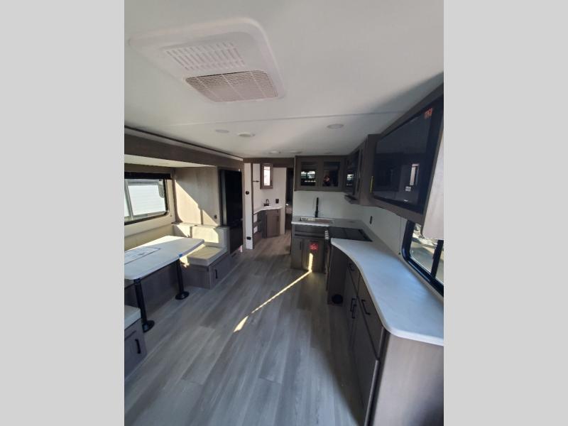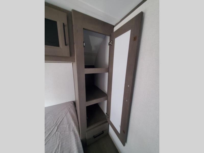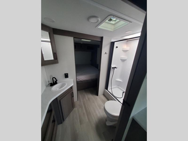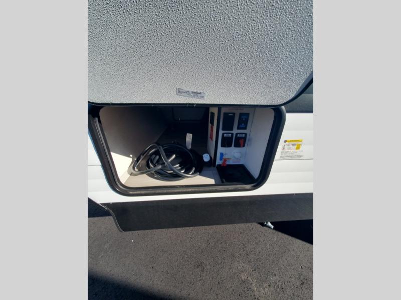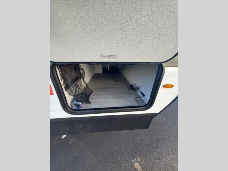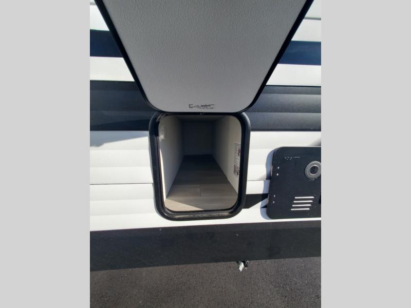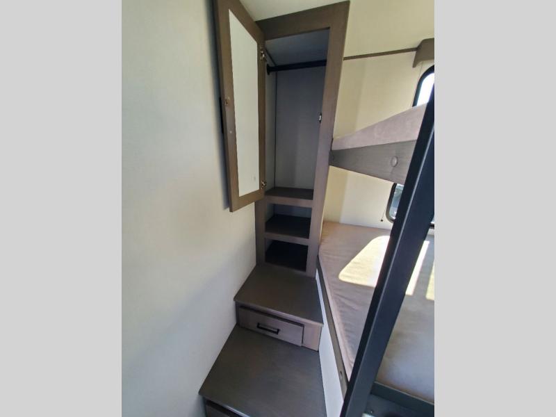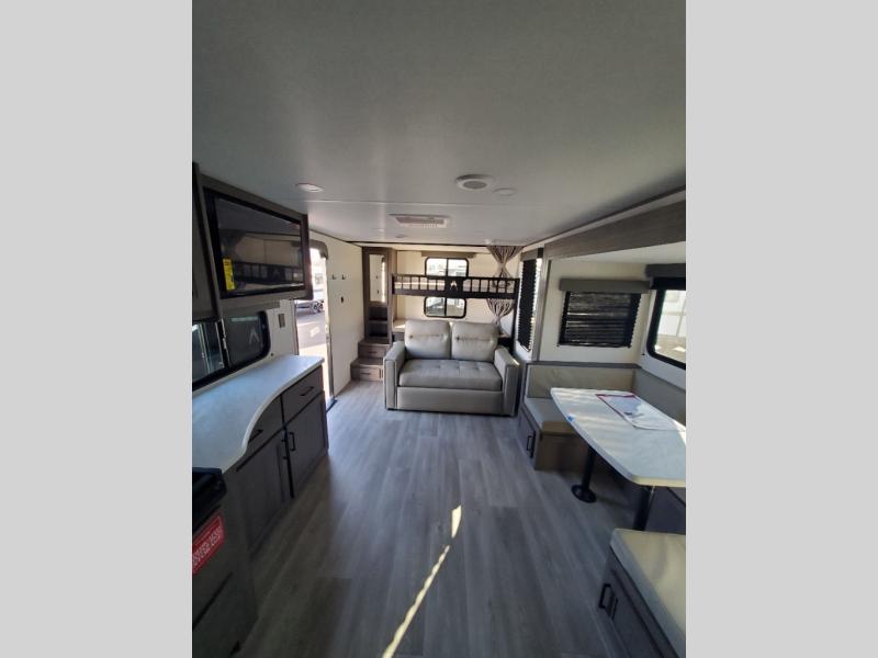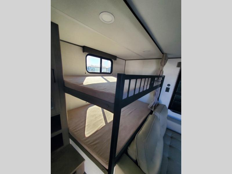 Your crew of eight will love camping in this spacious travel trailer! There are double-size bunks in the back with step storage and an added wardrobe for your guests' things plus exterior storage for camp gear galore. A walk-thru bath will create a front master bedroom you are sure to love, especially with its queen bed, wardrobe storage, and private exterior entry door! The main living area will be a favorite place to hang out with its U-shaped dinette, theater seating and 32" TV. If the weather is nice, you may just find yourselves outdoors since there is a rear exterior griddle and 1.7 cu. ft. refrigerator!