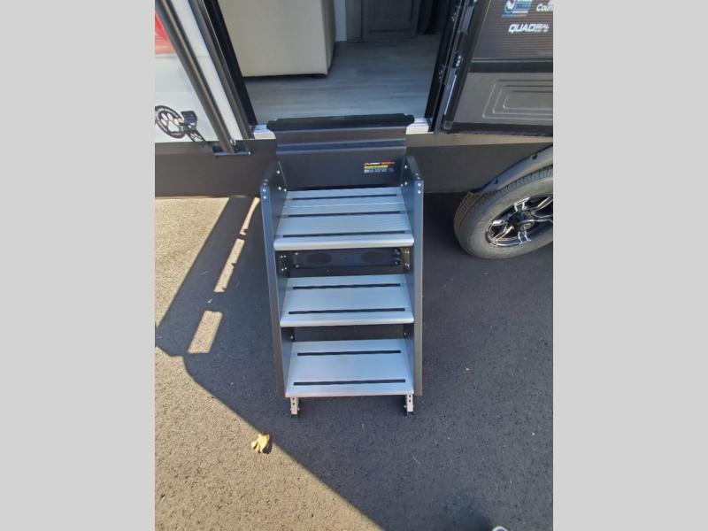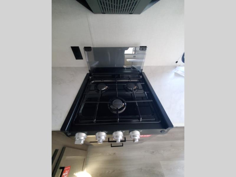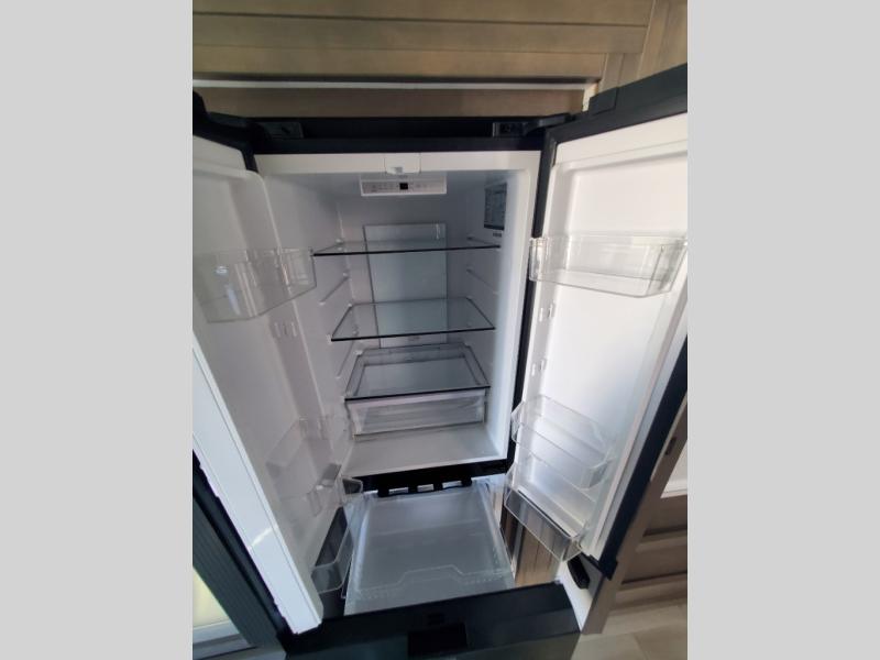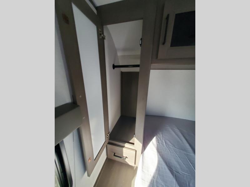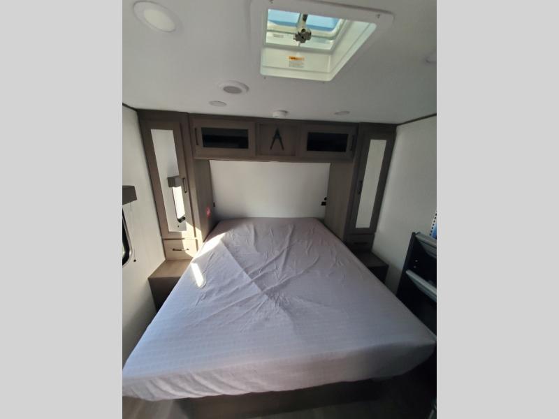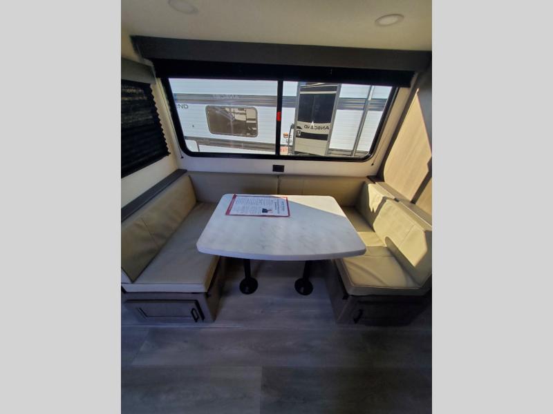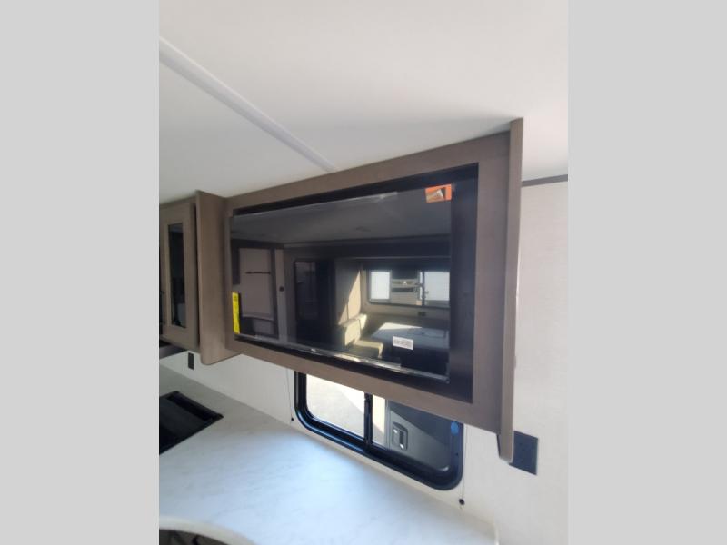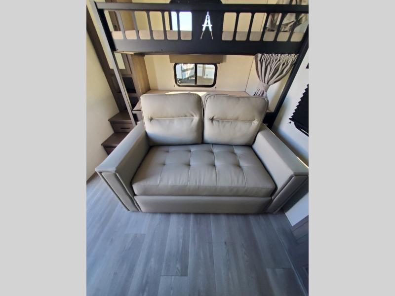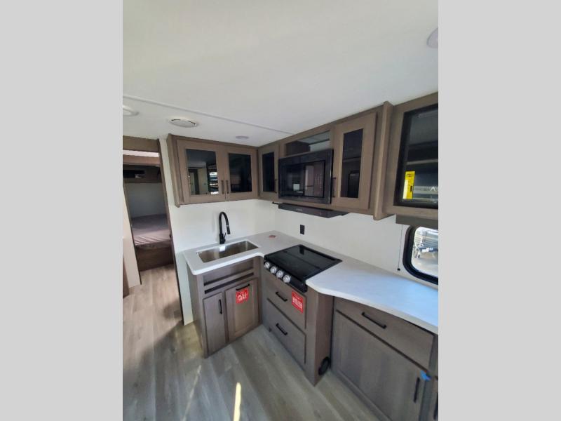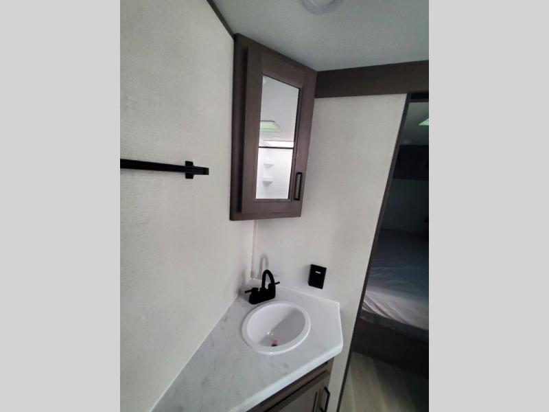 Your crew of eight will love camping in this spacious travel trailer! There are double-size bunks in the back with step storage and an added wardrobe for your guests' things plus exterior storage for camp gear galore. A walk-thru bath will create a front master bedroom you are sure to love, especially with its queen bed, wardrobe storage, and private exterior entry door! The main living area will be a favorite place to hang out with its U-shaped dinette, theater seating and 32" TV. If the weather is nice, you may just find yourselves outdoors since there is a rear exterior griddle and 1.7 cu. ft. refrigerator!