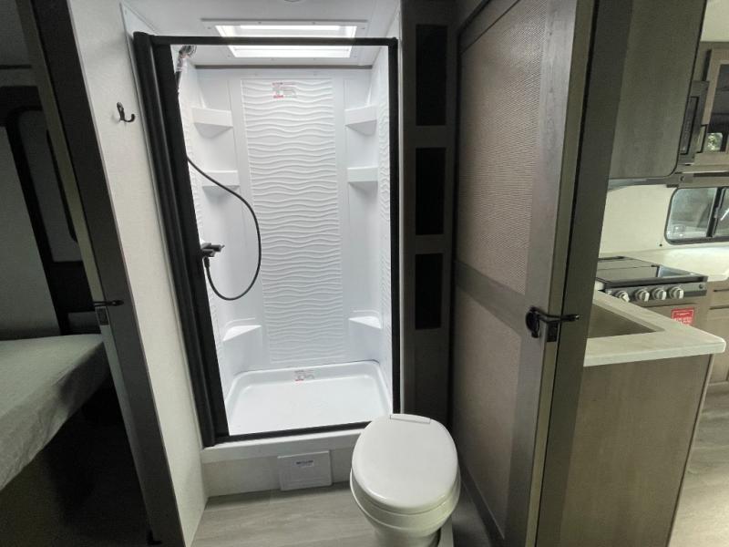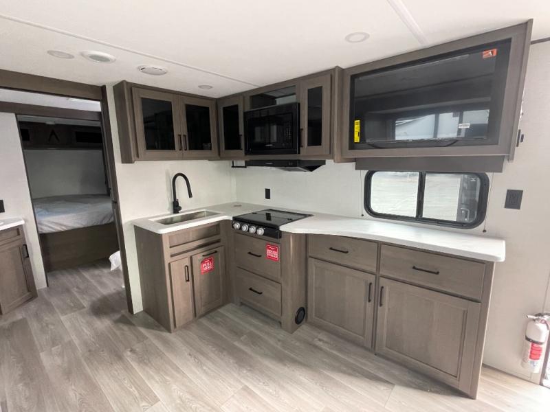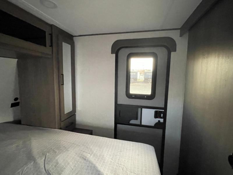 Your crew of eight will love camping in this spacious travel trailer! There are double-size bunks in the back with step storage and an added wardrobe for your guests' things plus exterior storage for camp gear galore. A walk-thru bath will create a front master bedroom you are sure to love, especially with its queen bed, wardrobe storage, and private exterior entry door! The main living area will be a favorite place to hang out with its U-shaped dinette, theater seating and 32" TV. If the weather is nice, you may just find yourselves outdoors since there is a rear exterior griddle and 1.7 cu. ft. refrigerator!