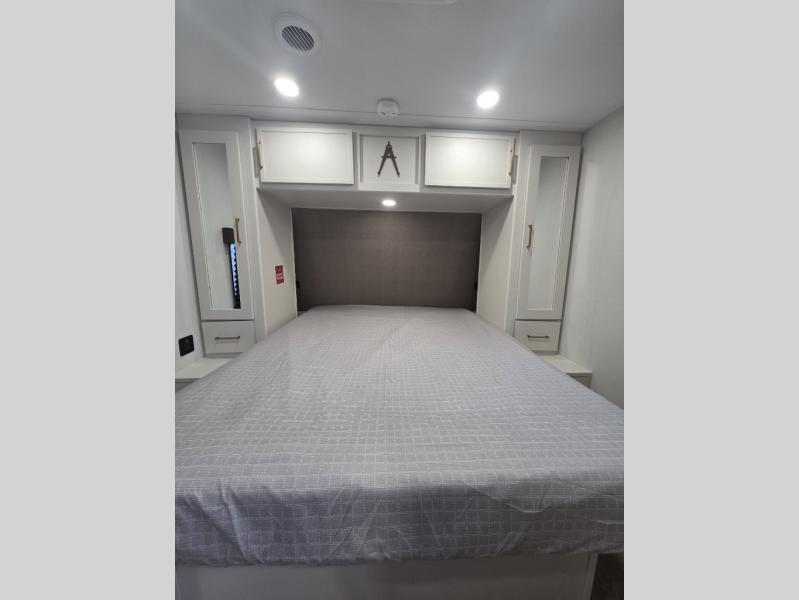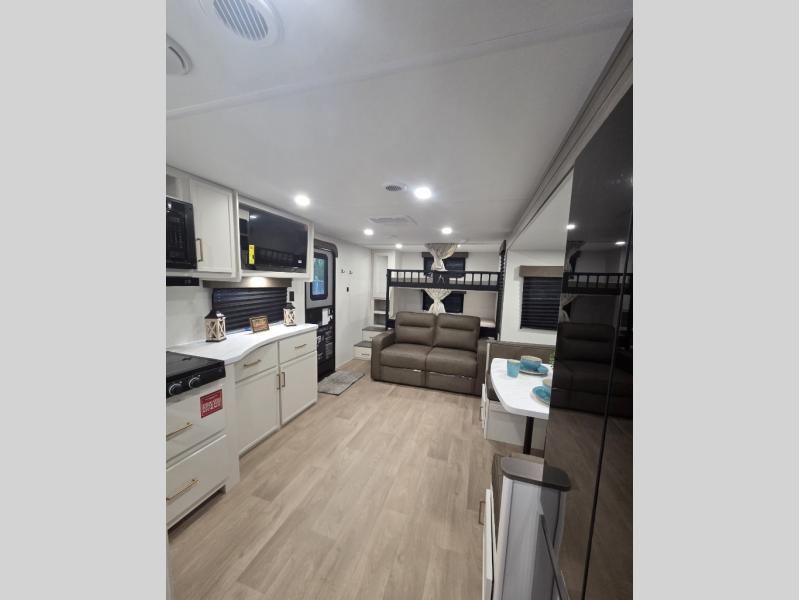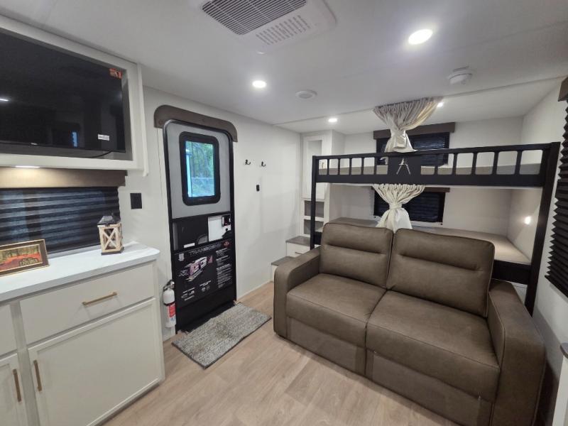 Your crew of eight will love camping in this spacious travel trailer! There are double-size bunks in the back with step storage and an added wardrobe for your guests' things plus exterior storage for camp gear galore. A walk-thru bath will create a front master bedroom you are sure to love, especially with its queen bed, wardrobe storage, and private exterior entry door! The main living area will be a favorite place to hang out with its U-shaped dinette, theater seating and 32" TV. If the weather is nice, you may just find yourselves outdoors since there is a rear exterior griddle and 1.7 cu. ft. refrigerator!