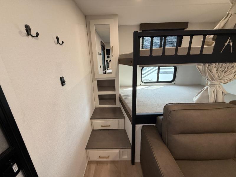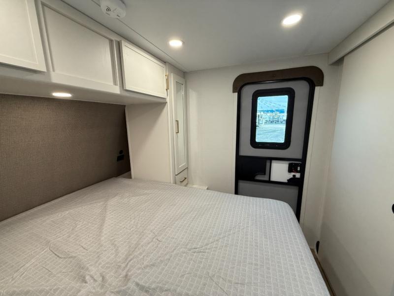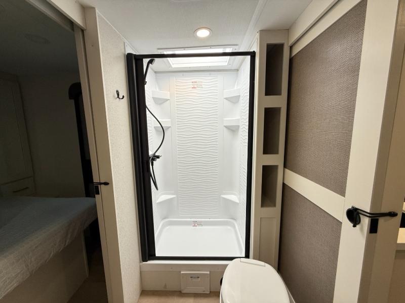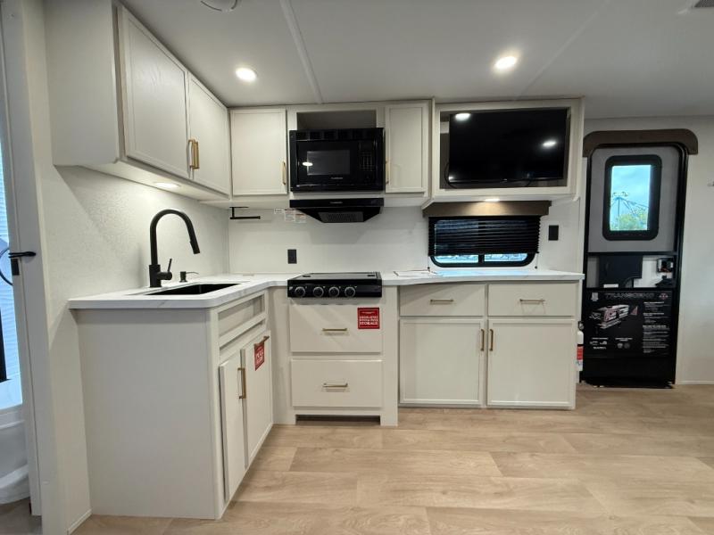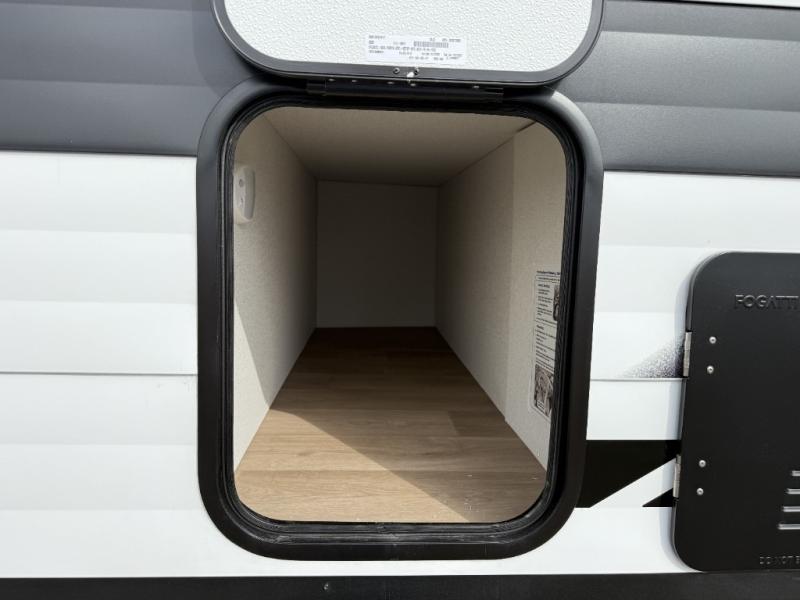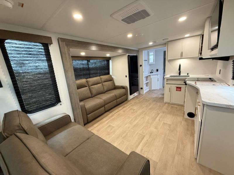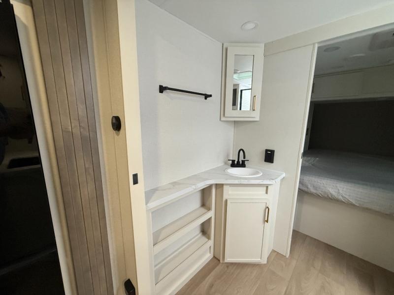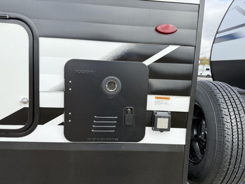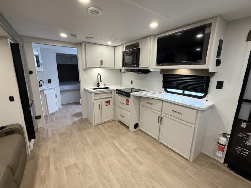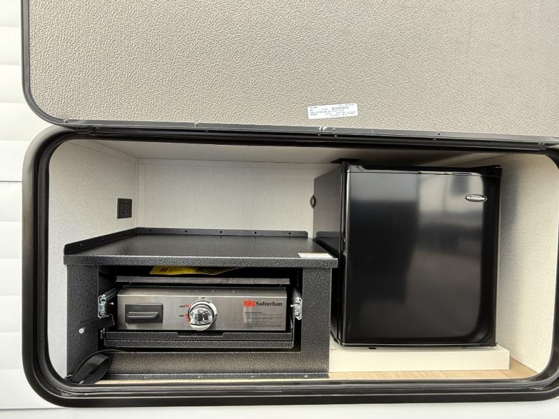 Your crew of eight will love camping in this spacious travel trailer! There are double-size bunks in the back with step storage and an added wardrobe for your guests' things plus exterior storage for camp gear galore. A walk-thru bath will create a front master bedroom you are sure to love, especially with its queen bed, wardrobe storage, and private exterior entry door! The main living area will be a favorite place to hang out with its U-shaped dinette, theater seating and 32" TV. If the weather is nice, you may just find yourselves outdoors since there is a rear exterior griddle and 1.7 cu. ft. refrigerator!
