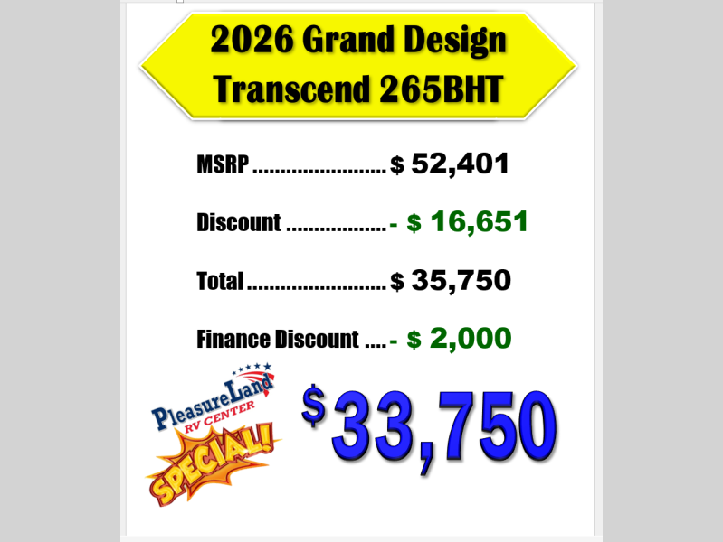 New 2026 Grand Design Transcend 265BHT Travel Trailer
