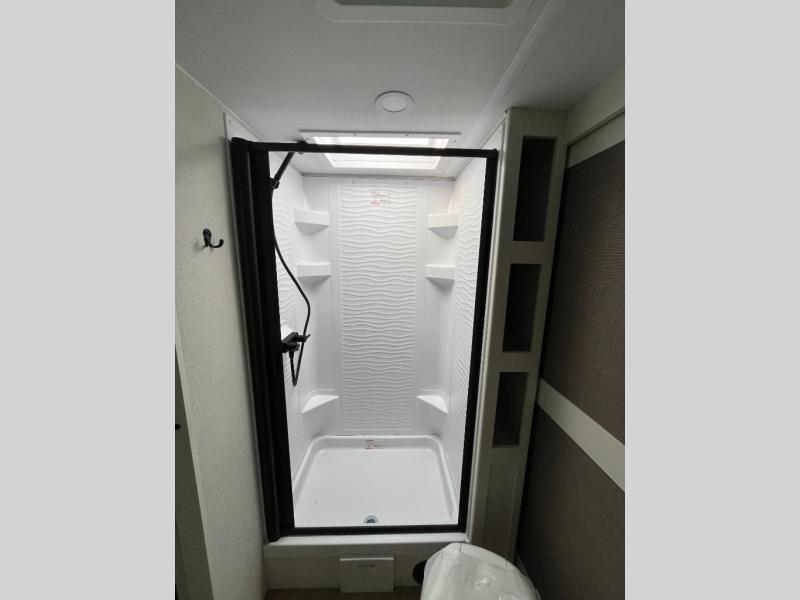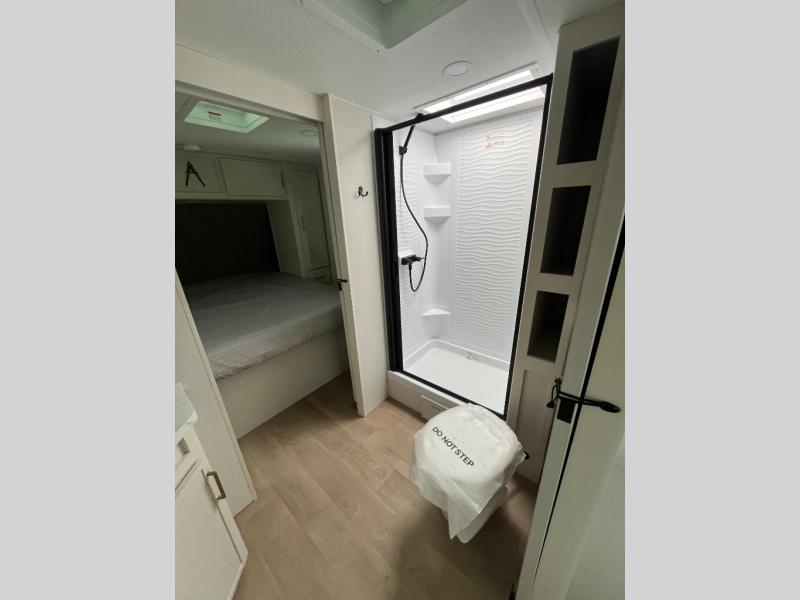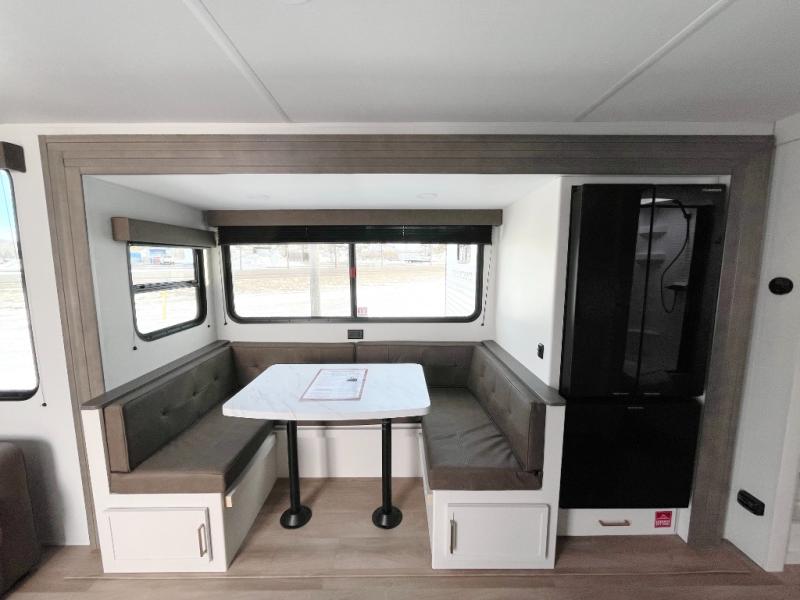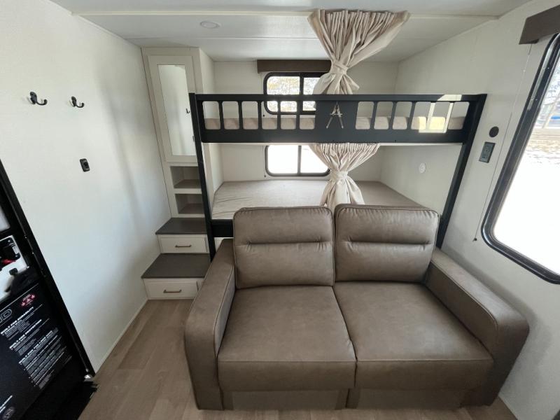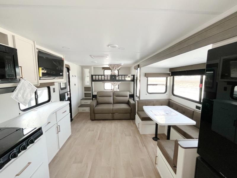 Your crew of eight will love camping in this spacious travel trailer! There are double-size bunks in the back with step storage and an added wardrobe for your guests' things plus exterior storage for camp gear galore. A walk-thru bath will create a front master bedroom you are sure to love, especially with its queen bed, wardrobe storage, and private exterior entry door! The main living area will be a favorite place to hang out with its U-shaped dinette, theater seating and 32" TV. If the weather is nice, you may just find yourselves outdoors since there is a rear exterior griddle and 1.7 cu. ft. refrigerator!