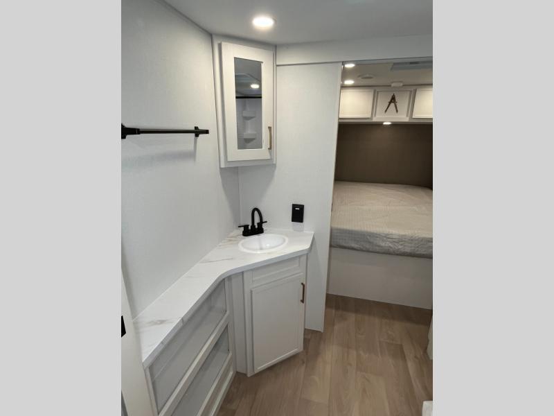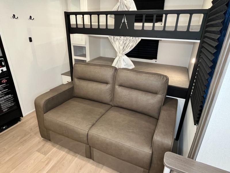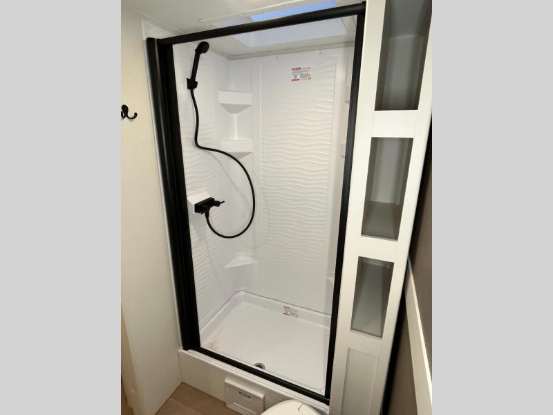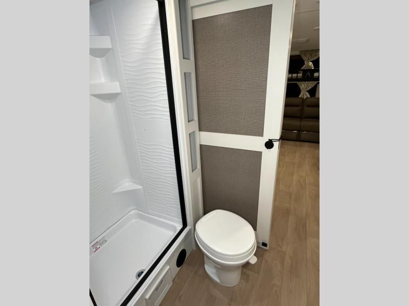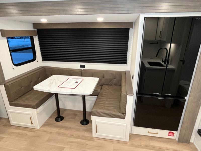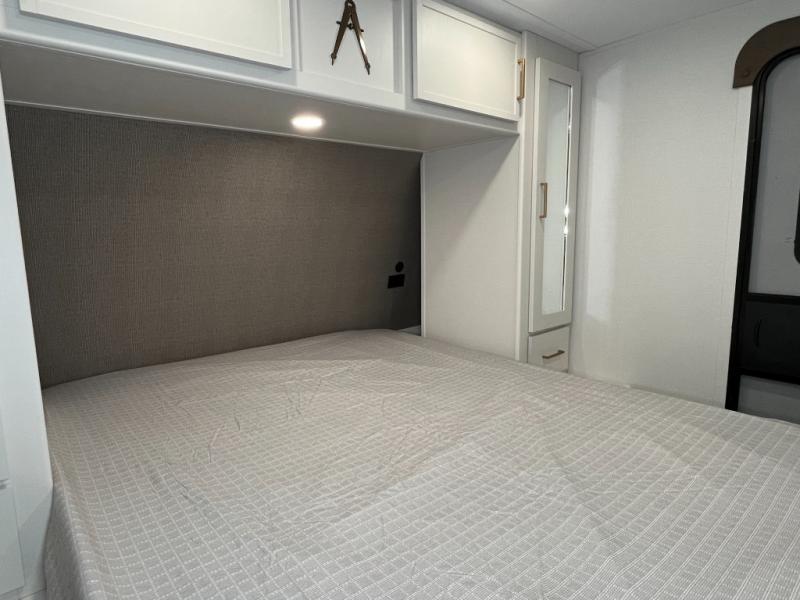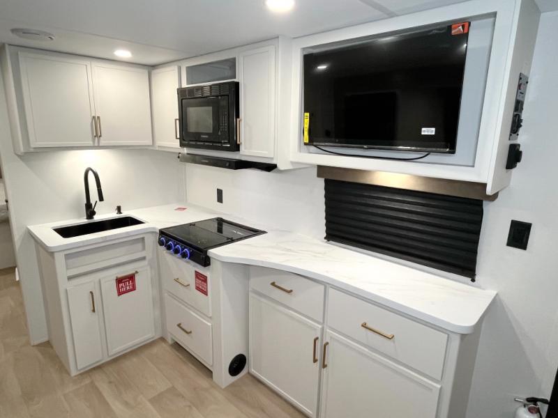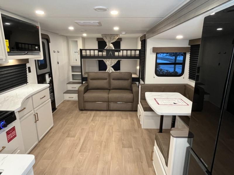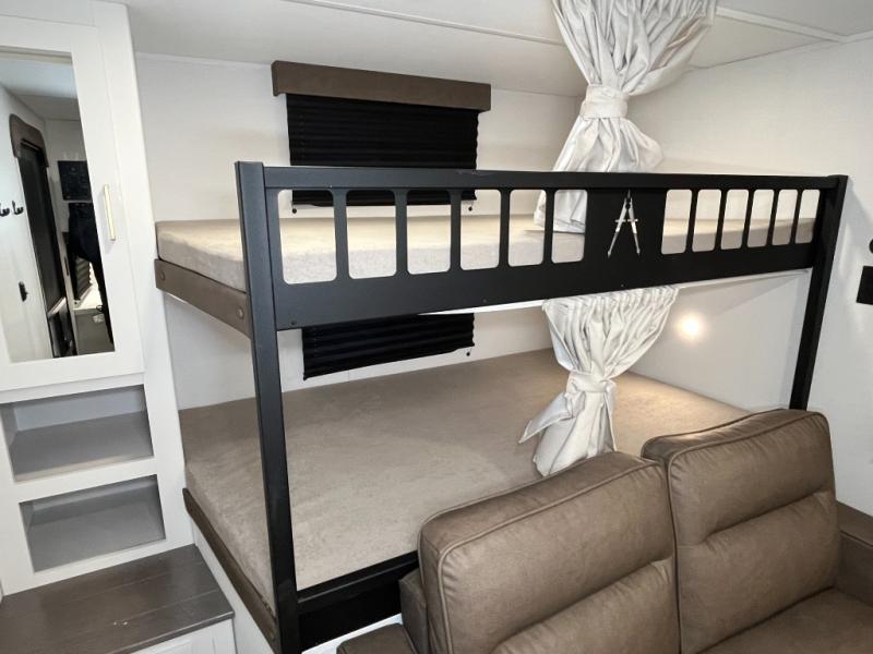 Your crew of eight will love camping in this spacious travel trailer! There are double-size bunks in the back with step storage and an added wardrobe for your guests' things plus exterior storage for camp gear galore. A walk-thru bath will create a front master bedroom you are sure to love, especially with its queen bed, wardrobe storage, and private exterior entry door! The main living area will be a favorite place to hang out with its U-shaped dinette, theater seating and 32" TV. If the weather is nice, you may just find yourselves outdoors since there is a rear exterior griddle and 1.7 cu. ft. refrigerator!
