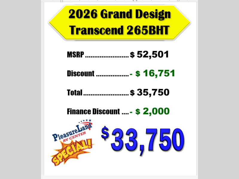 New 2026 Grand Design Transcend 265BHT Travel Trailer