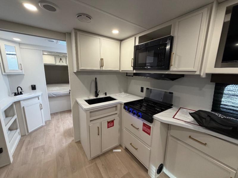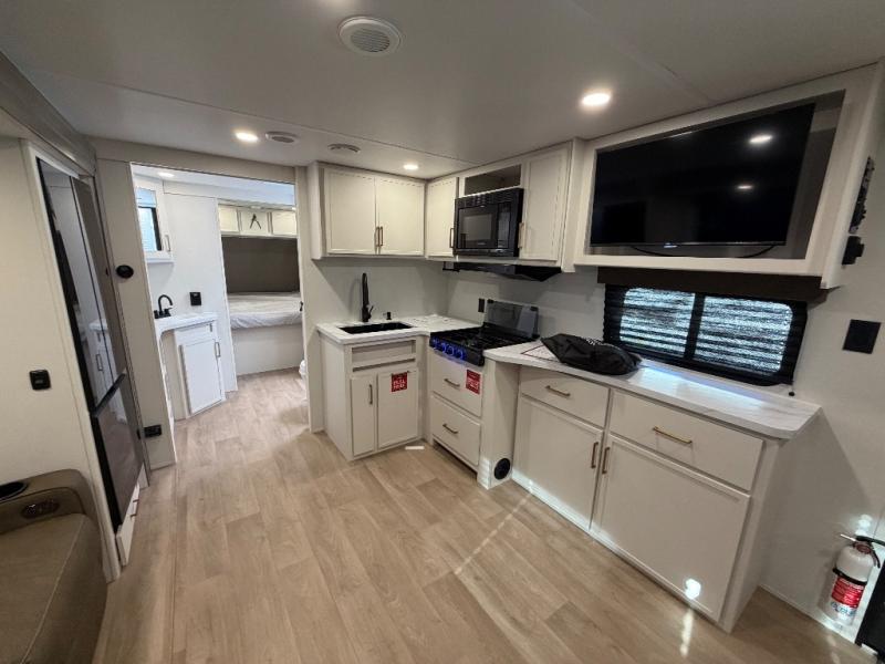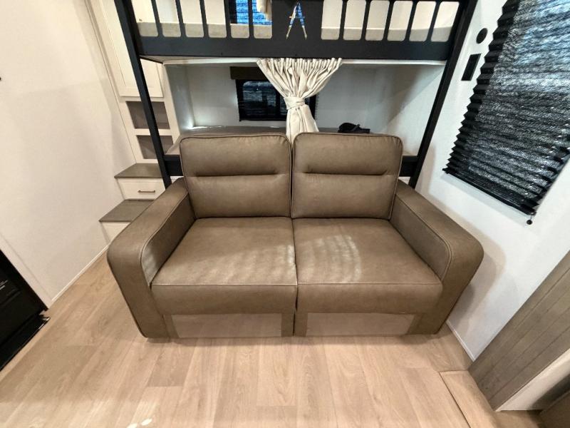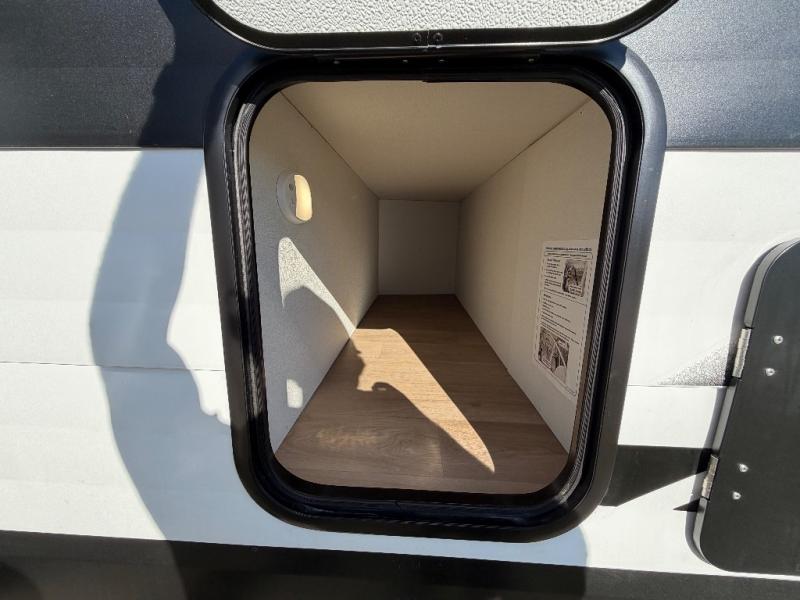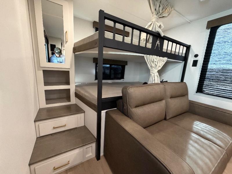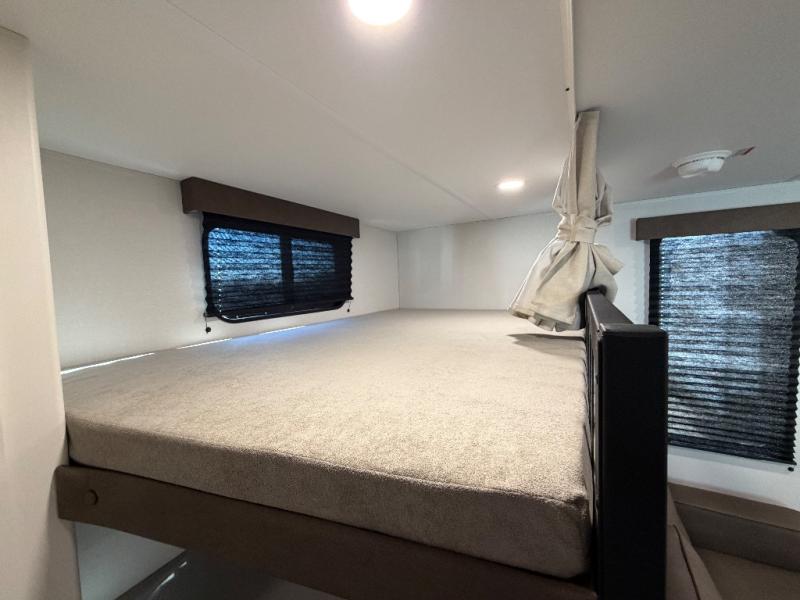 Your crew of eight will love camping in this spacious travel trailer! There are double-size bunks in the back with step storage and an added wardrobe for your guests' things plus exterior storage for camp gear galore. A walk-thru bath will create a front master bedroom you are sure to love, especially with its queen bed, wardrobe storage, and private exterior entry door! The main living area will be a favorite place to hang out with its U-shaped dinette, theater seating and 32" TV. If the weather is nice, you may just find yourselves outdoors since there is a rear exterior griddle and 1.7 cu. ft. refrigerator!