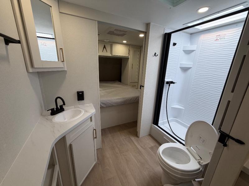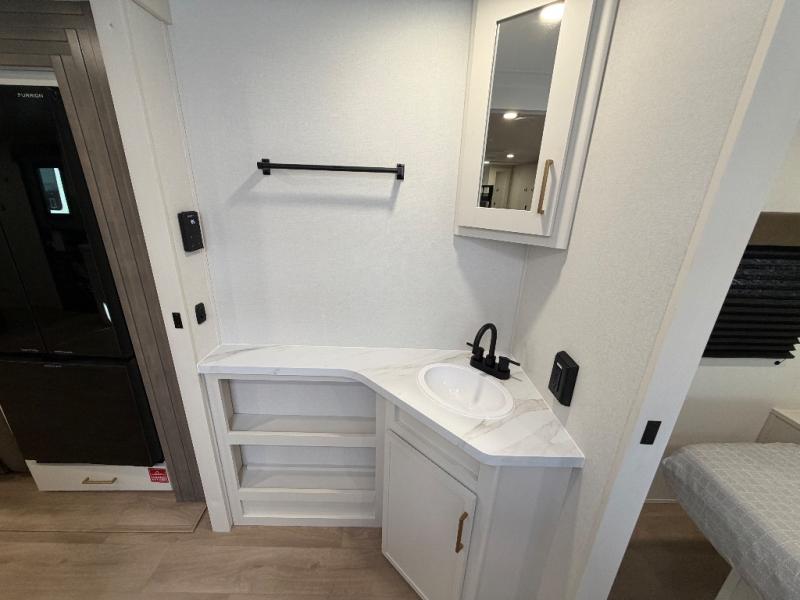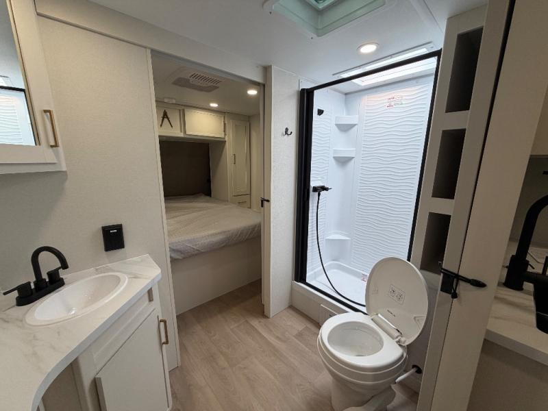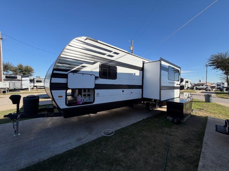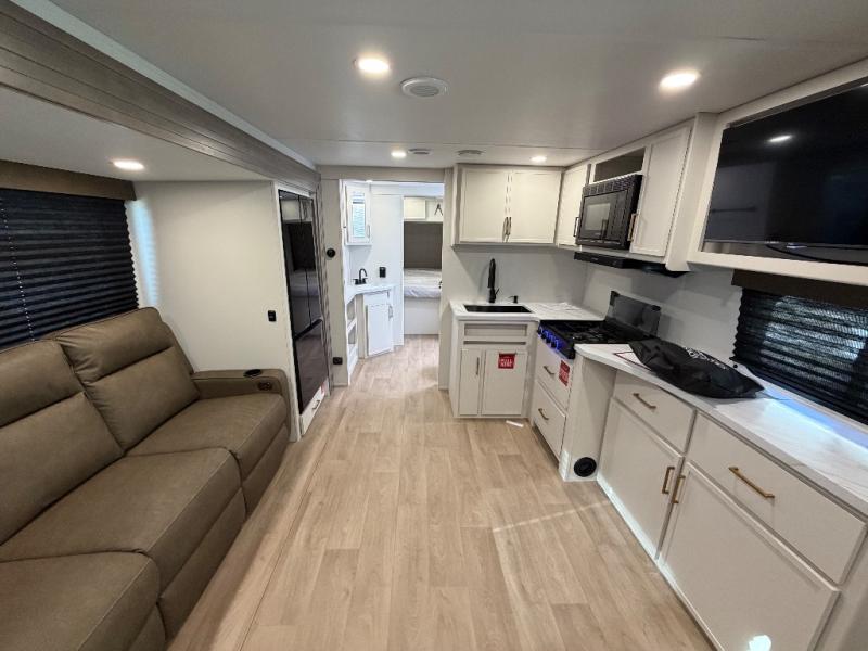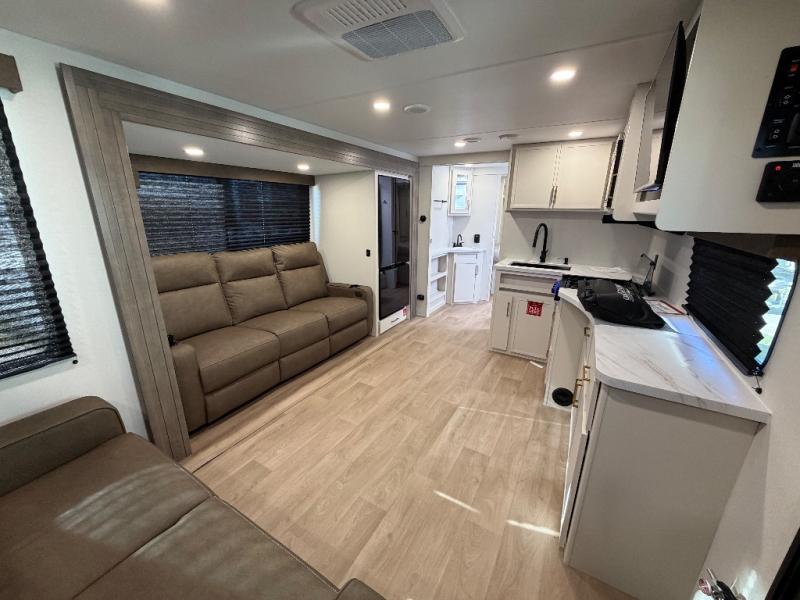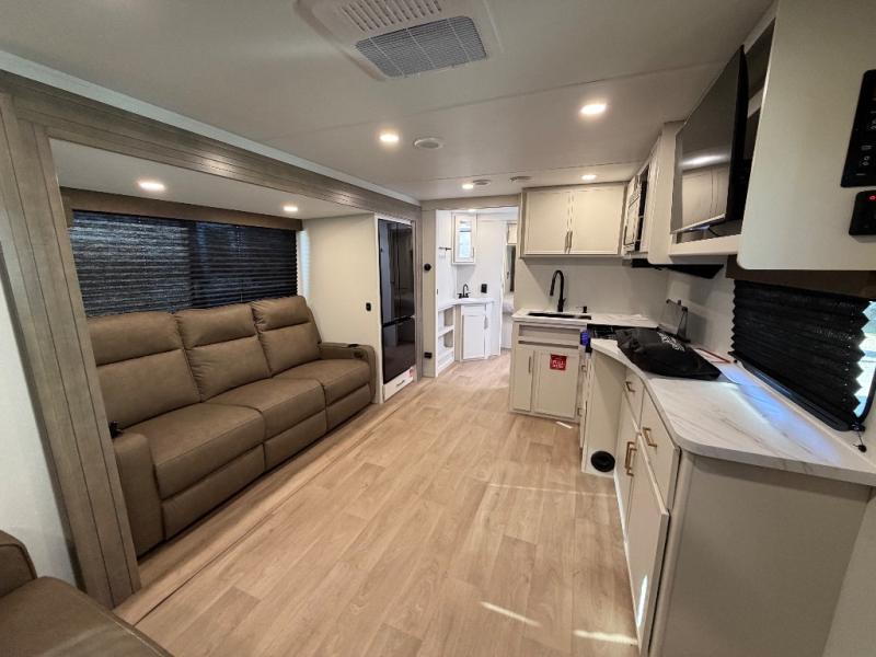 Your crew of eight will love camping in this spacious travel trailer! There are double-size bunks in the back with step storage and an added wardrobe for your guests' things plus exterior storage for camp gear galore. A walk-thru bath will create a front master bedroom you are sure to love, especially with its queen bed, wardrobe storage, and private exterior entry door! The main living area will be a favorite place to hang out with its U-shaped dinette, theater seating and 32" TV. If the weather is nice, you may just find yourselves outdoors since there is a rear exterior griddle and 1.7 cu. ft. refrigerator!