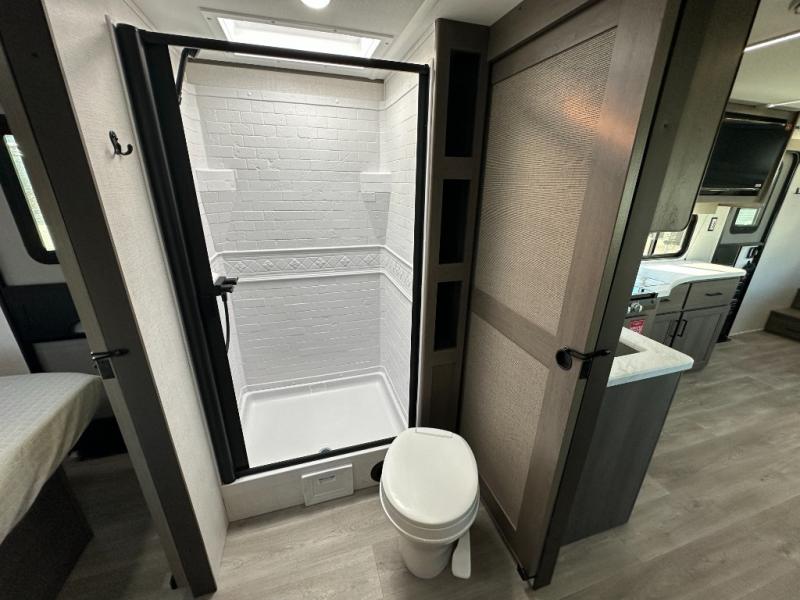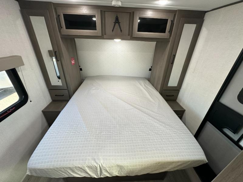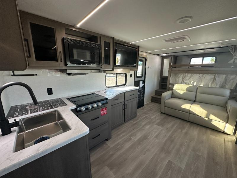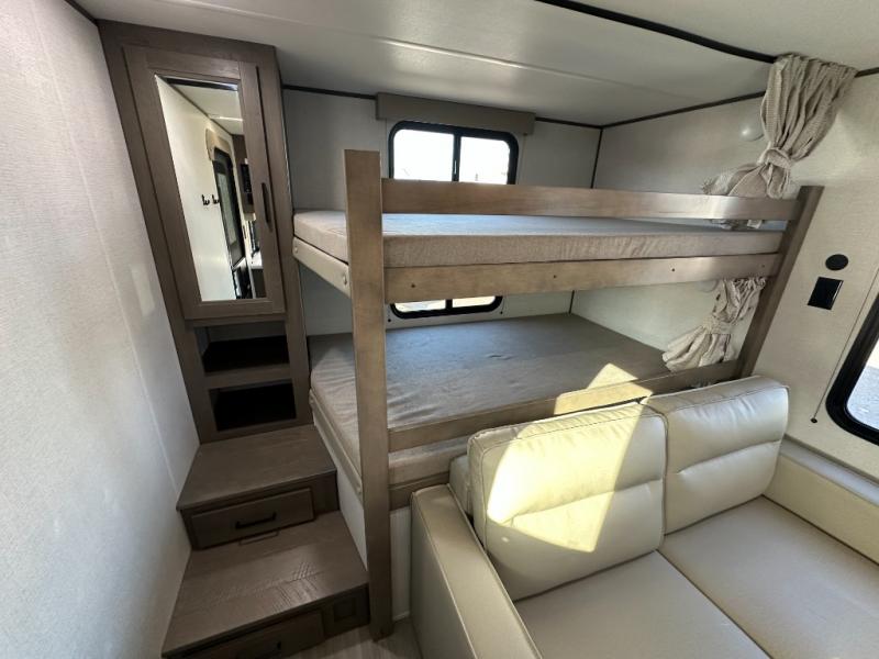 Your crew of eight will love camping in this spacious travel trailer! There are double-size bunks in the back with step storage and an added wardrobe for your guests' things plus exterior storage for camp gear galore. A walk-thru bath will create a front master bedroom you are sure to love, especially with its queen bed, wardrobe storage, and private exterior entry door! The main living area will be a favorite place to hang out with its U-shaped dinette, theater seating and 32" TV. If the weather is nice, you may just find yourselves outdoors since there is a rear exterior griddle and 1.7 cu. ft. refrigerator!