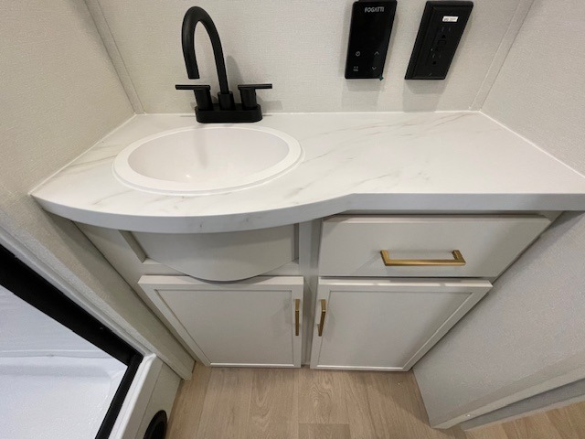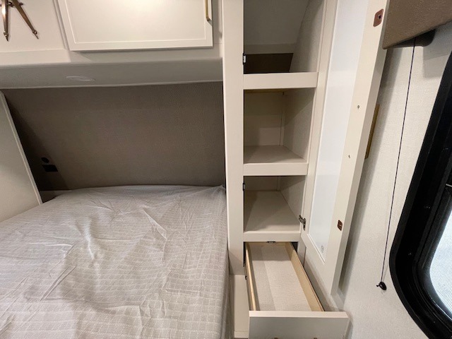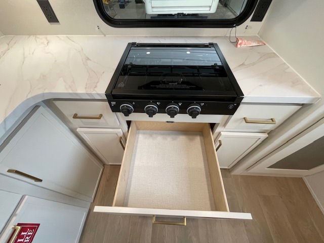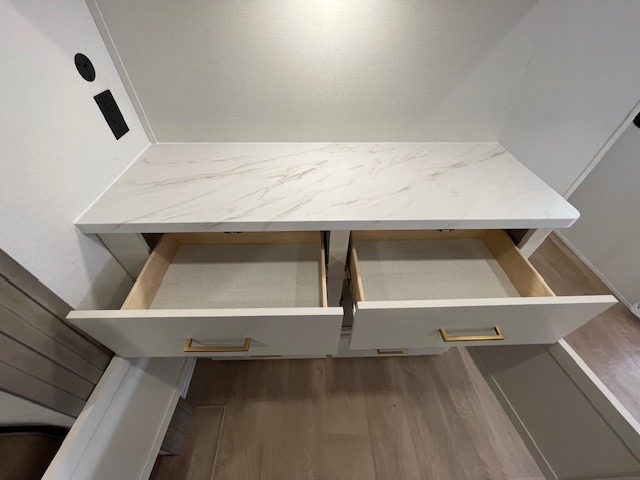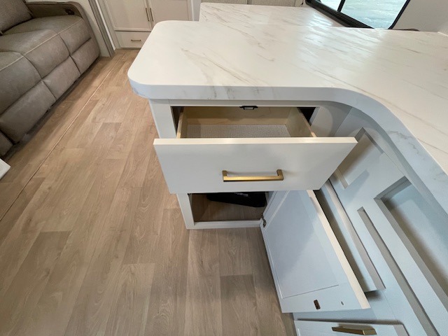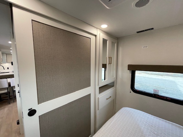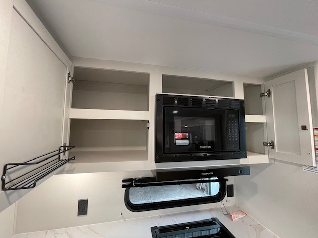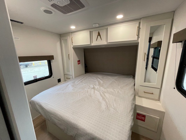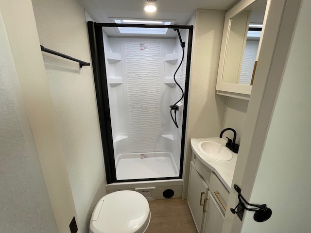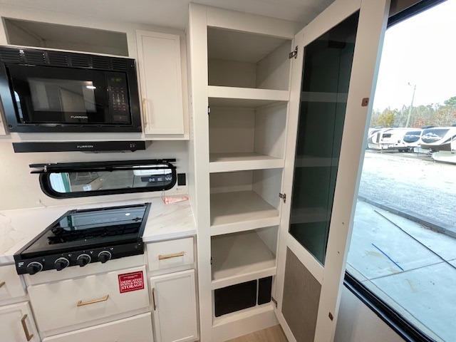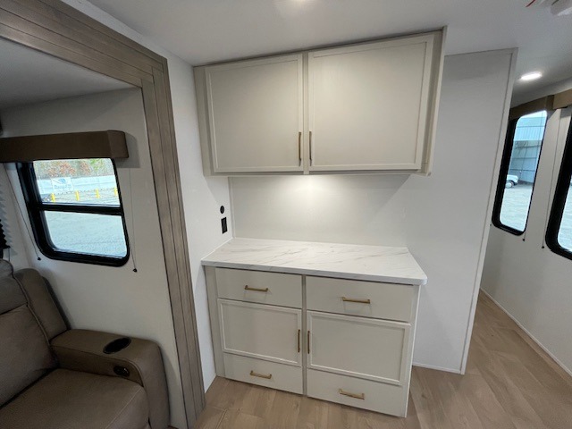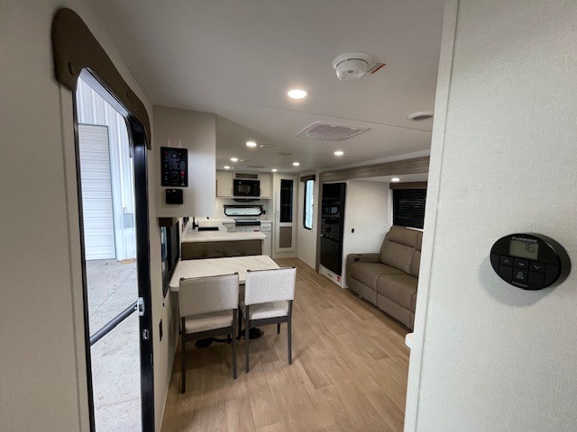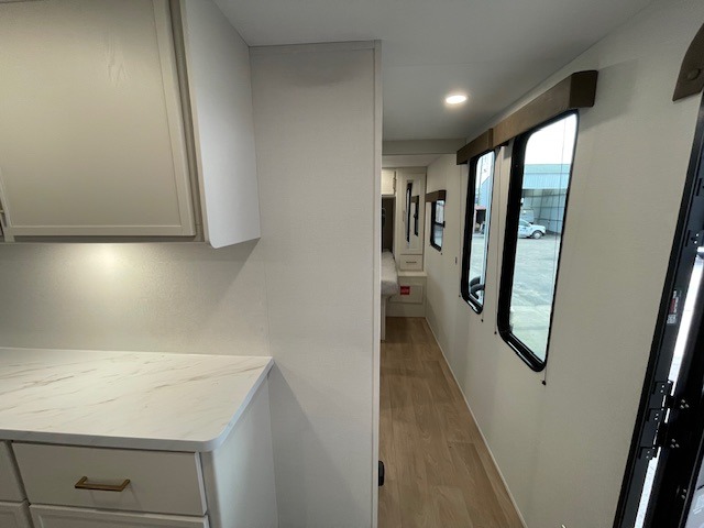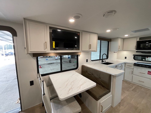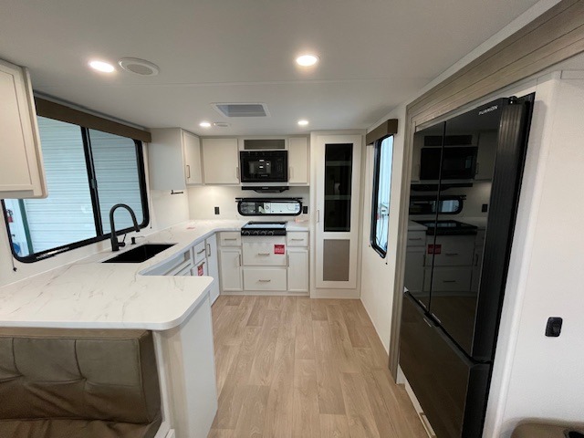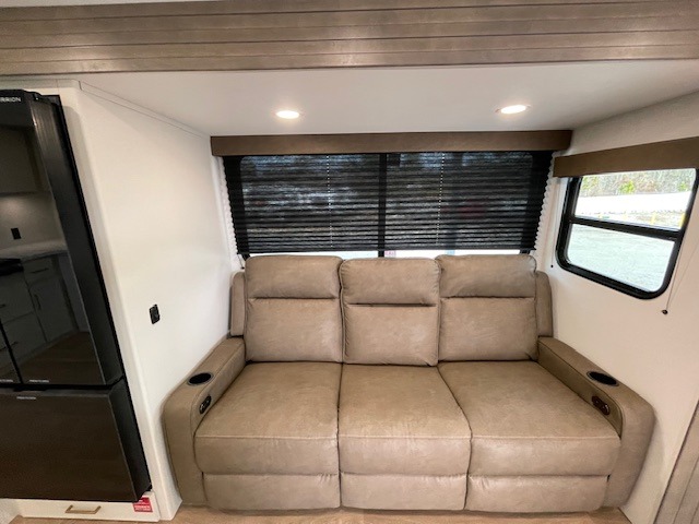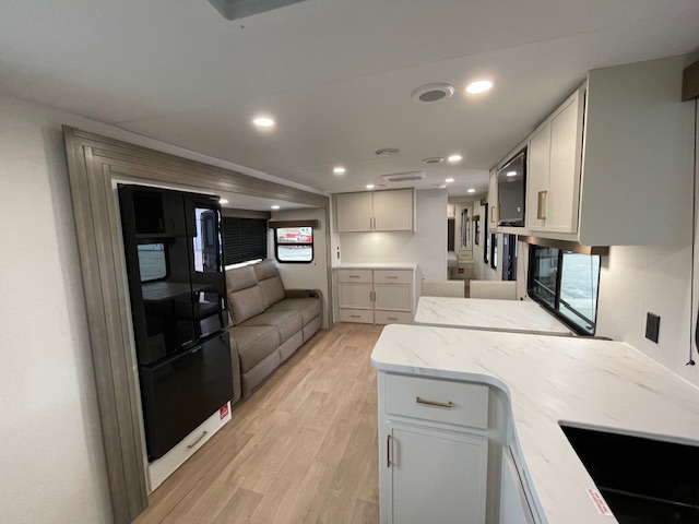 If you're looking for a comfortable travel trailer with a smart layout and inviting living space, this is the one! You’ll appreciate how the design keeps everything open while still giving you the dedicated areas you need to relax, cook, and enjoy time at camp. In the back, the rear kitchen provides generous counterspace and easy organization for meal prep, along with a nearby pantry to keep food and essentials within reach. Across from the main living area, theater seating creates a cozy place to unwind after a day outdoors, perfectly positioned for viewing the 32" TV so you can enjoy movies, shows, or game day in comfort. Altogether, this layout delivers the convenience and comfort that make every getaway feel just right.