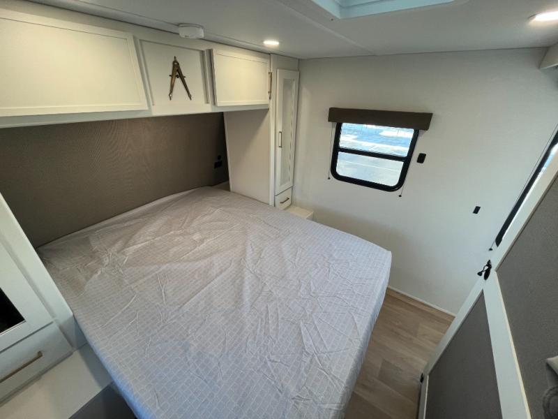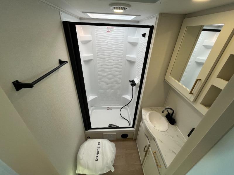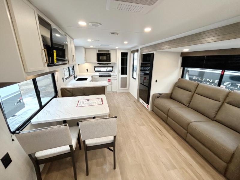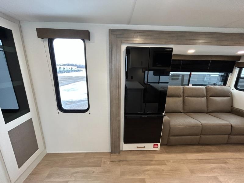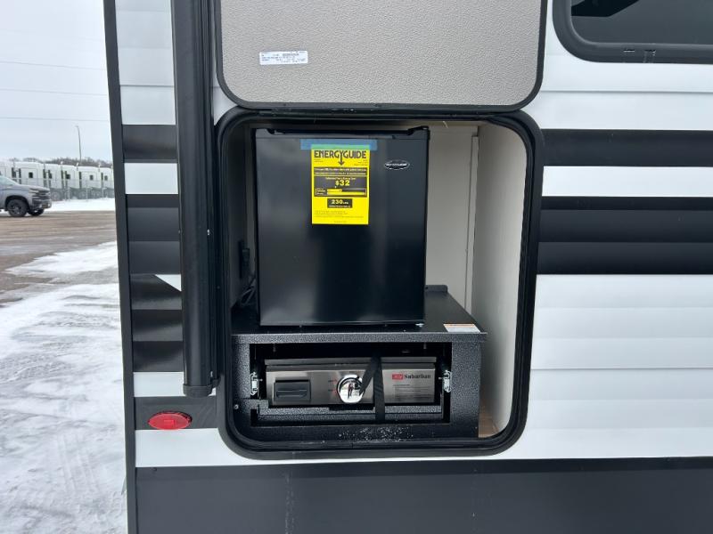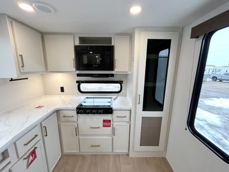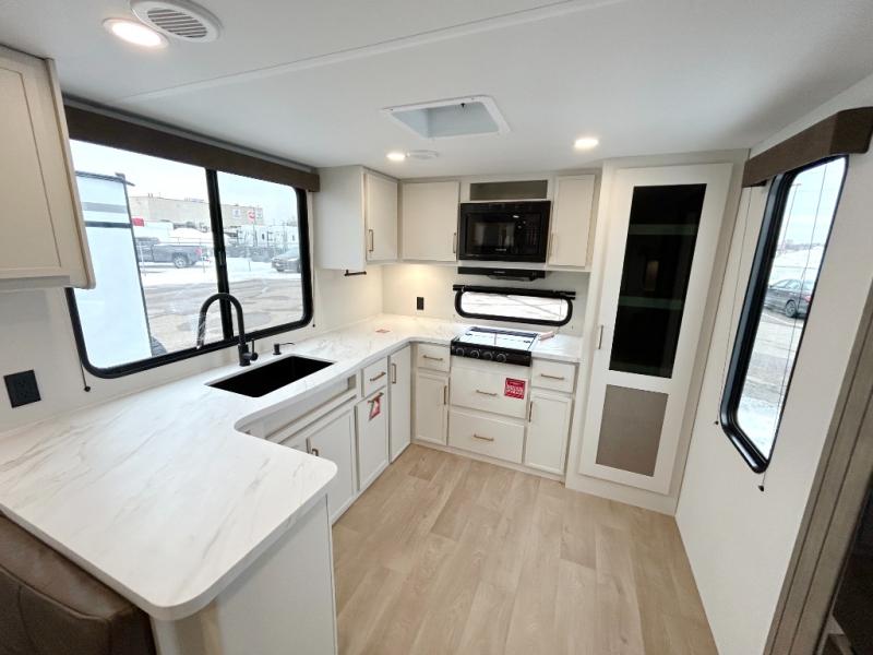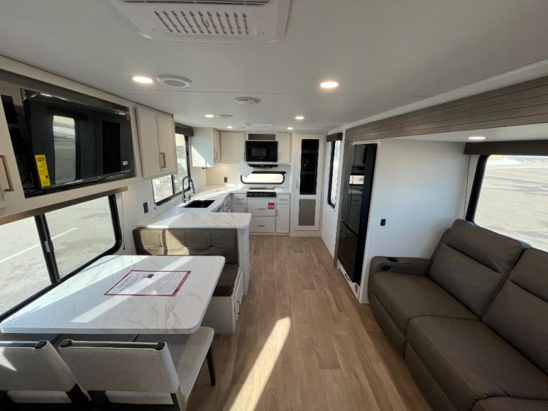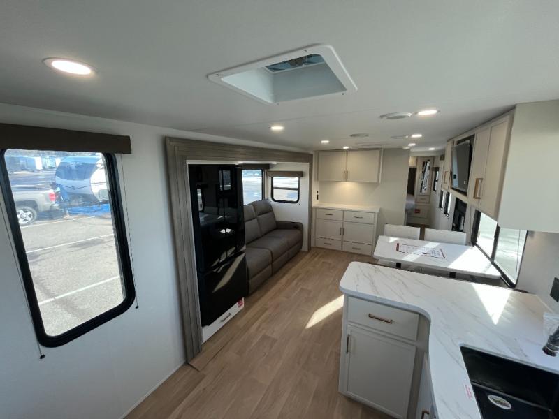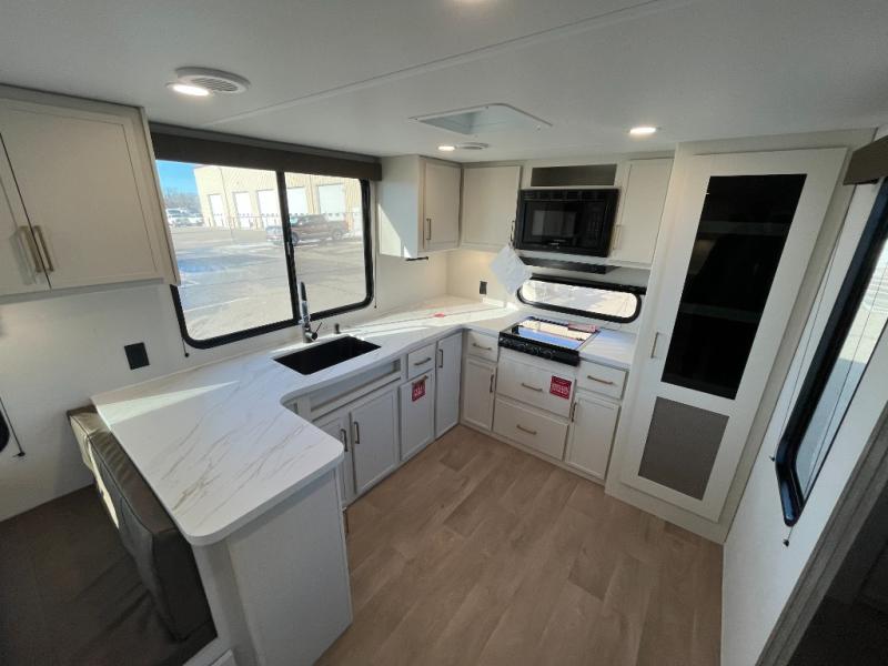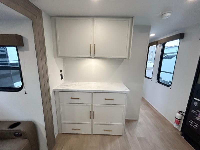 If you're looking for a comfortable travel trailer with a smart layout and inviting living space, this is the one! You’ll appreciate how the design keeps everything open while still giving you the dedicated areas you need to relax, cook, and enjoy time at camp. In the back, the rear kitchen provides generous counterspace and easy organization for meal prep, along with a nearby pantry to keep food and essentials within reach. Across from the main living area, theater seating creates a cozy place to unwind after a day outdoors, perfectly positioned for viewing the 32" TV so you can enjoy movies, shows, or game day in comfort. Altogether, this layout delivers the convenience and comfort that make every getaway feel just right.