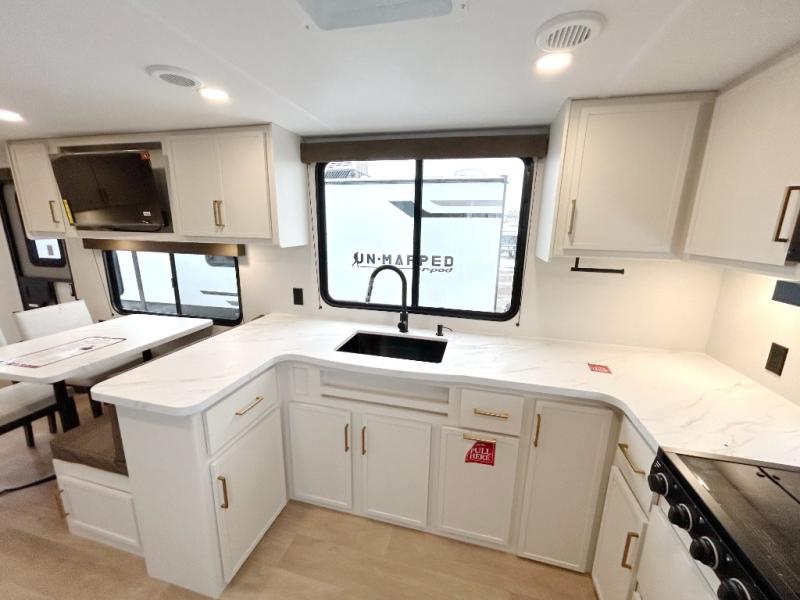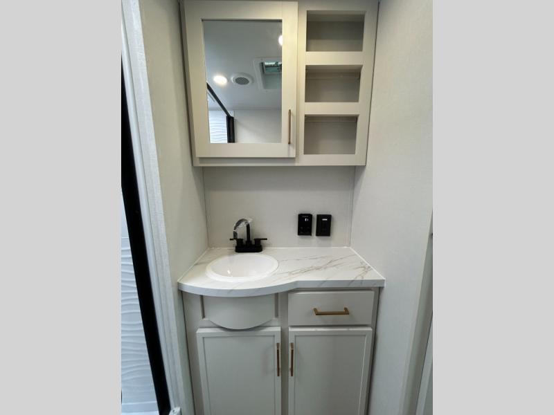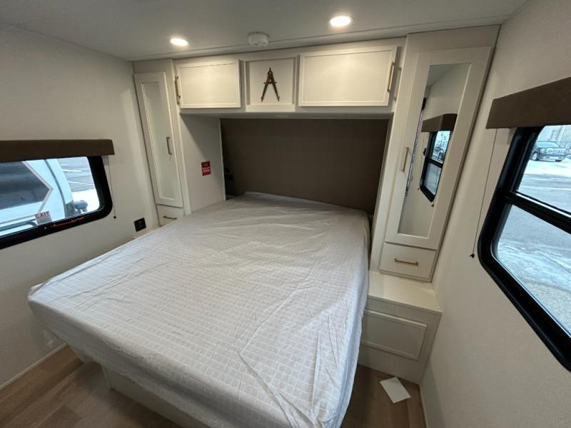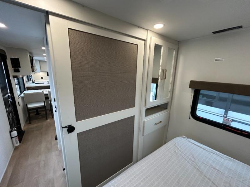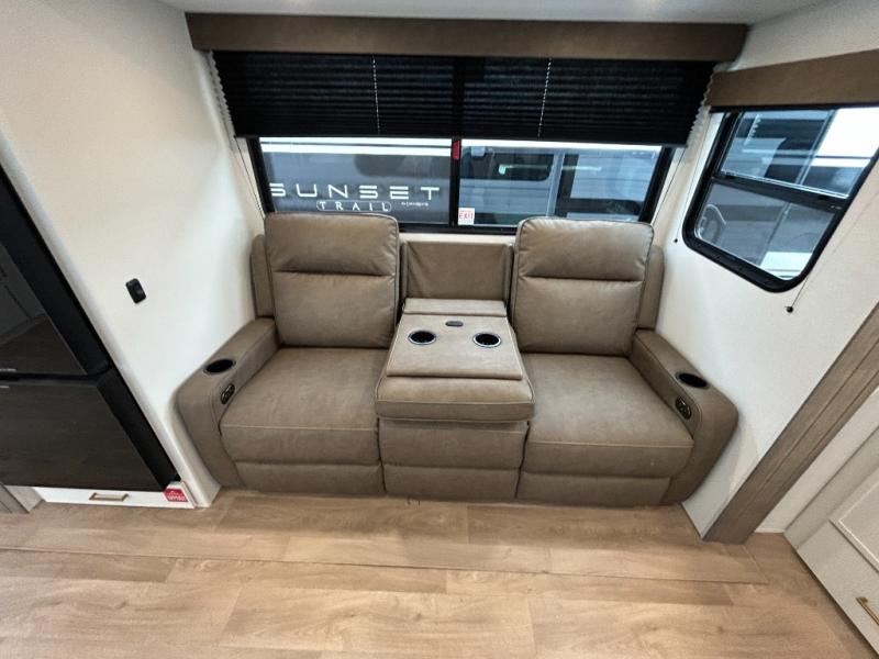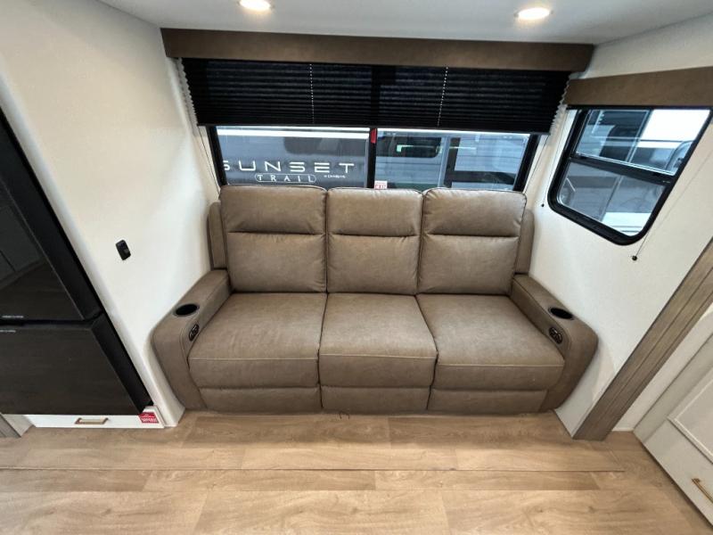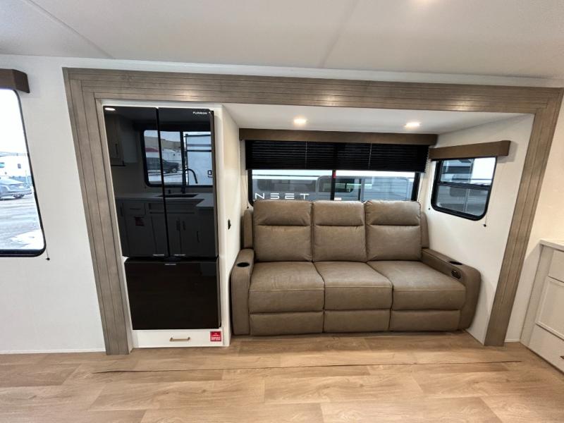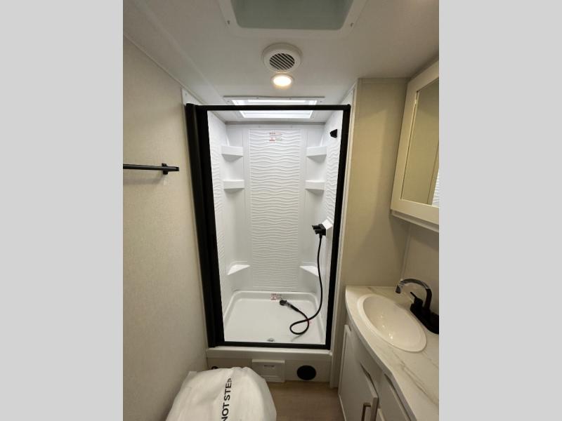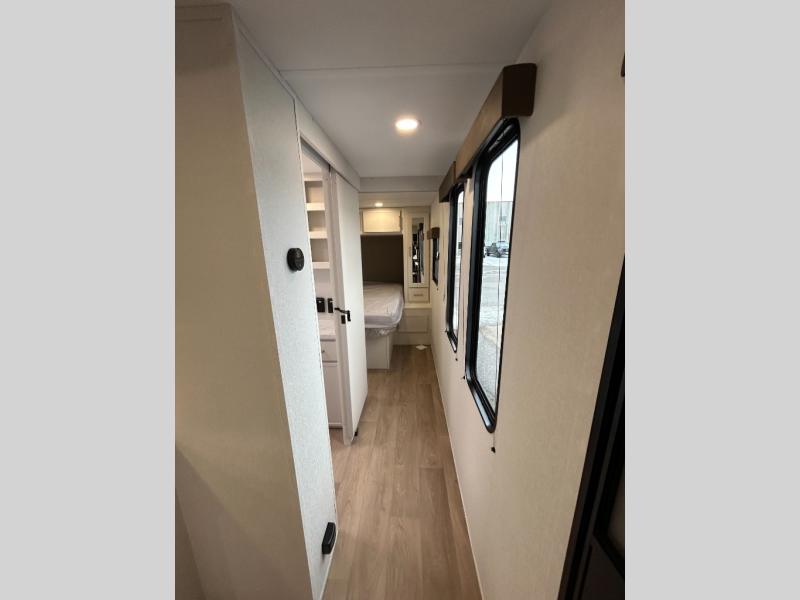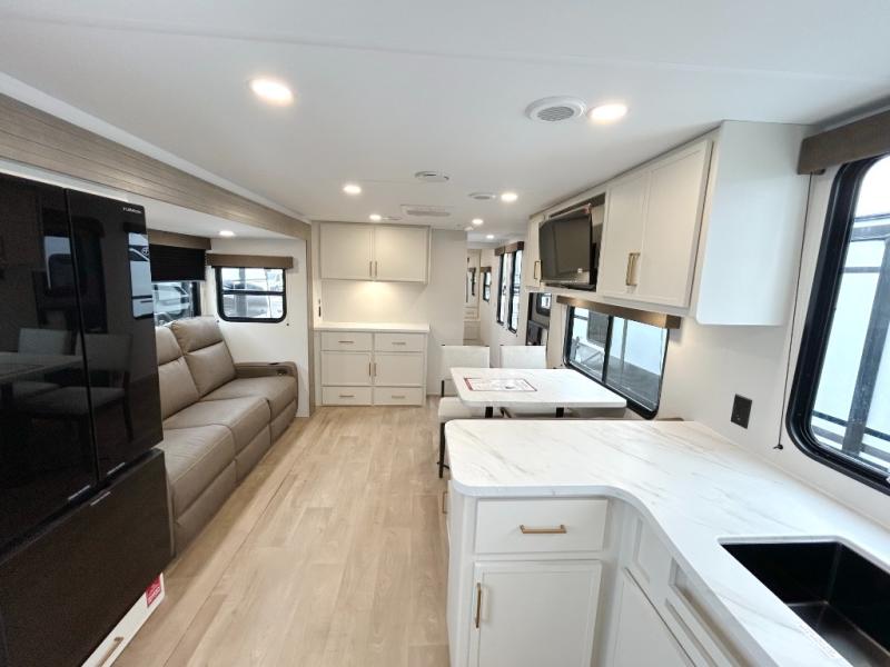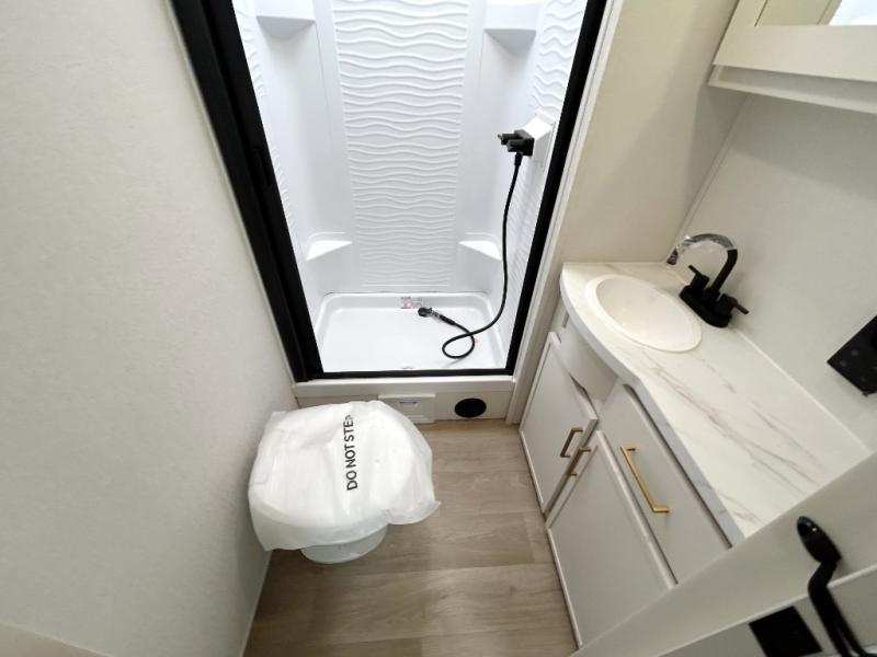 If you're looking for a comfortable travel trailer with a smart layout and inviting living space, this is the one! You’ll appreciate how the design keeps everything open while still giving you the dedicated areas you need to relax, cook, and enjoy time at camp. In the back, the rear kitchen provides generous counterspace and easy organization for meal prep, along with a nearby pantry to keep food and essentials within reach. Across from the main living area, theater seating creates a cozy place to unwind after a day outdoors, perfectly positioned for viewing the 32" TV so you can enjoy movies, shows, or game day in comfort. Altogether, this layout delivers the convenience and comfort that make every getaway feel just right.