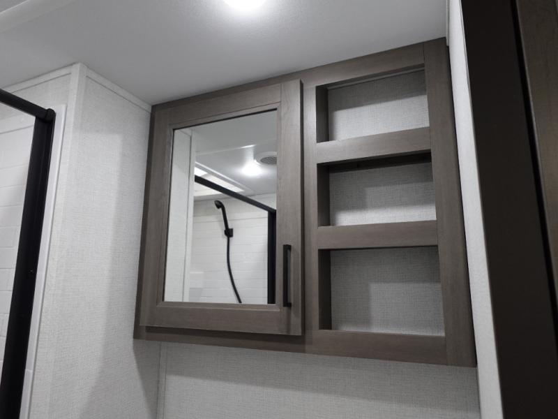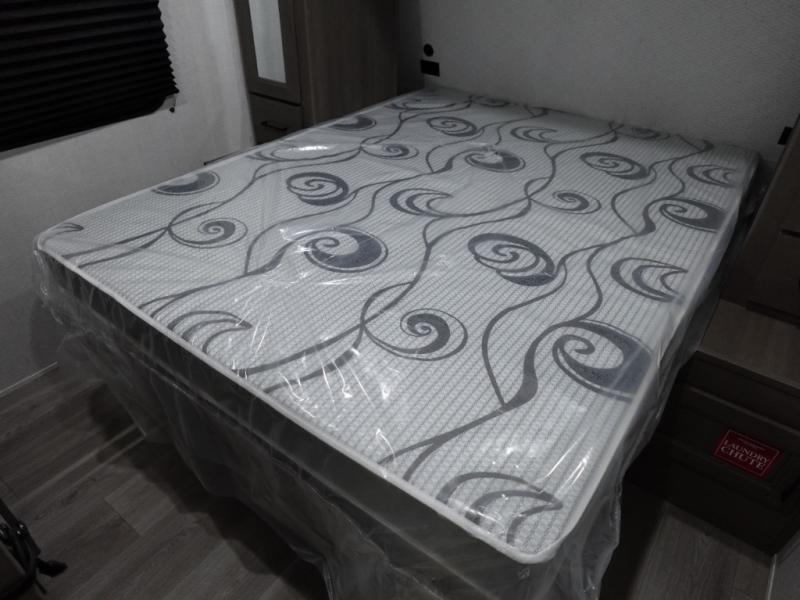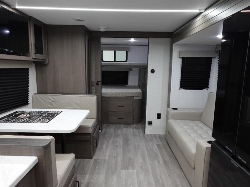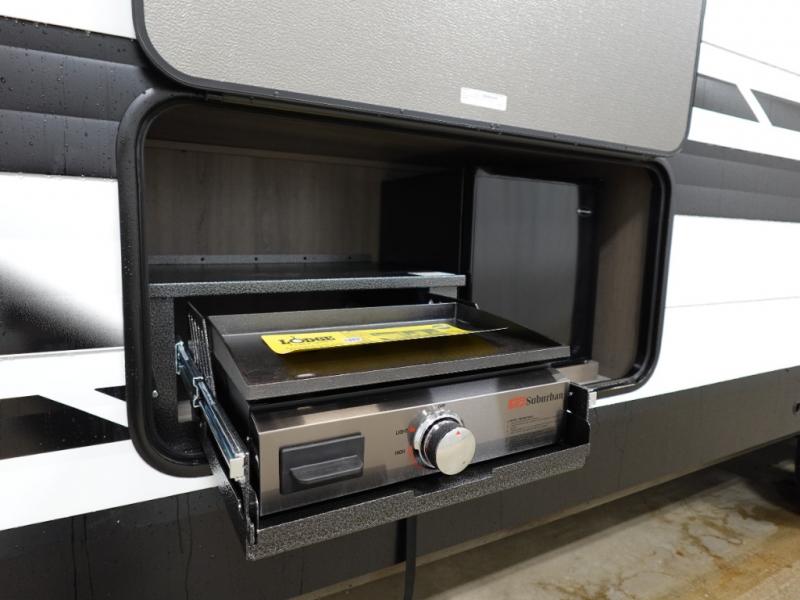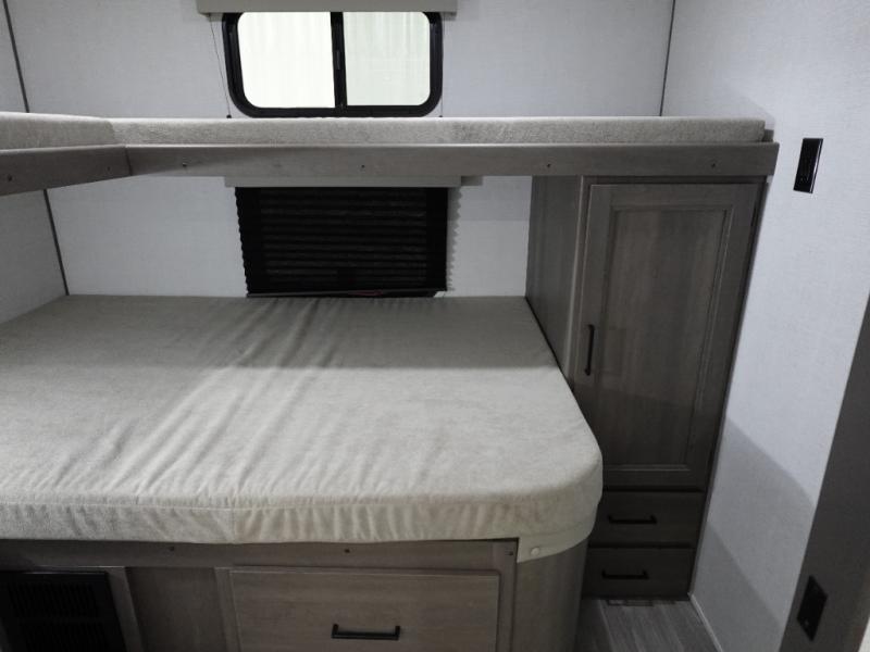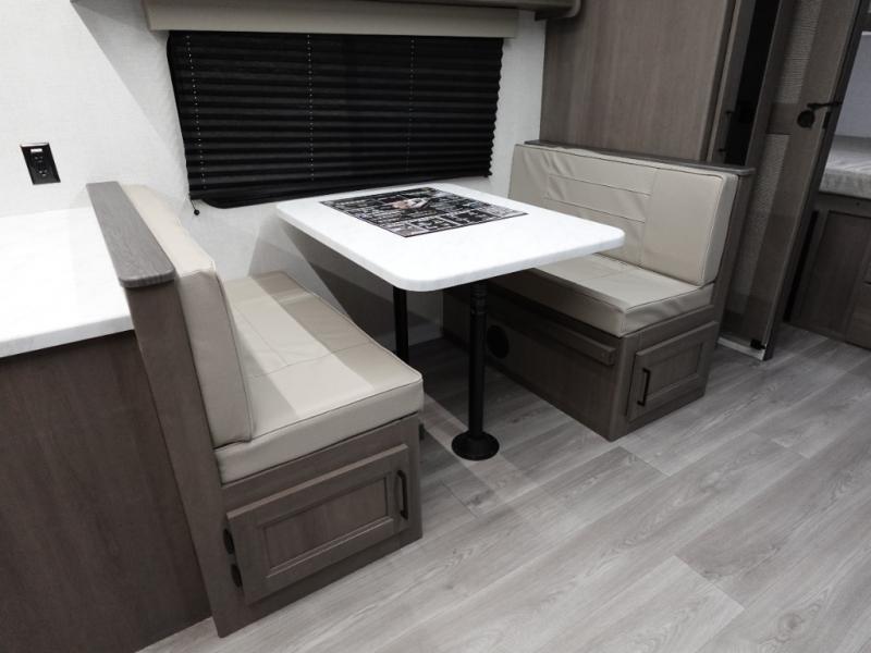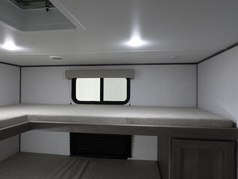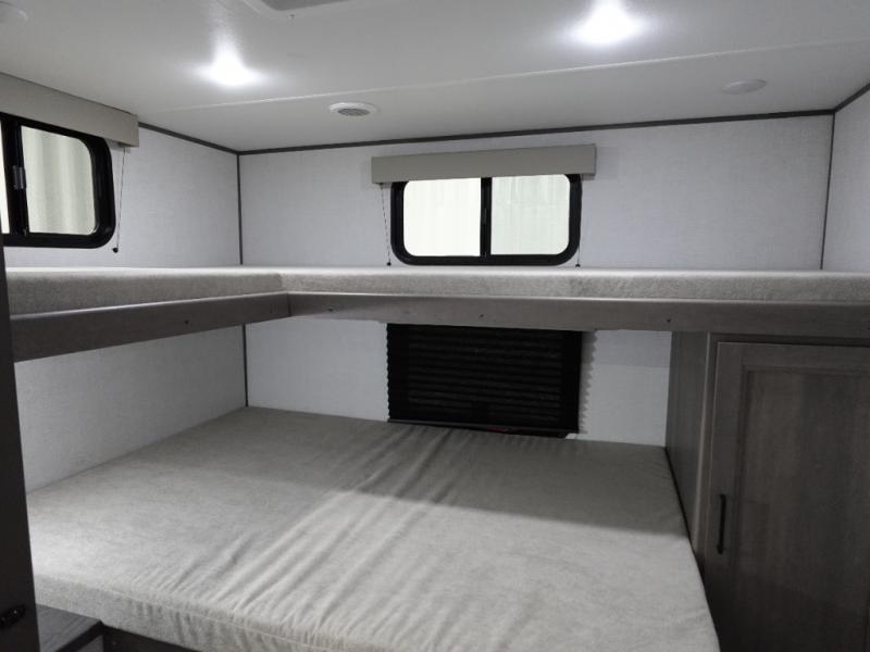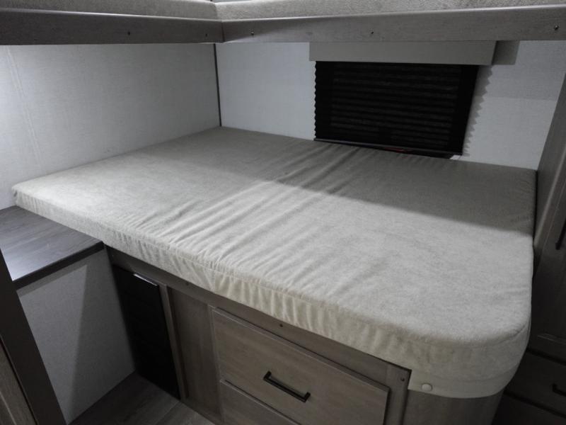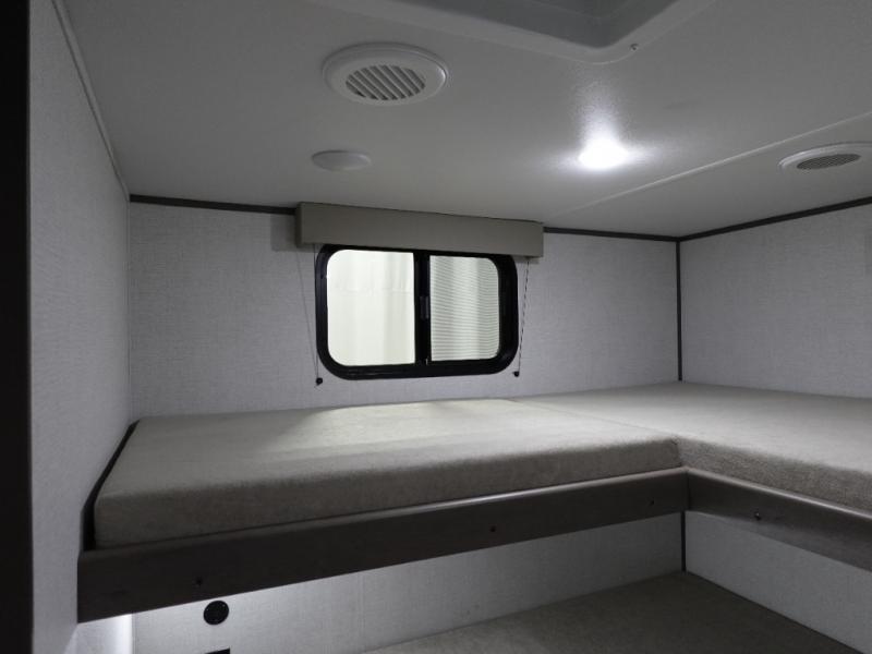 You're going to love every minute spent in this Transcend travel trailer! Your guests or the little ones will have the rear bunkhouse all to themselves that includes a residential full-size bed and two bunks, storage drawers, and TV prep if you want to add a television here. You'll enjoy your own space up front in the private bedroom with a queen bed, storage drawers, and TV prep here also. The combined kitchen and living area includes a sleeper sofa with theater seating, a booth dinette where you can dine together, and a 32" TV for movie nights! The exterior is just as accommodating with its 20' awning, rear storage, plus exterior griddle and refrigerator!